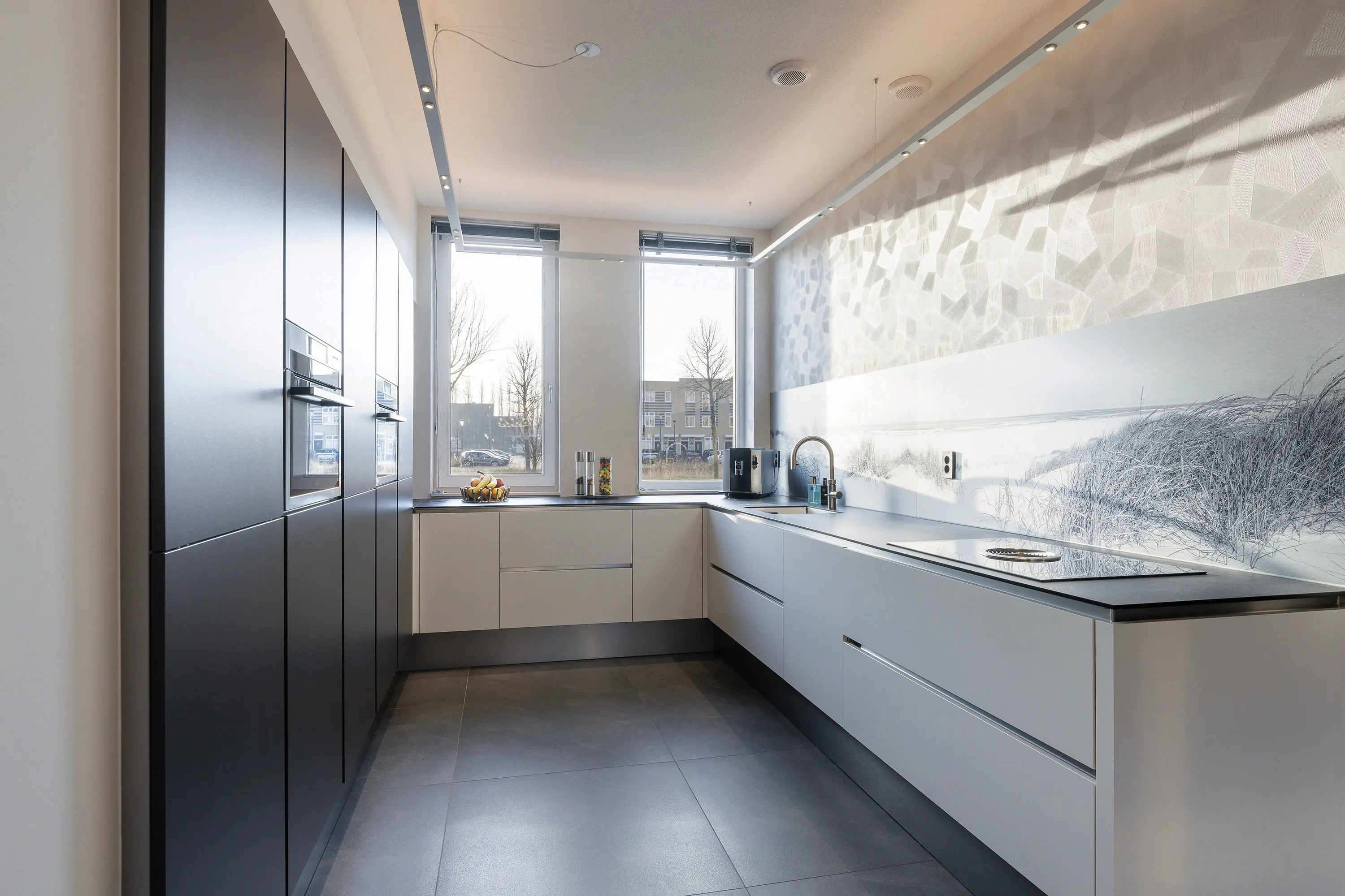 Aan de andere kant bevinden zich de spoelbak met Quooker (2023) en inductie kookplaat (Bora) met geïntegreerde afzuiging. De dubbele raampartij zorgen ervoor dat er veel daglicht de keuken binnenvalt.