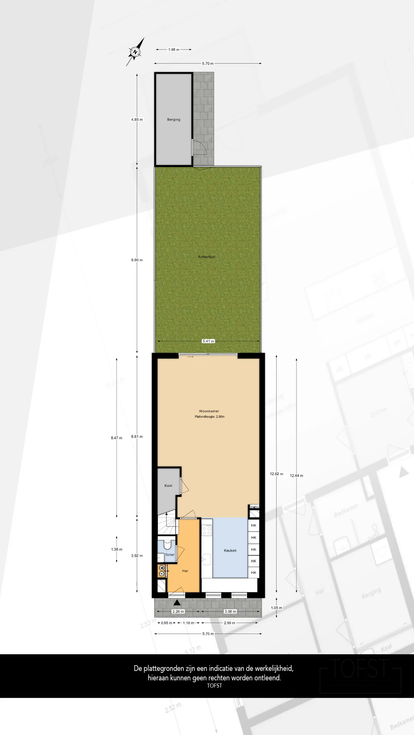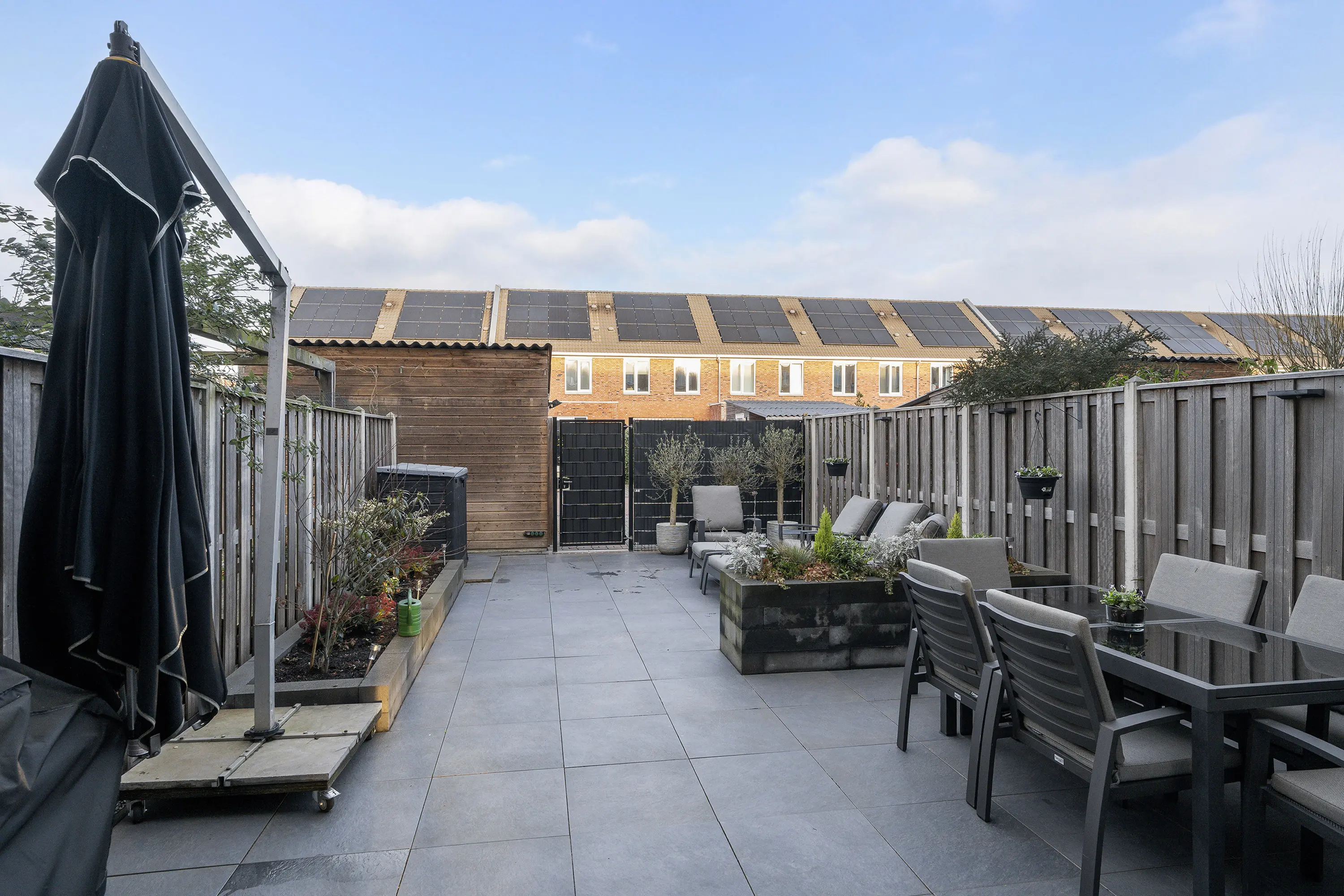 - Diepe achtertuin op het noordwesten met ruime, houten berging en achterom;