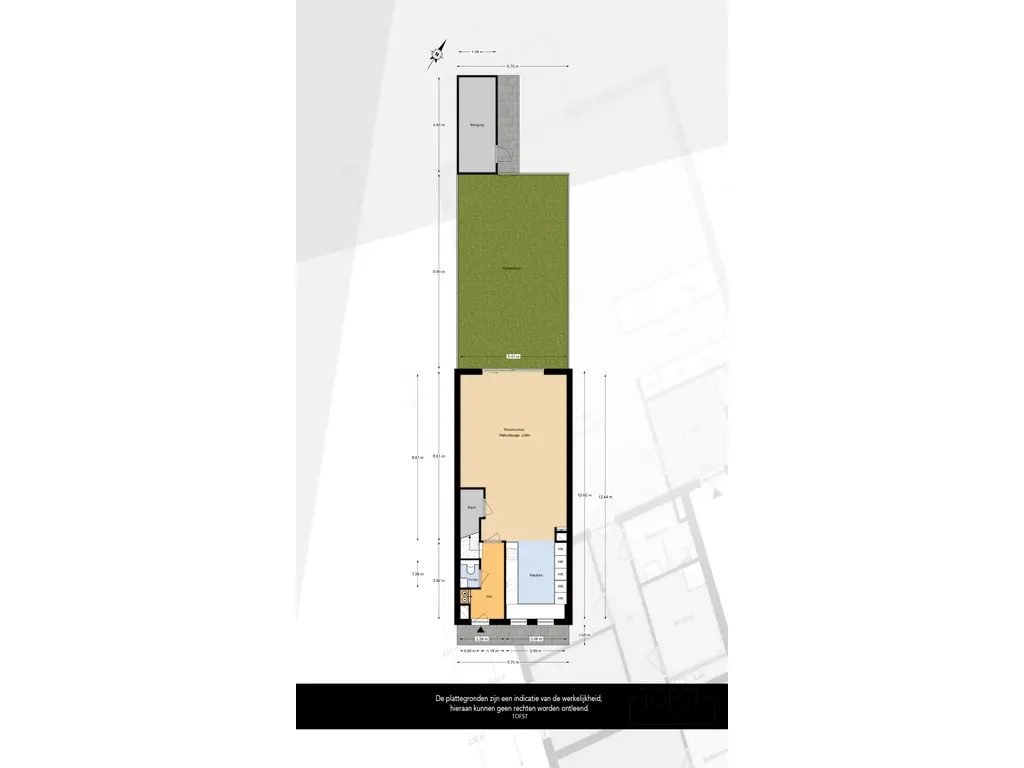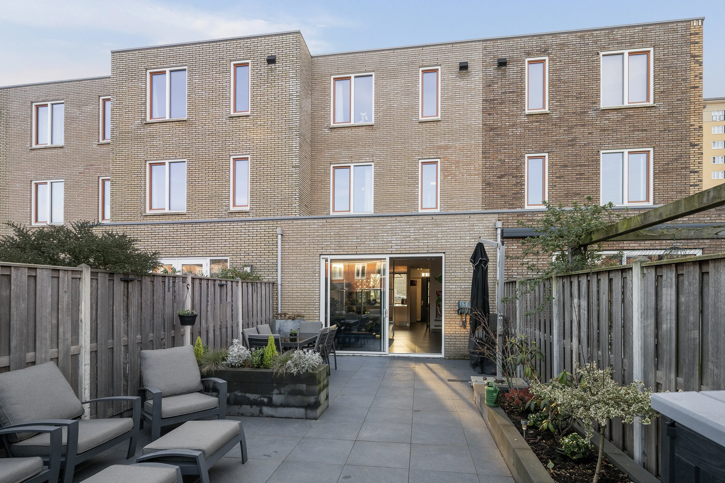 Een aluminium schuifpui biedt toegang tot de diepe achtertuin, gesitueerd op het noordwesten. Zelfs met de uitbouw op de begane grond van 2.40 meter blijft er een riante tuin over, waar u heerlijk buiten kunt zitten in alle privacy.