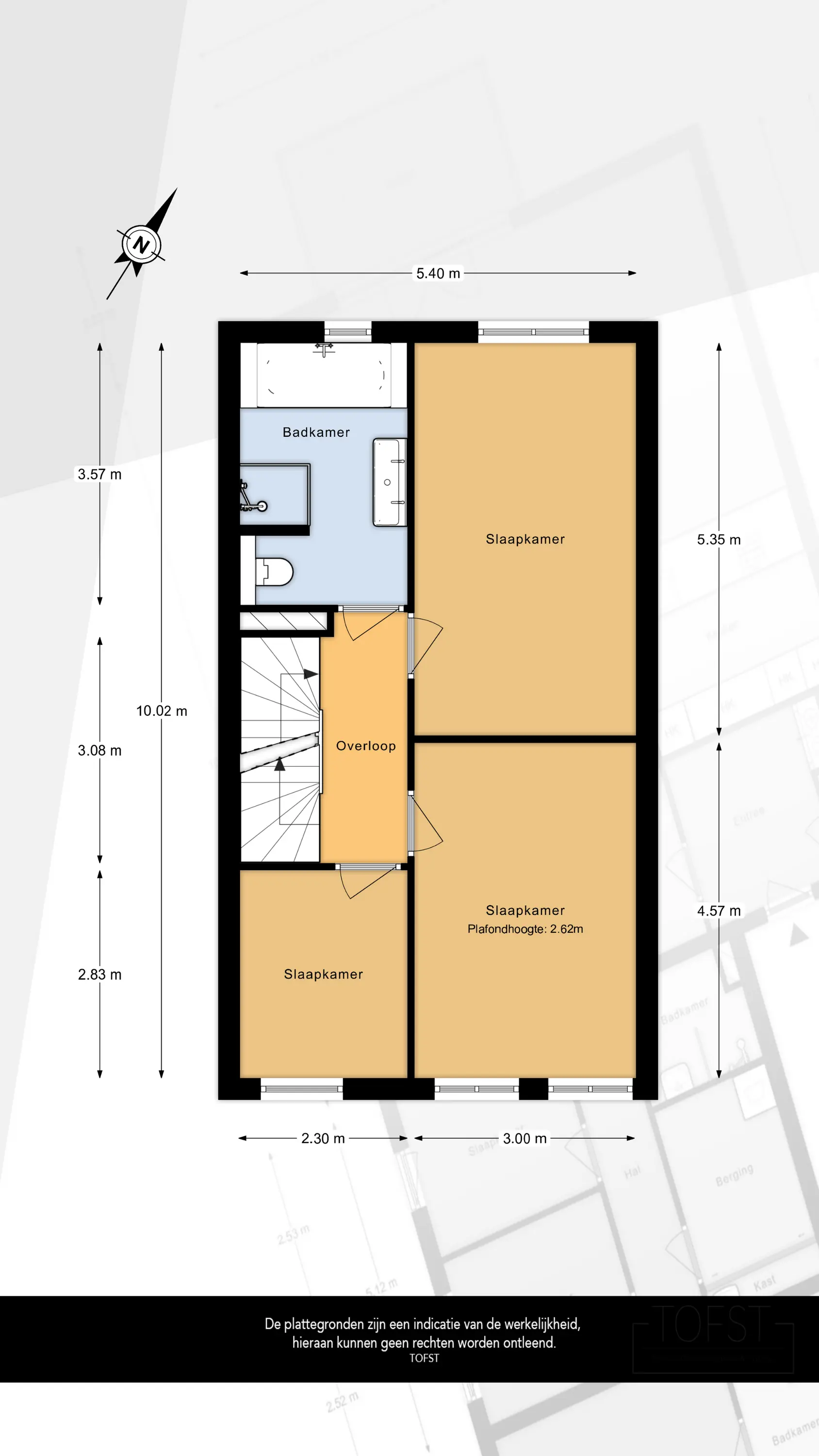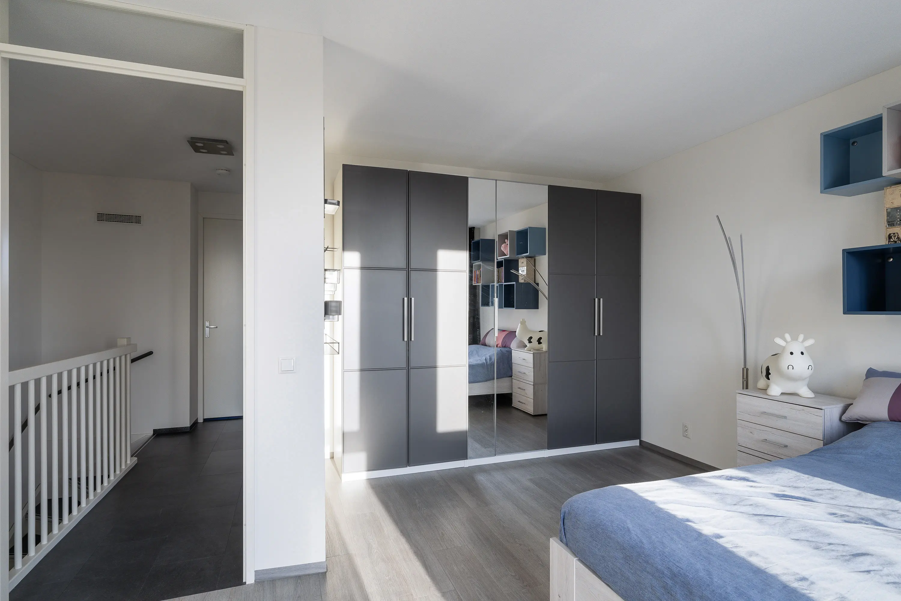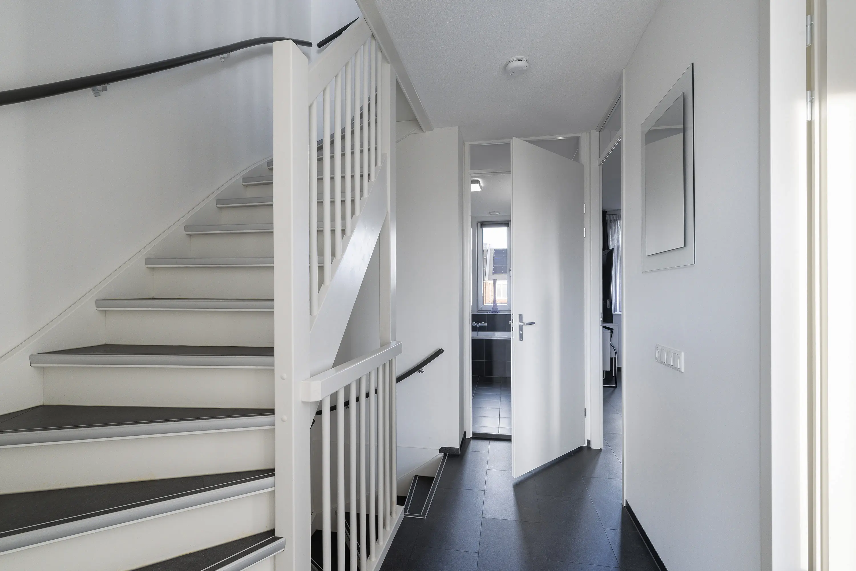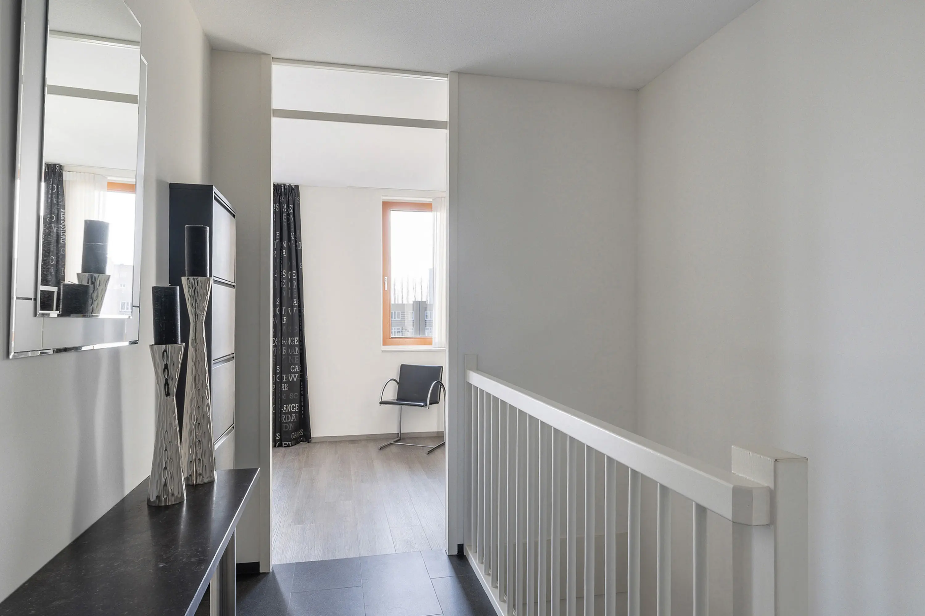 Overloop met toegang tot de vertrekken. Op deze verdieping bevinden zich drie (slaap-)kamers en een compleet ingerichte badkamer.