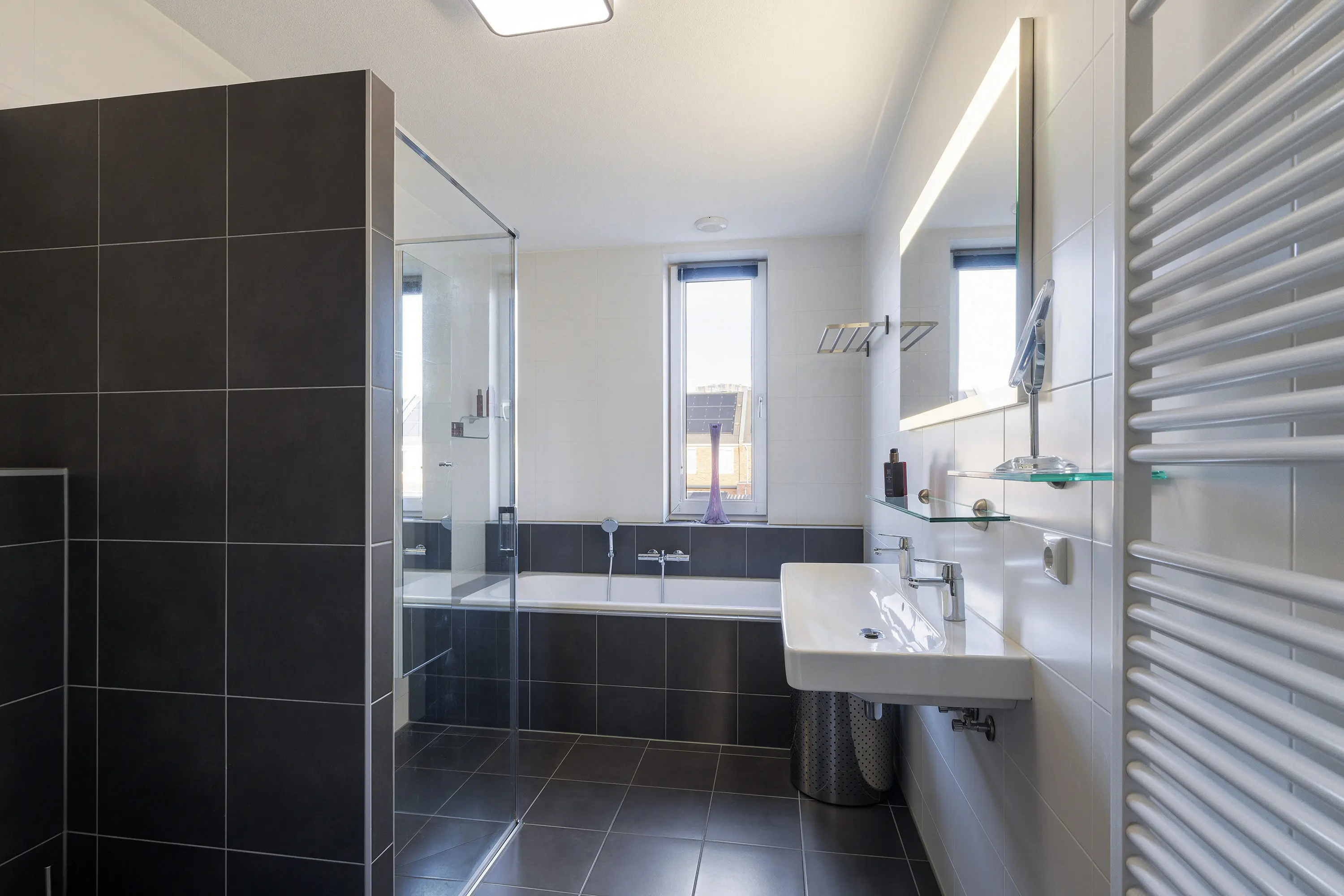 Een designradiator zorgt, samen met de aanwezige vloerverwarming, voor een aangename temperatuur.