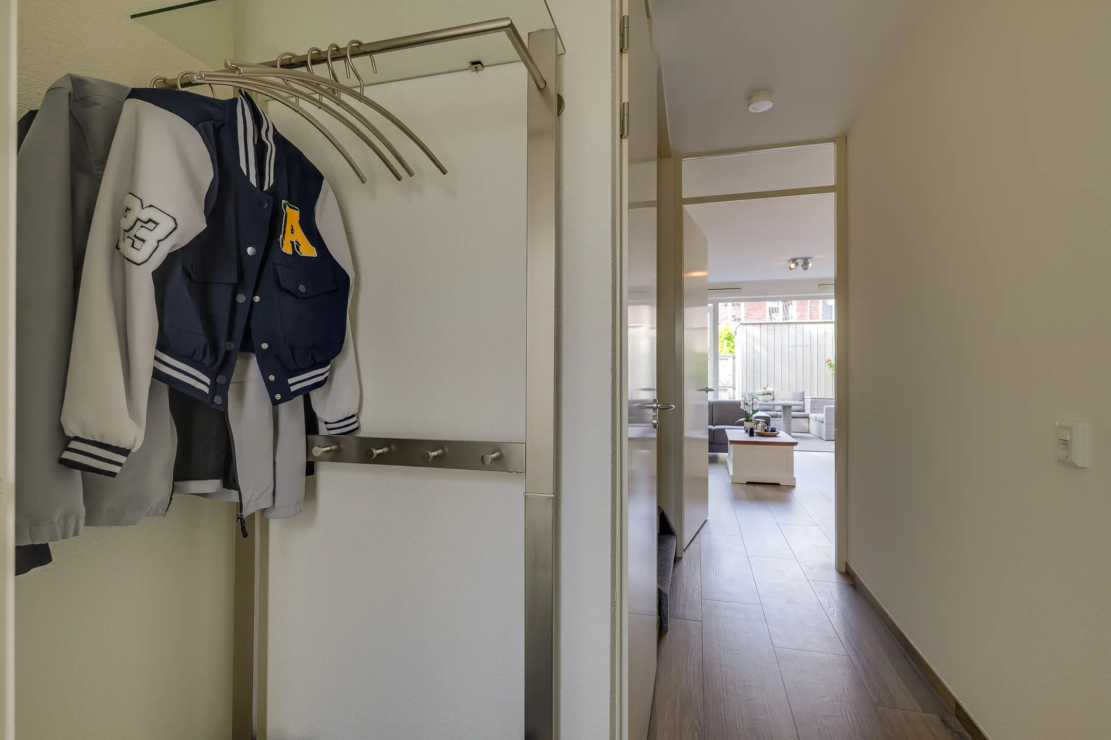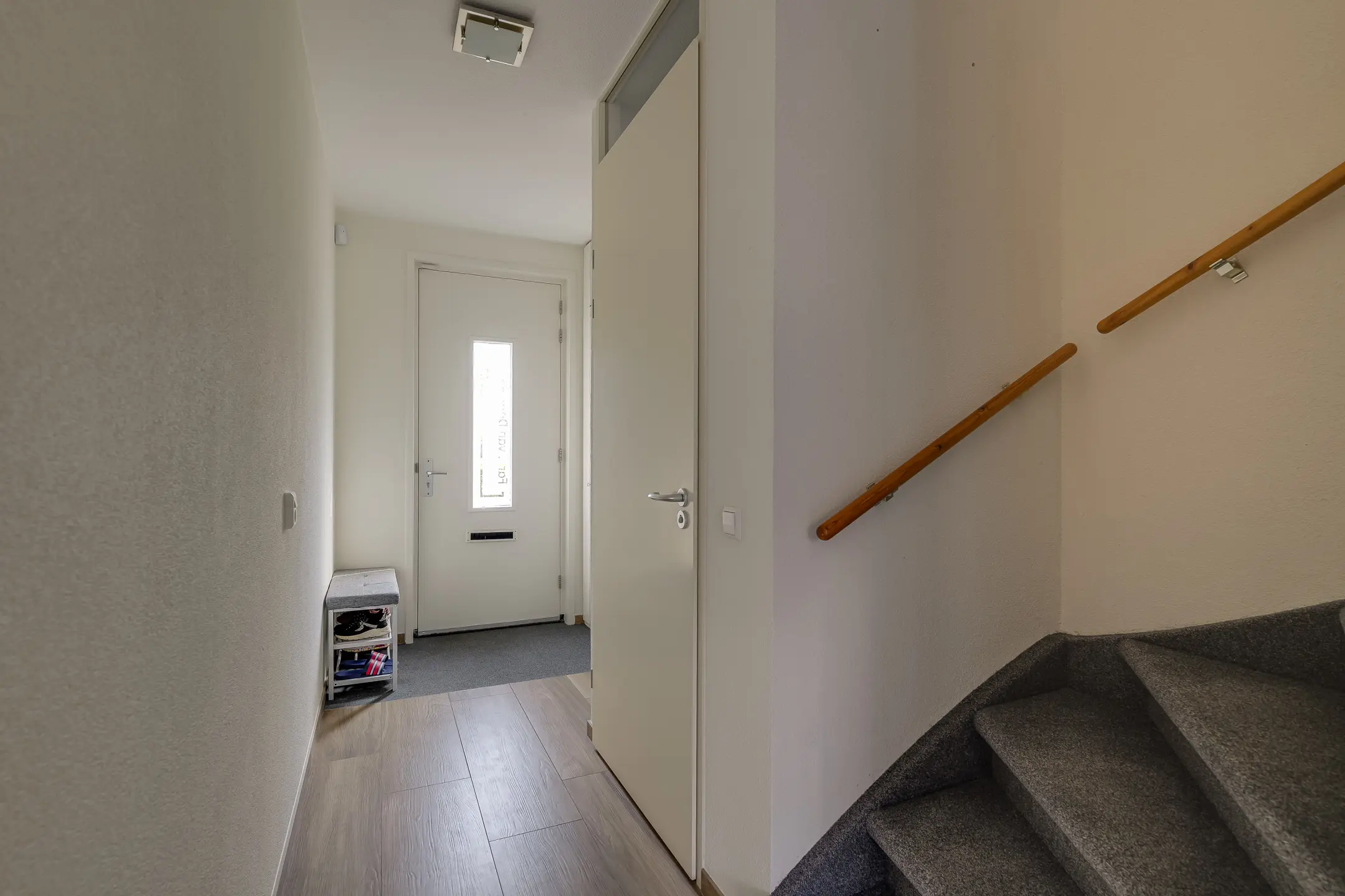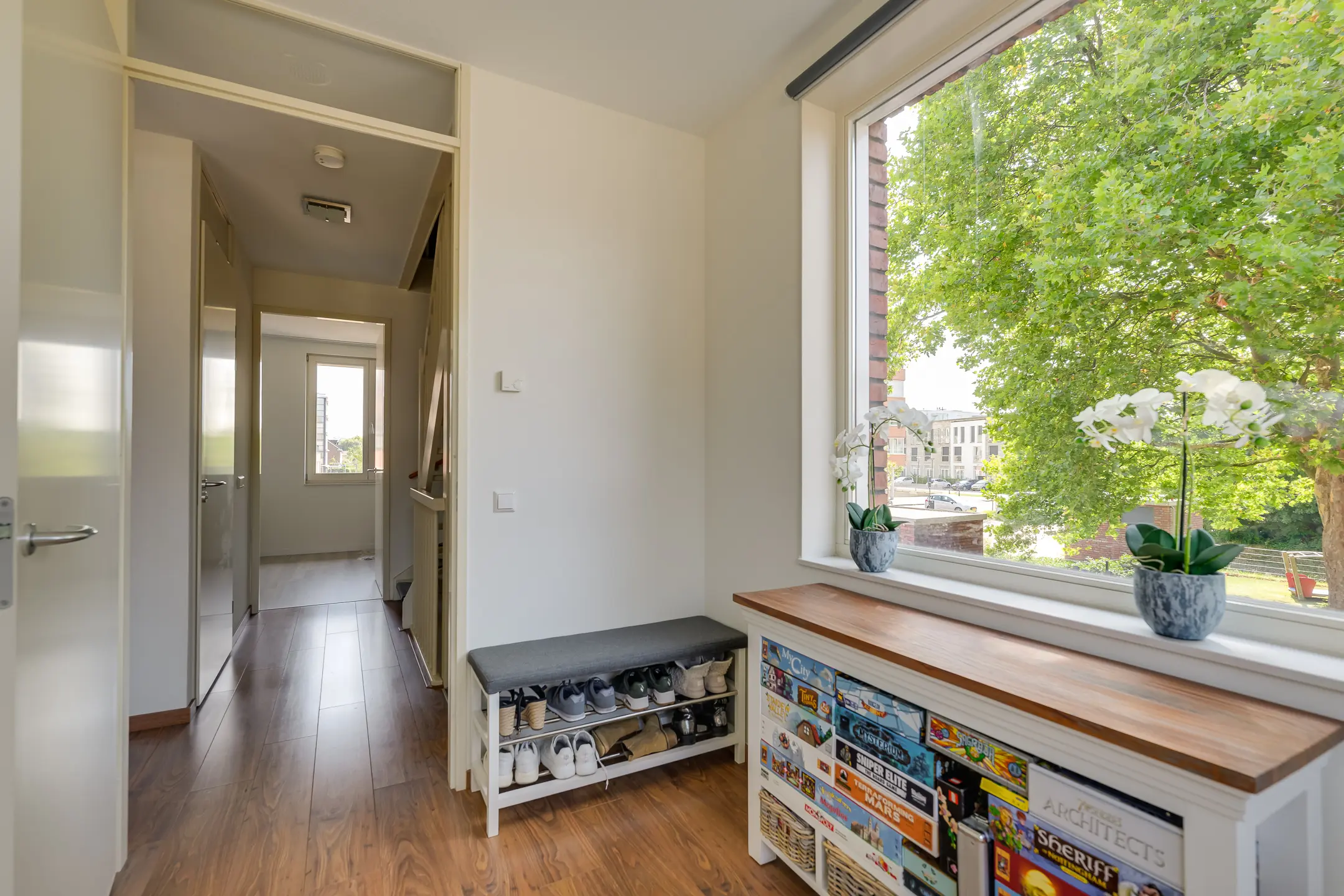 Via de verzorgde voortuin (ca. 25 m²) bereikt u de entree. In de hal bevinden zich de meterkast, een modern toilet met fonteintje, de trapopgang (voorzien van nieuw tapijt in 2020) en toegang tot de woonkamer. De tuingerichte woonkamer heeft veel lichtinval door de openslaande deuren en het grote zijraam en biedt extra bergruimte via een trapkast. De vloer is in 2020 vernieuwd en uitgevoerd in een natuursteen met houtlook.