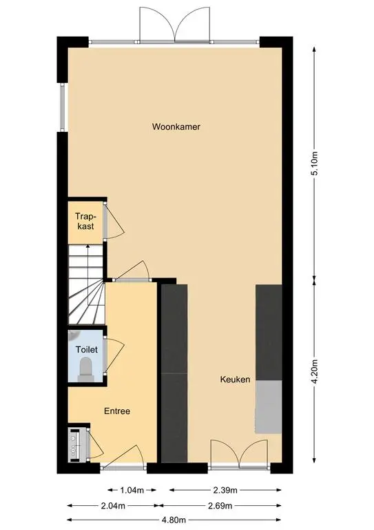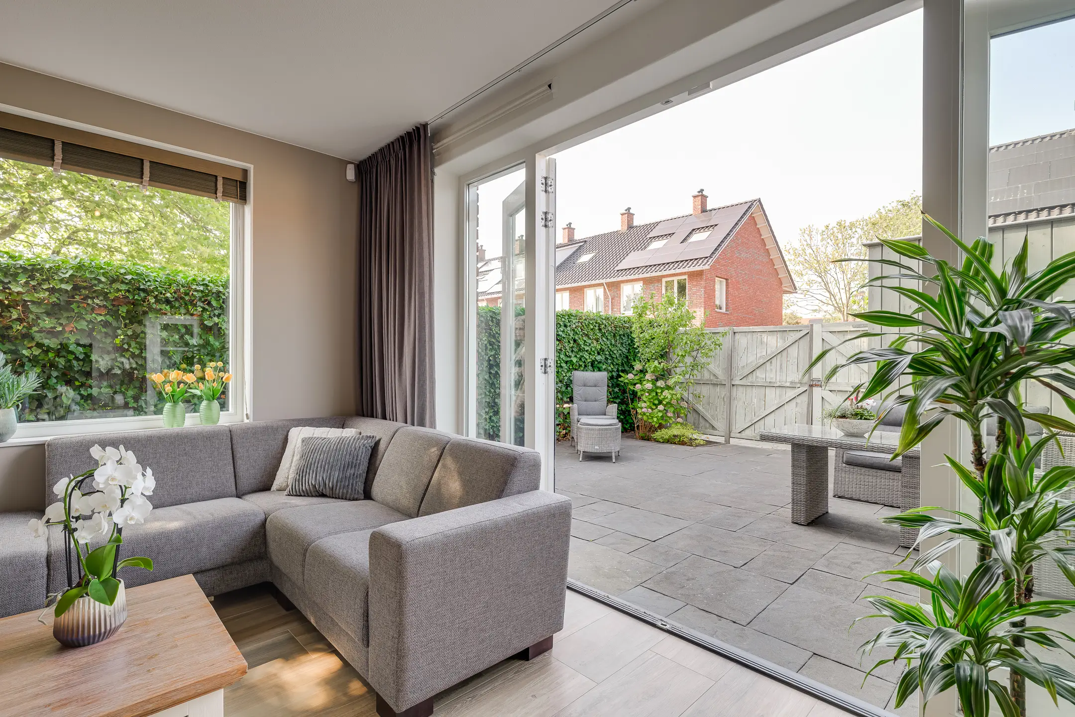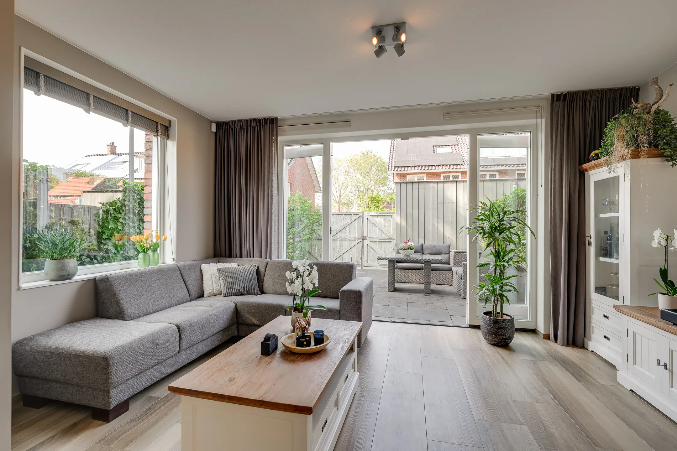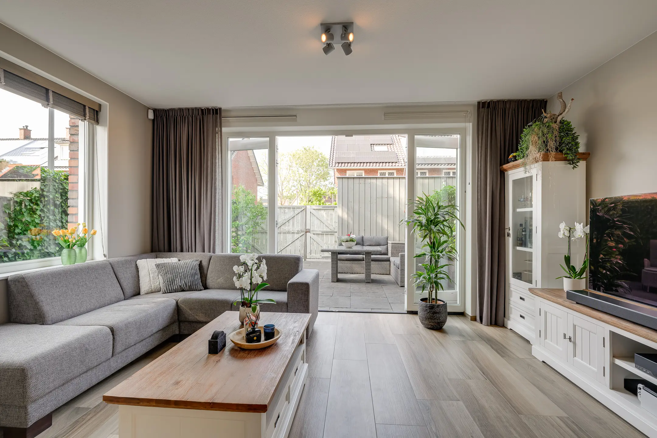 Via de verzorgde voortuin (ca. 25 m²) bereikt u de entree. In de hal bevinden zich de meterkast, een modern toilet met fonteintje, de trapopgang (voorzien van nieuw tapijt in 2020) en toegang tot de woonkamer. De tuingerichte woonkamer heeft veel lichtinval door de openslaande deuren en het grote zijraam en biedt extra bergruimte via een trapkast. De vloer is in 2020 vernieuwd en uitgevoerd in een natuursteen met houtlook.