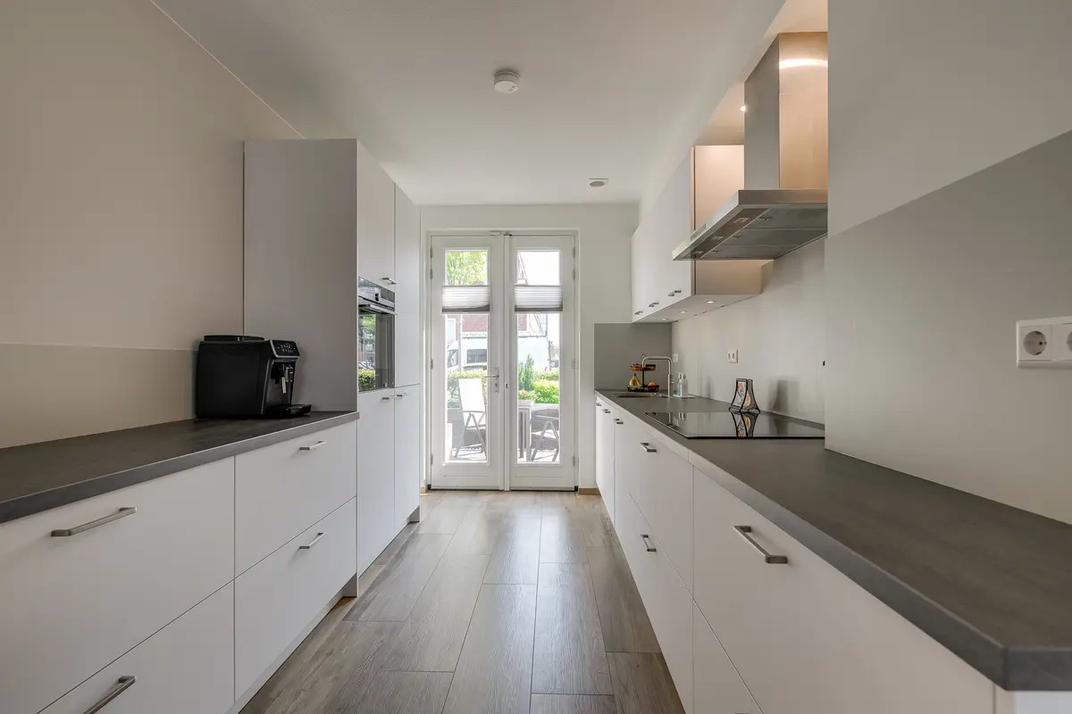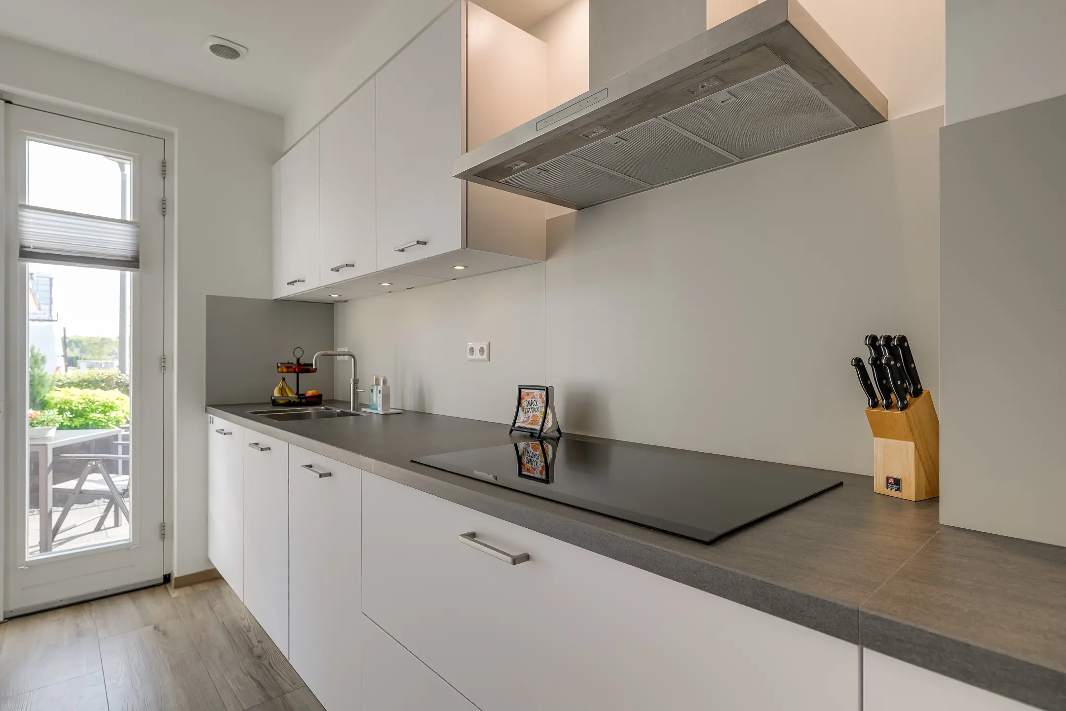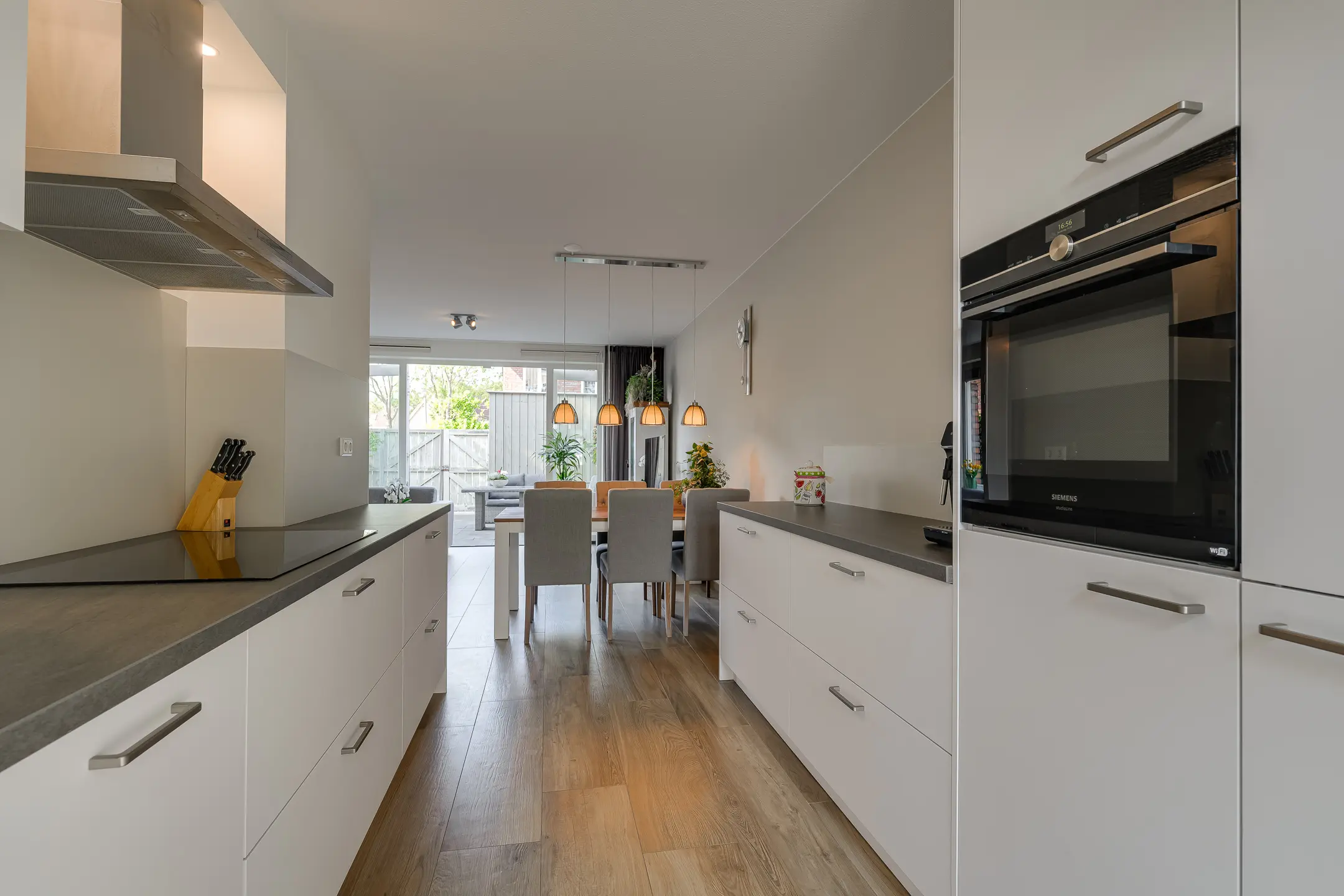 De moderne keuken van Verkade Keukens (2020) is uitgevoerd in lichte tinten, opgesteld in twee wanden en voorzien van hoogwaardige Siemens Studioline-apparatuur: een brede 5-pits inductiekookplaat, afzuigkap met directe afvoer, combi-oven, vaatwasser, extra grote koelkast en vriezer. Een Quooker Cube levert niet alleen kokend water, maar ook gekoeld plat en bruisend water. Vanuit de keuken leiden openslaande deuren naar de zonnige voortuin (zuid).