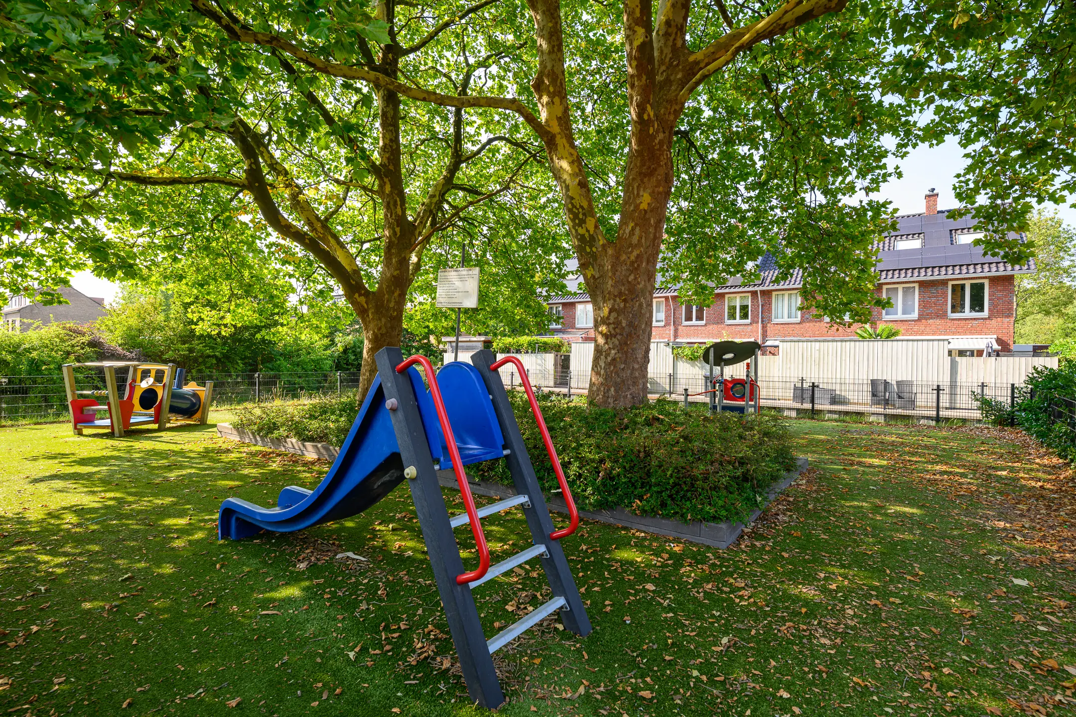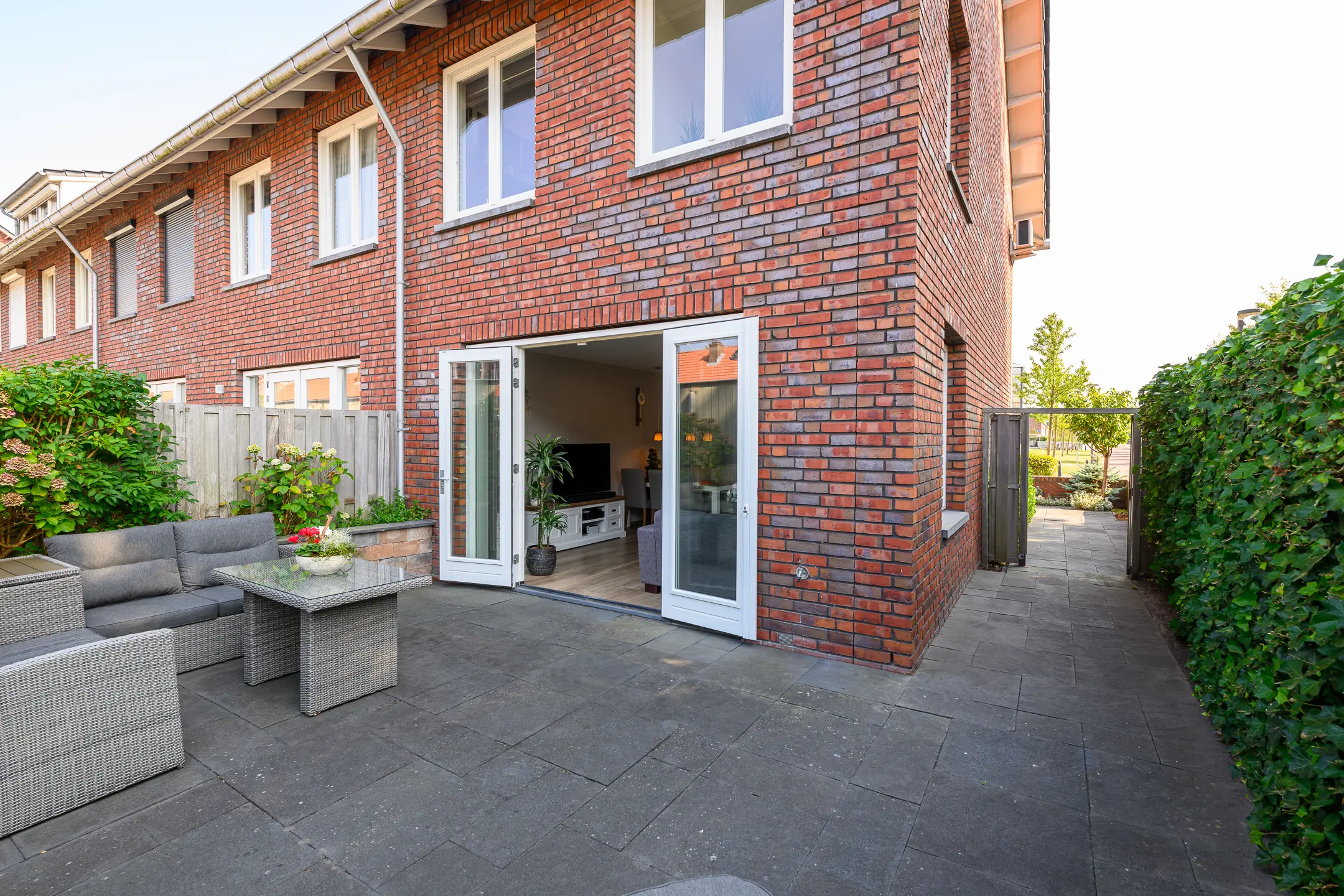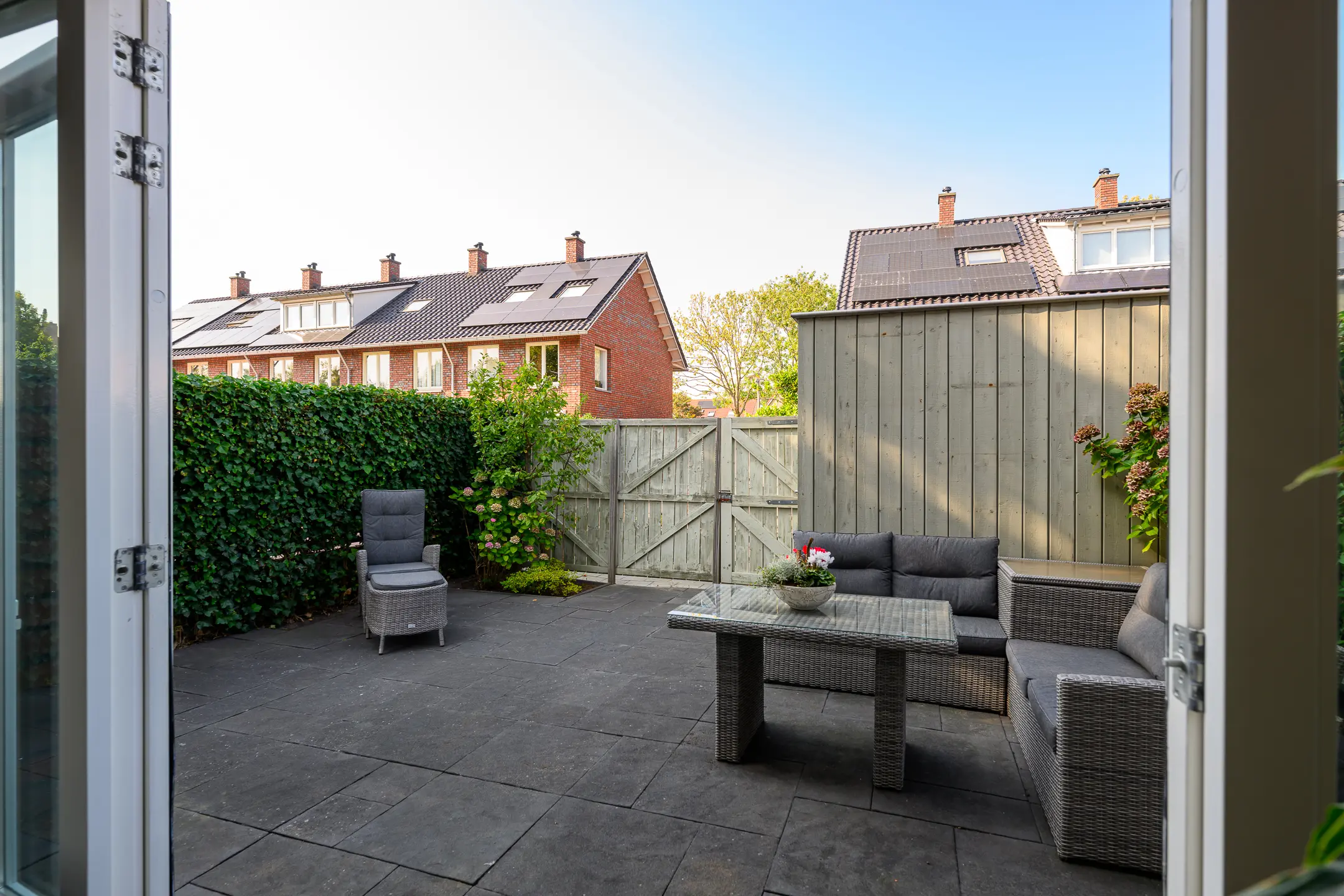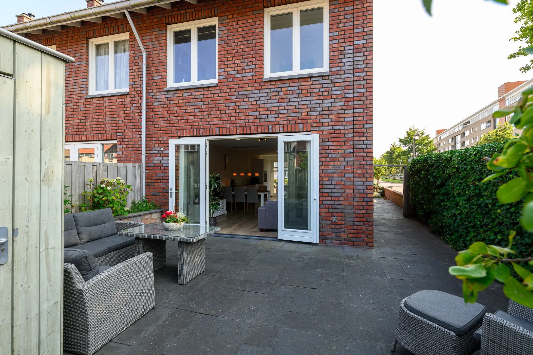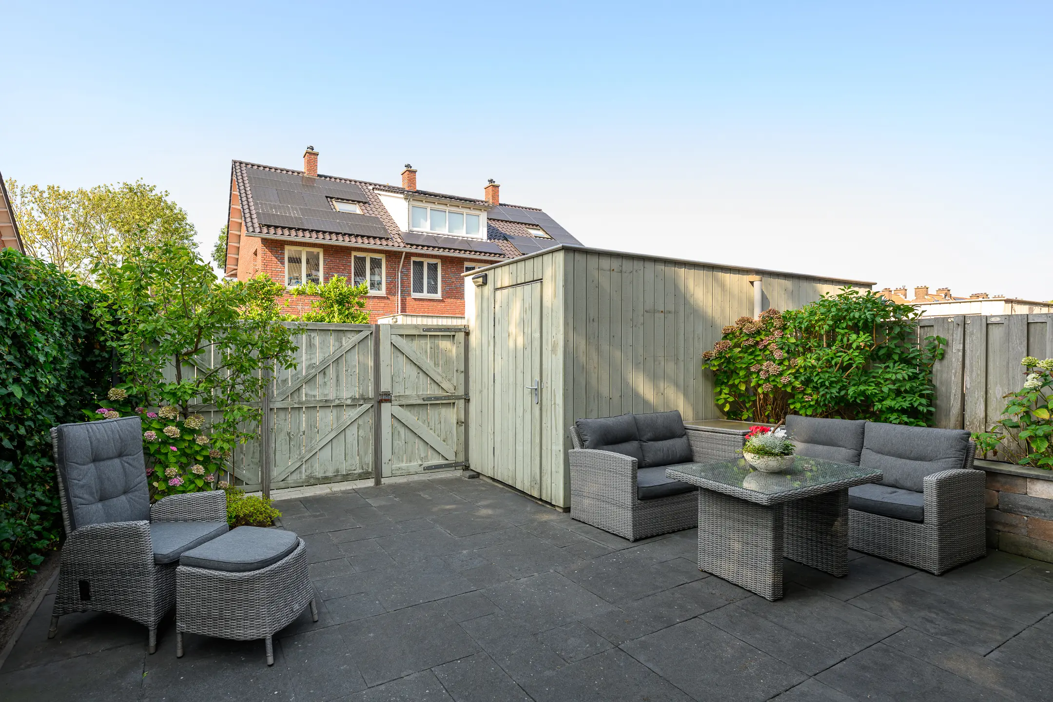 De achtertuin van ca. 50 m² is vrijwel volledig bestraat en onderhoudsvriendelijk ingericht. Dankzij de noordwestligging geniet u hier in de middag en avond van de zon. Achterin bevindt zich een houten berging met elektra en via de zijgevel is er een achterom.