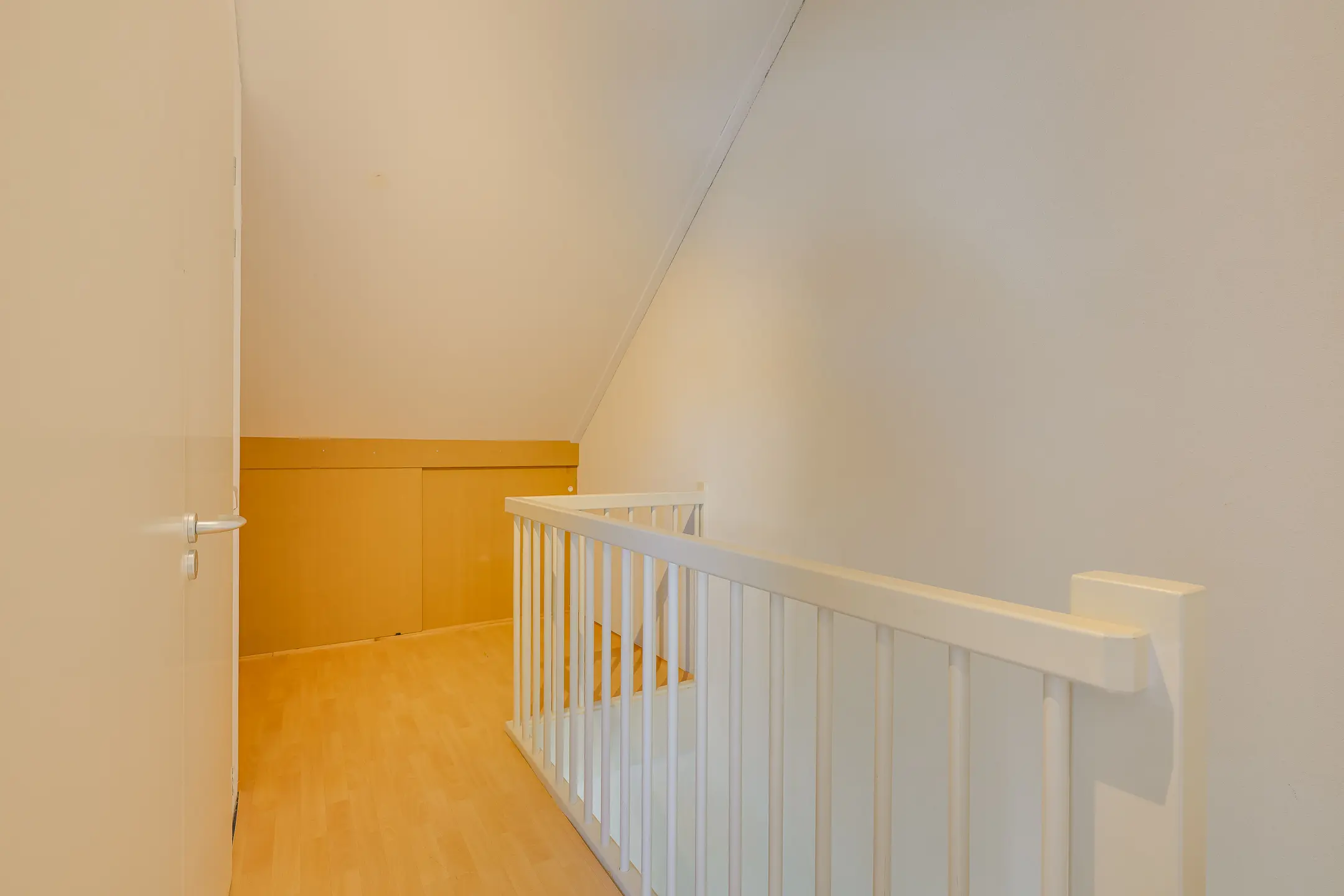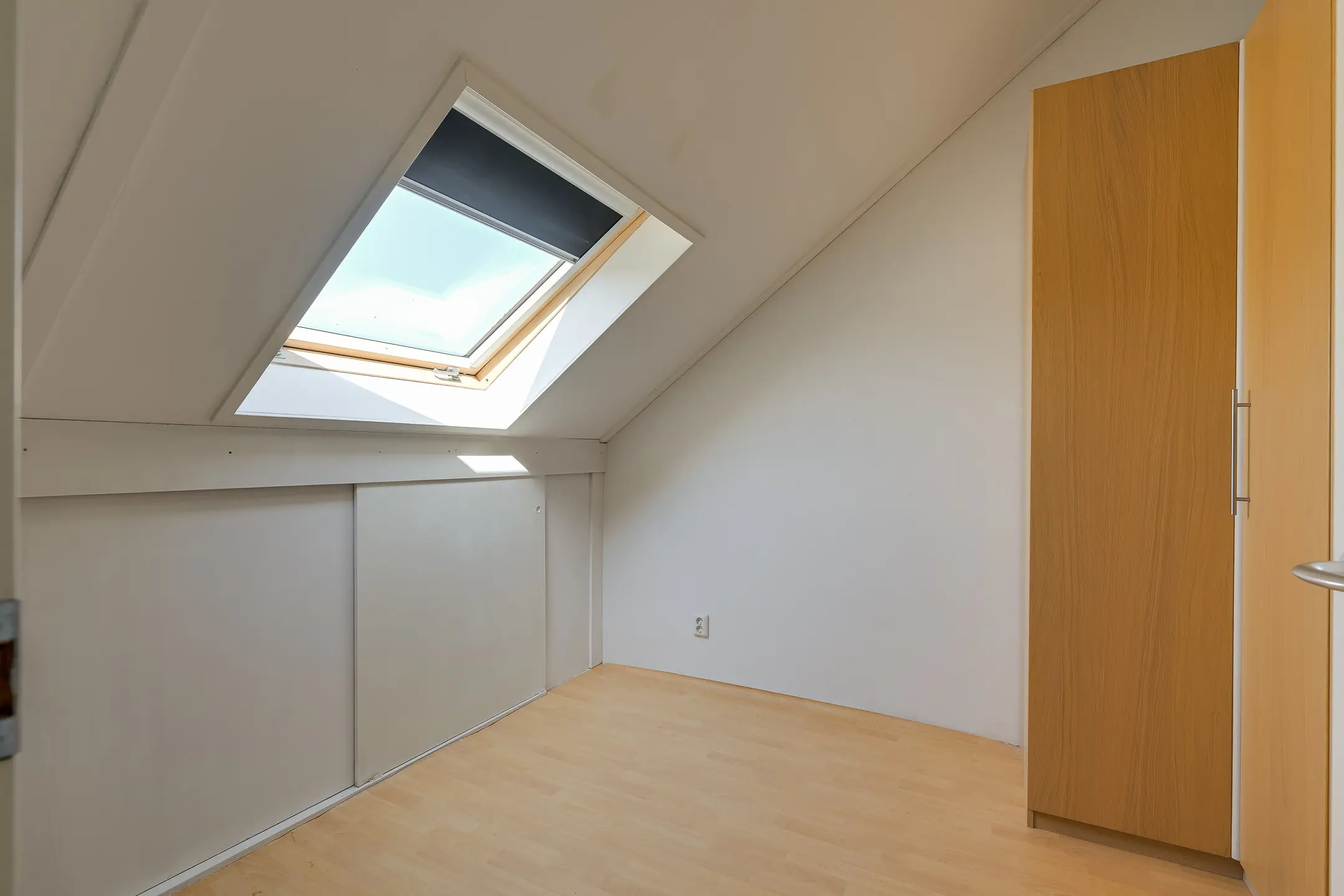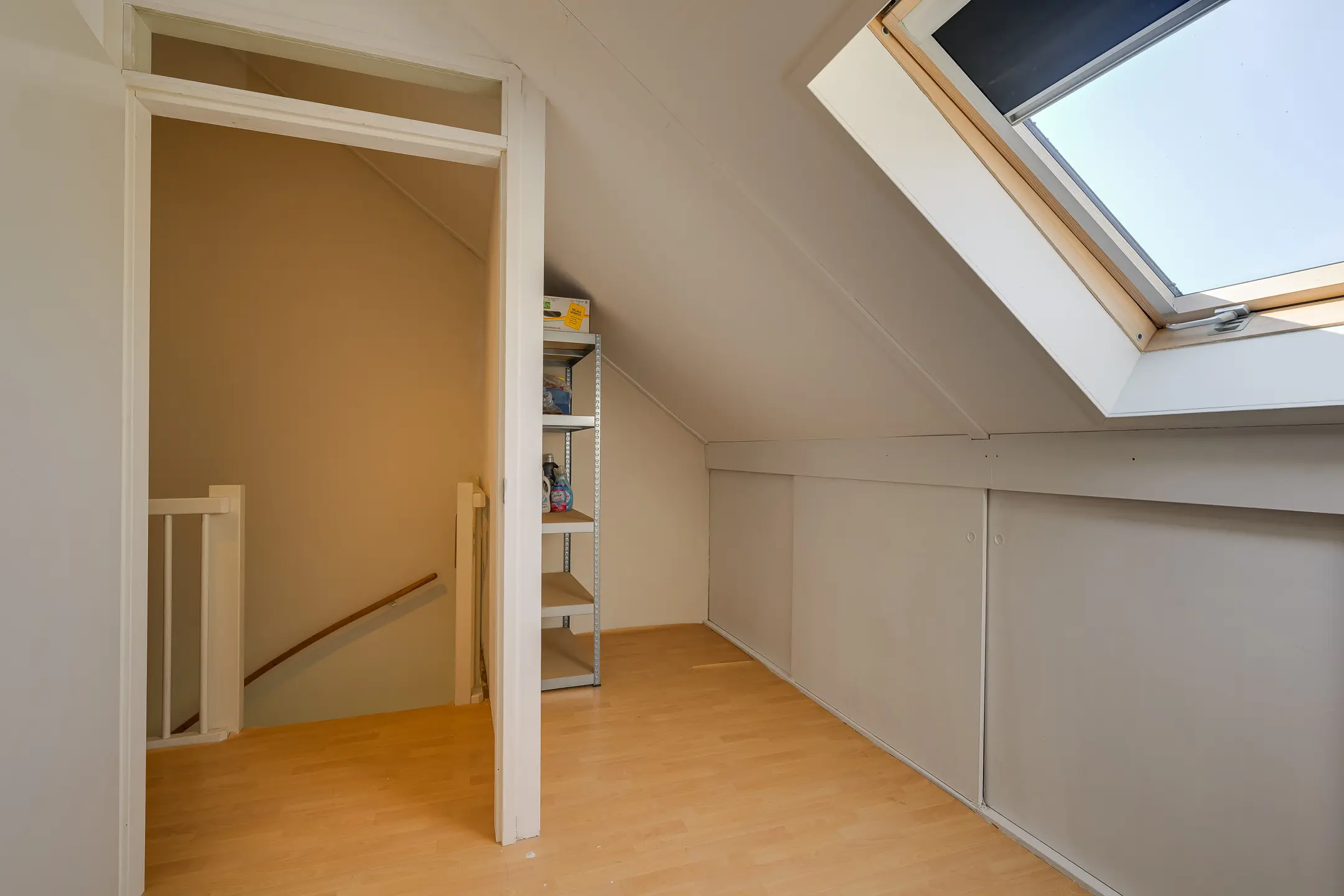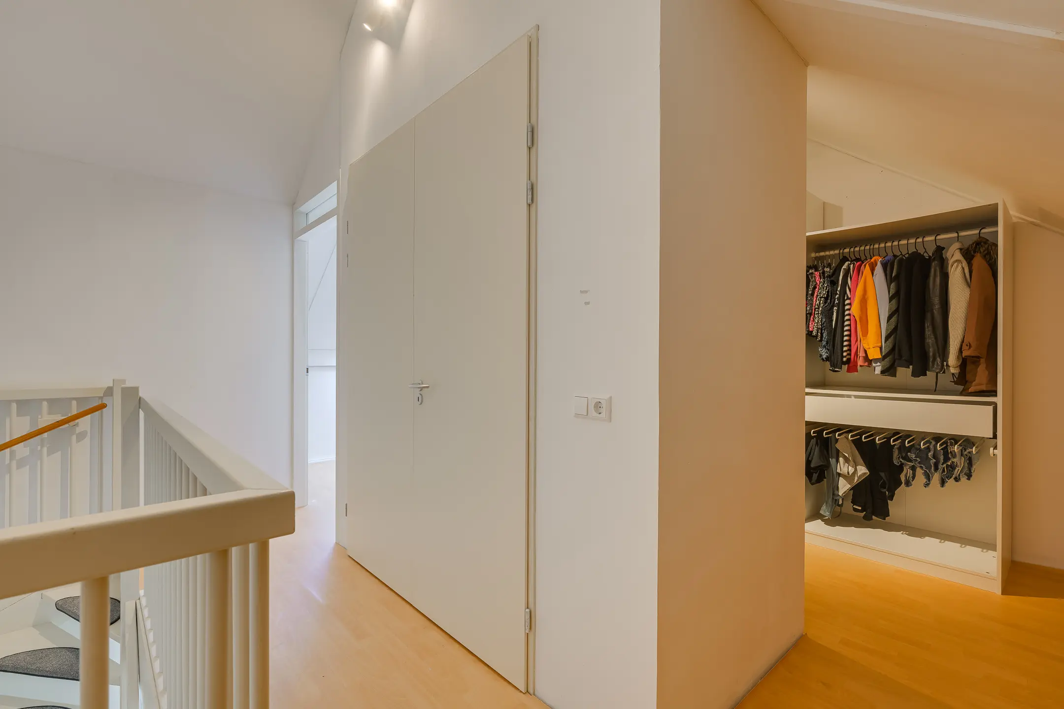 Via een vaste trap bereikt u de tweede verdieping. Aan de achterzijde is een ruime slaapkamer met kunststof vloer, dakraam met verduistering en bergruimte achter de knieschotten. Met een dakkapel kan deze kamer nog verder worden vergroot. Op de overloop bevindt zich de technische ruimte met de warmtepomp, ventilatie-unit en aansluitingen voor wasmachine en droger. Aan de voorzijde is een royale inloopkast gecreëerd.