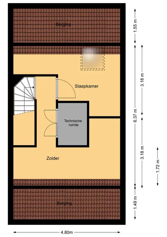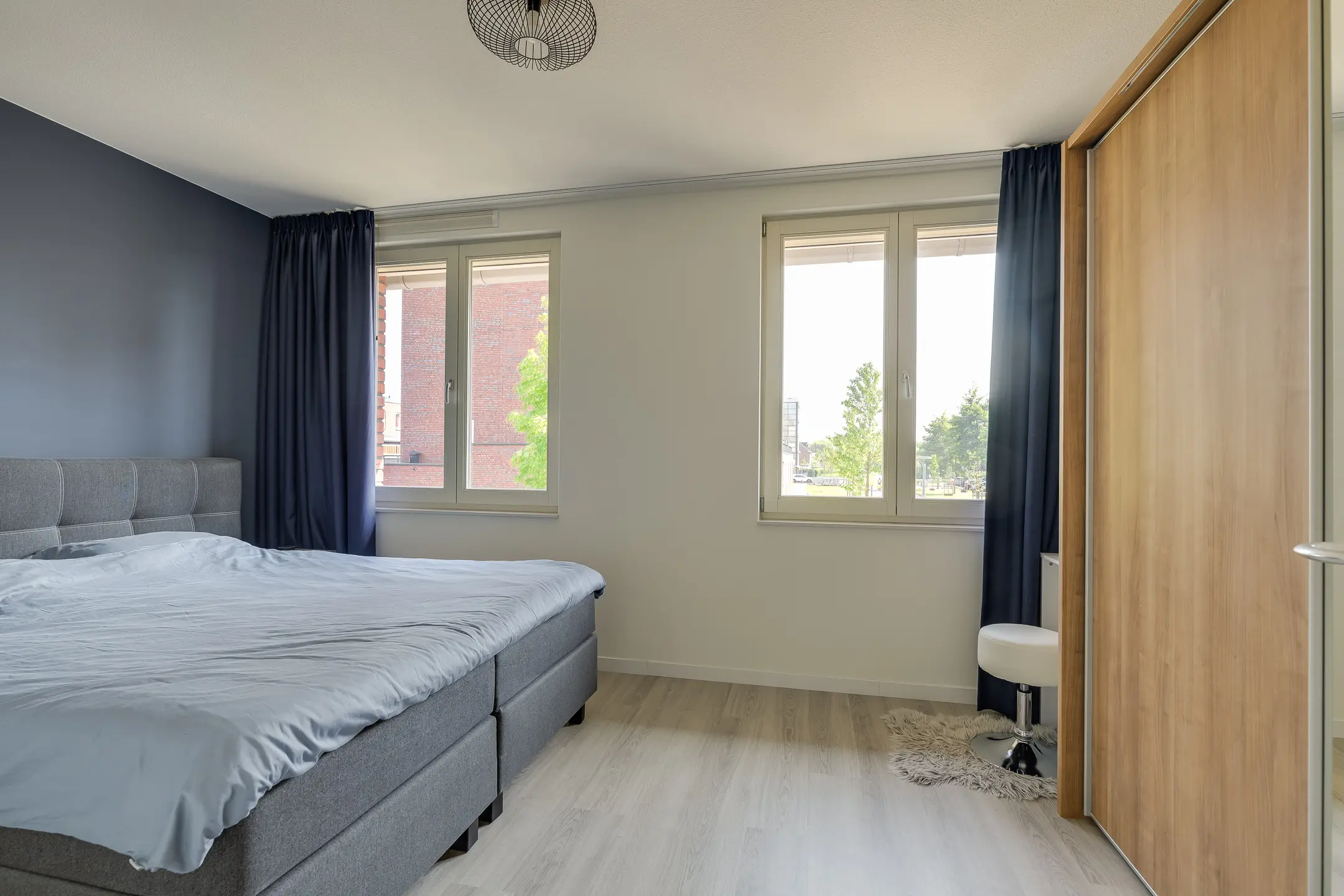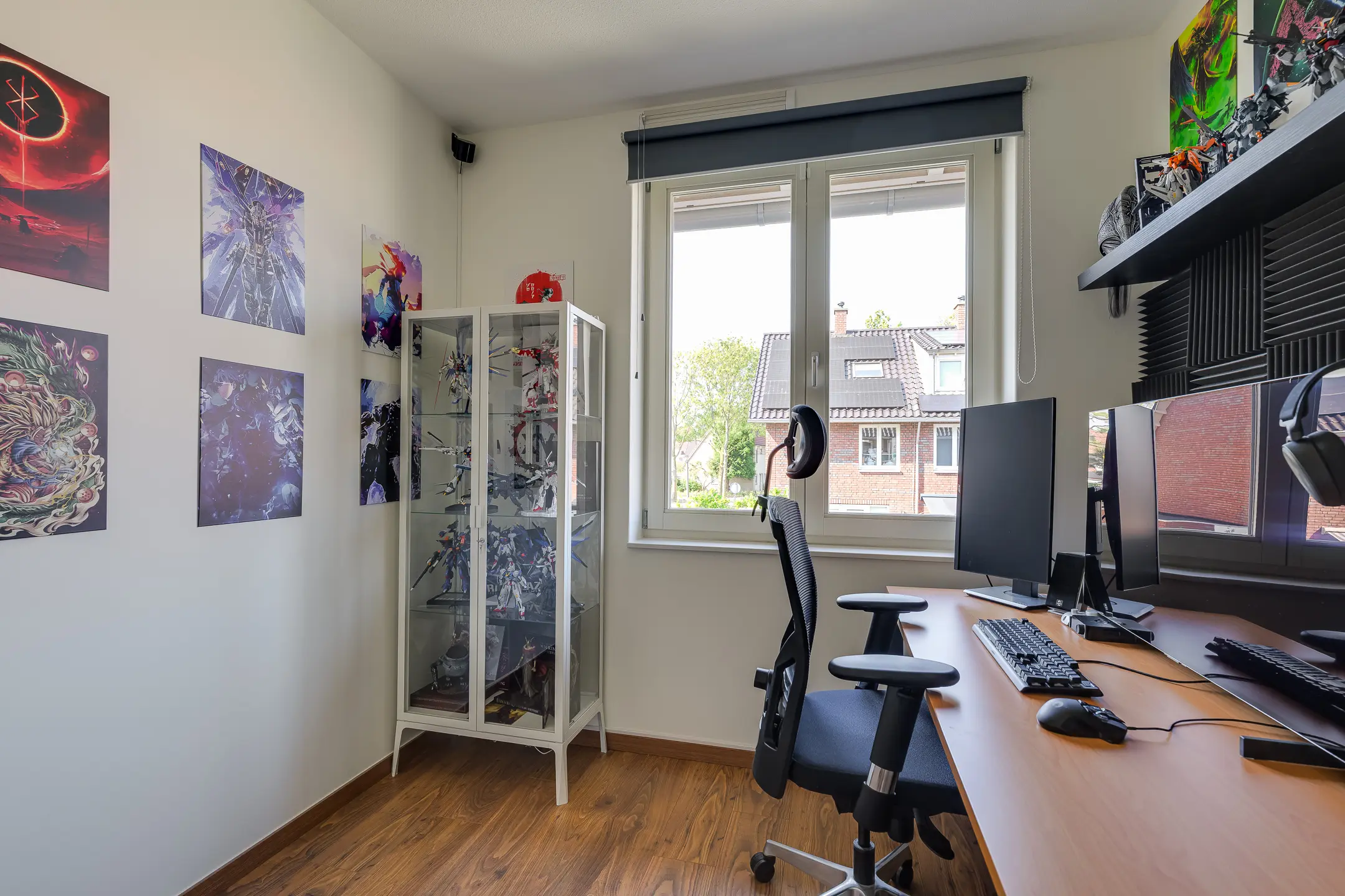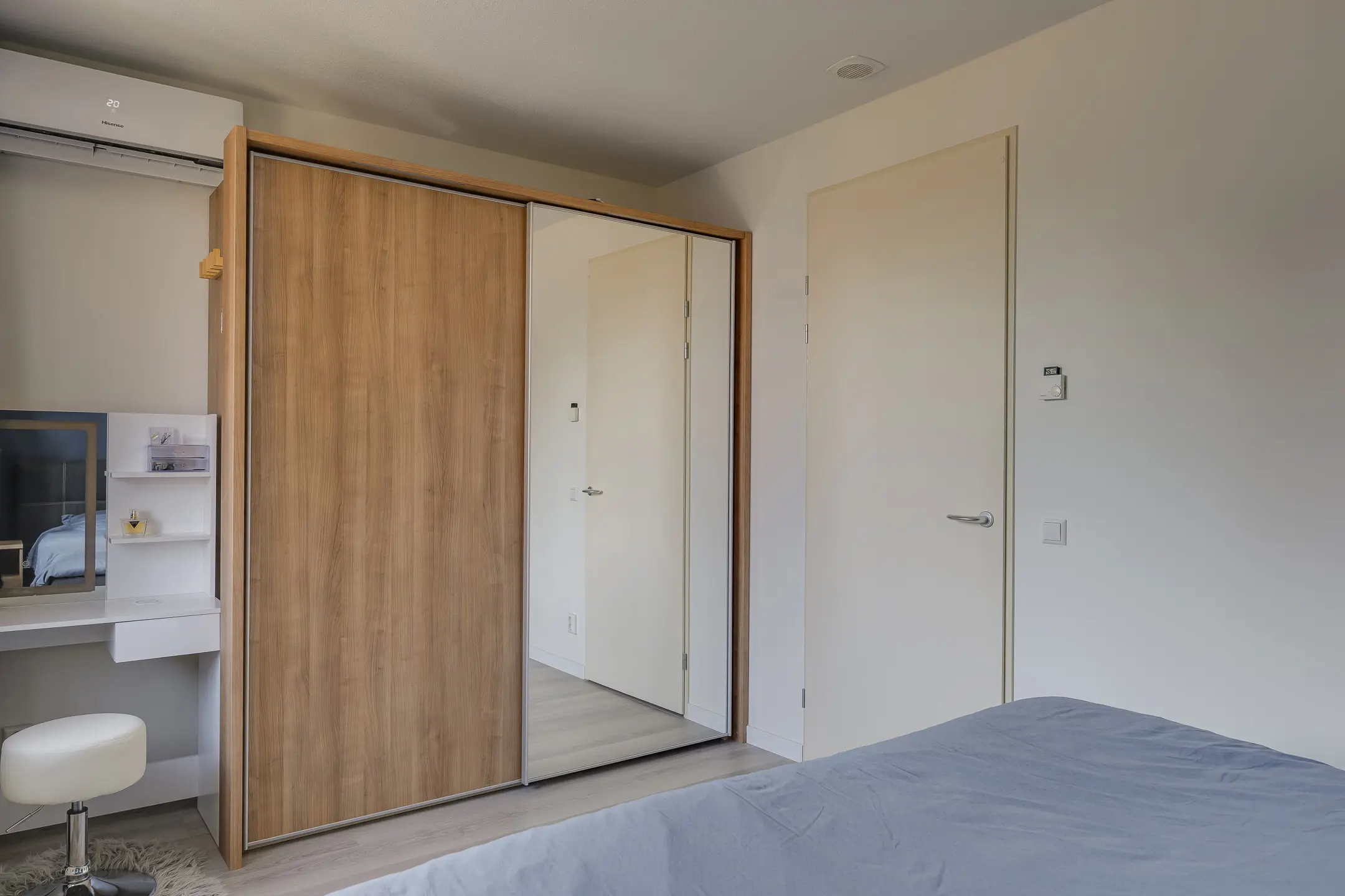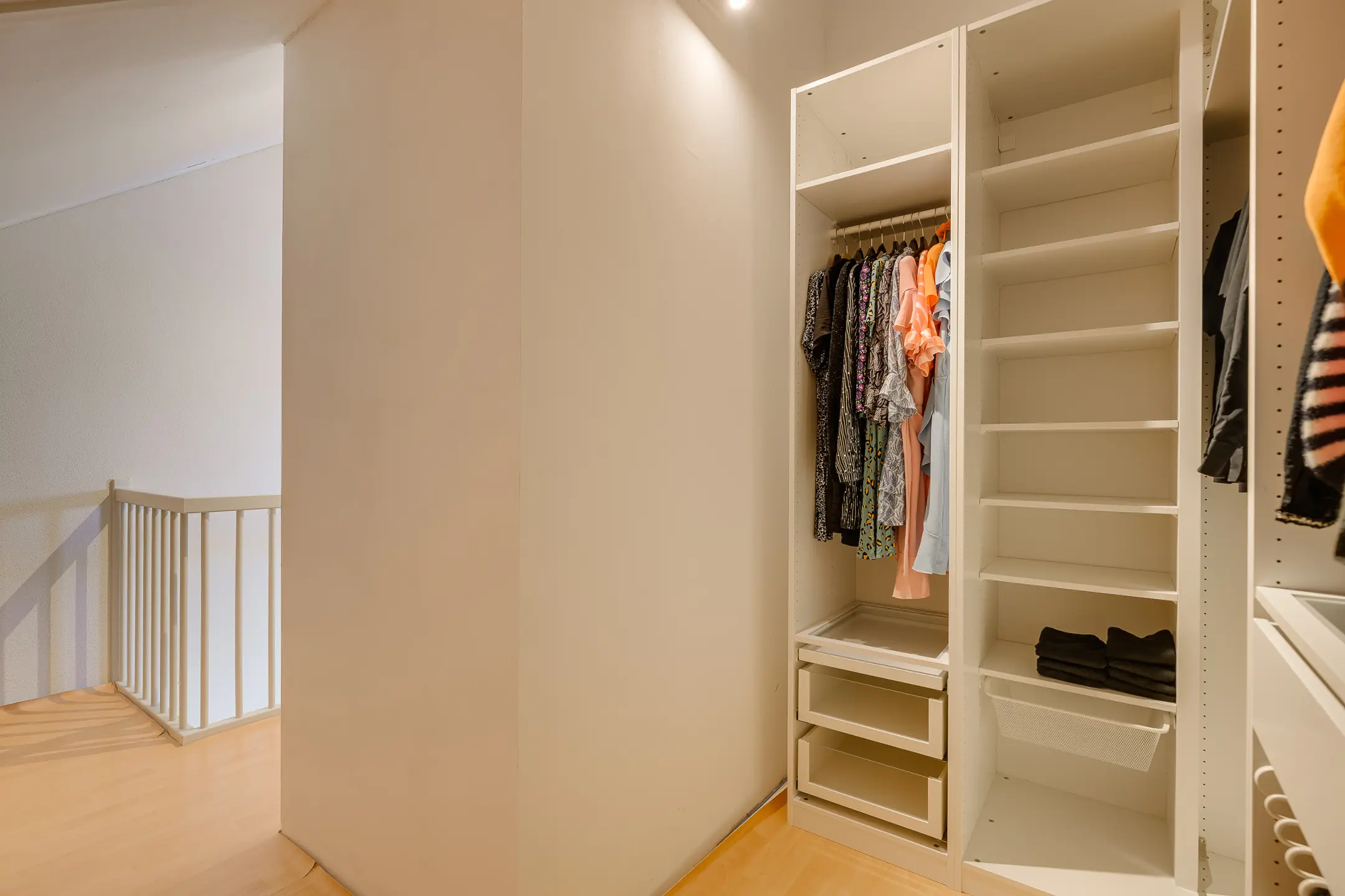 Via een vaste trap bereikt u de tweede verdieping. Aan de achterzijde is een ruime slaapkamer met kunststof vloer, dakraam met verduistering en bergruimte achter de knieschotten. Met een dakkapel kan deze kamer nog verder worden vergroot. Op de overloop bevindt zich de technische ruimte met de warmtepomp, ventilatie-unit en aansluitingen voor wasmachine en droger. Aan de voorzijde is een royale inloopkast gecreëerd.