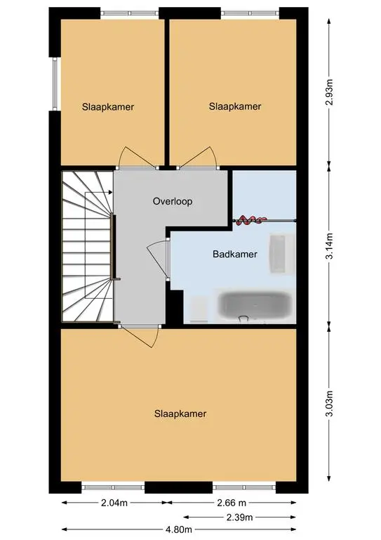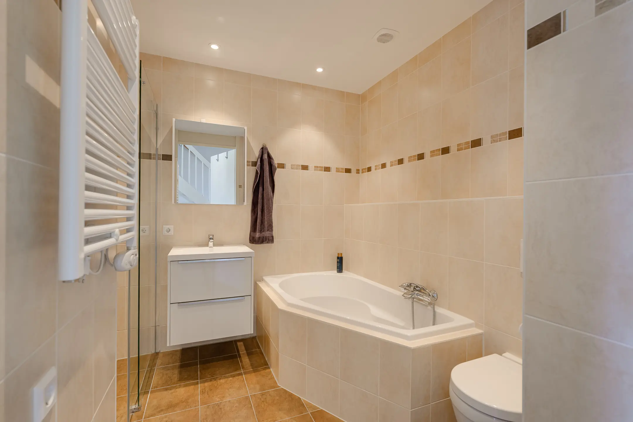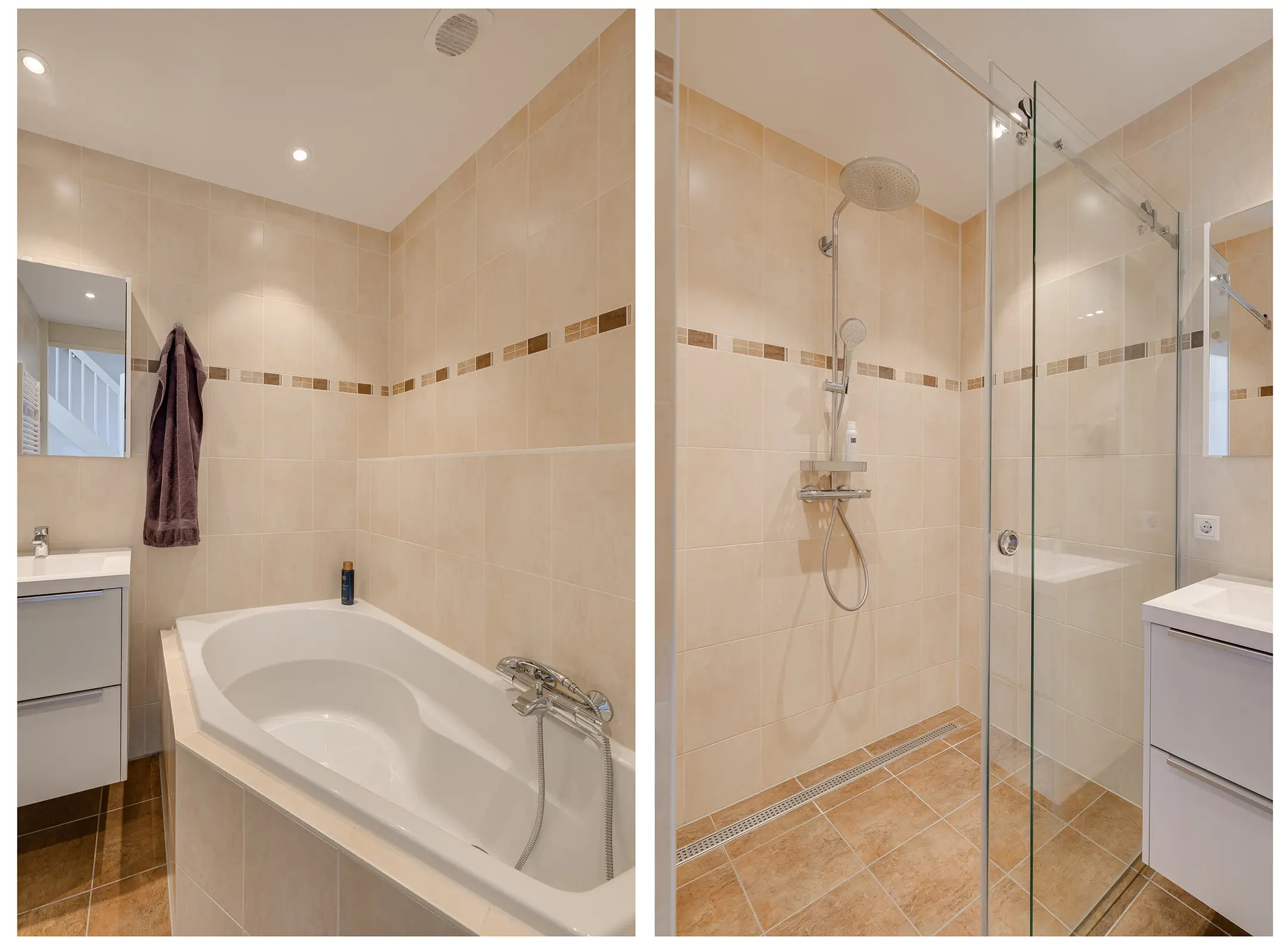 De overloop geeft toegang tot drie slaapkamers en de badkamer. Aan de voorzijde ligt de grootste slaapkamer (ca. 15 m²) met twee ramen en rolluiken. De badkamer is modern en compleet ingericht met inloopdouche, ligbad, wastafel, toilet, handdoekradiator en mechanische ventilatie. De twee slaapkamers aan de achterzijde (ca. 6 en 8 m²) zijn afgewerkt met laminaat. Alle vertrekken beschikken over instelbare vloerverwarming.