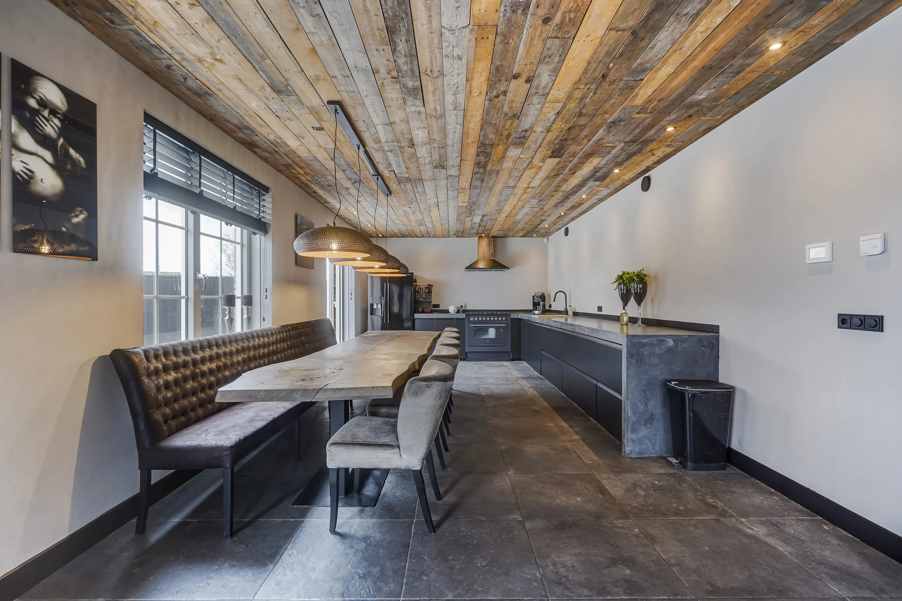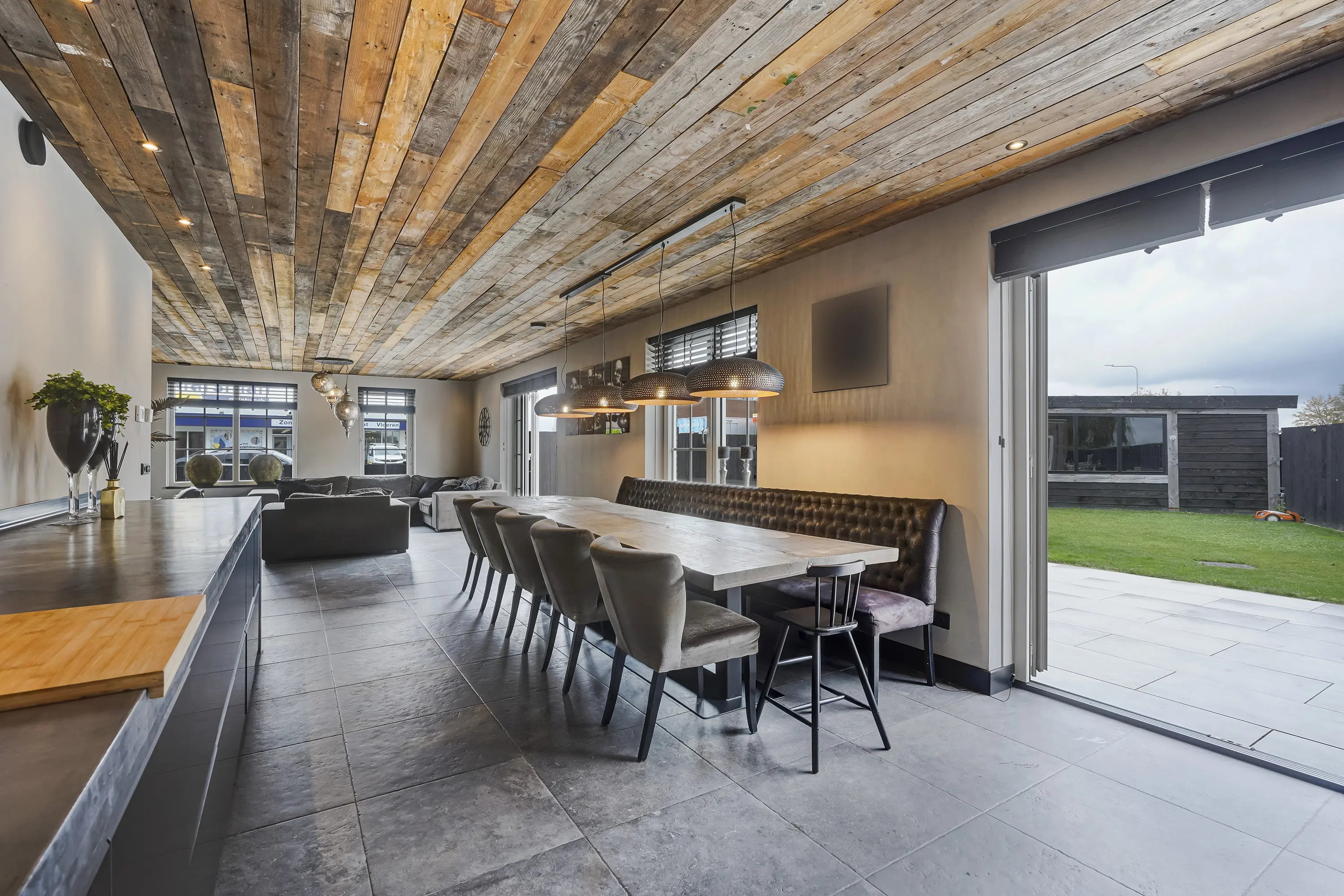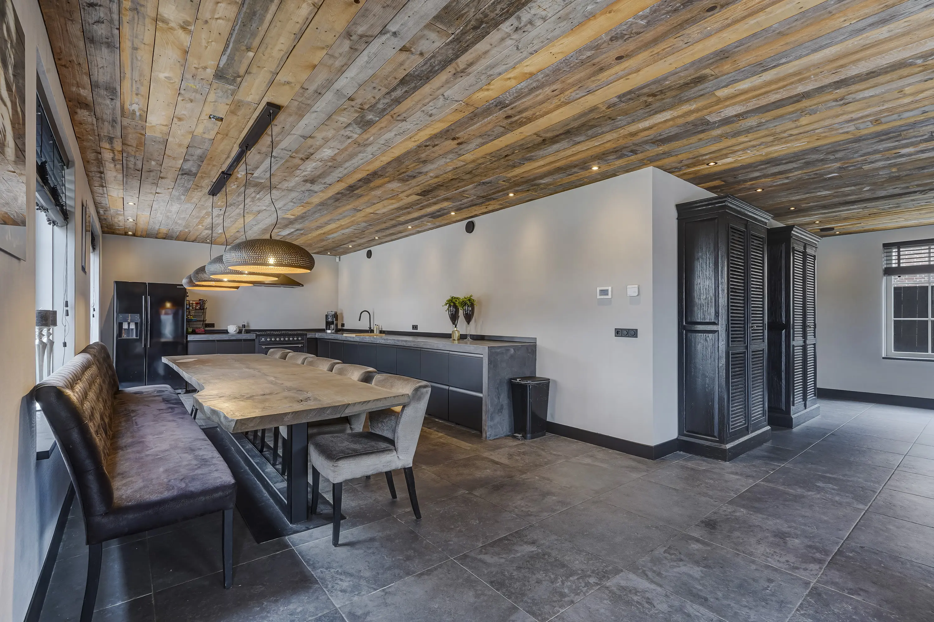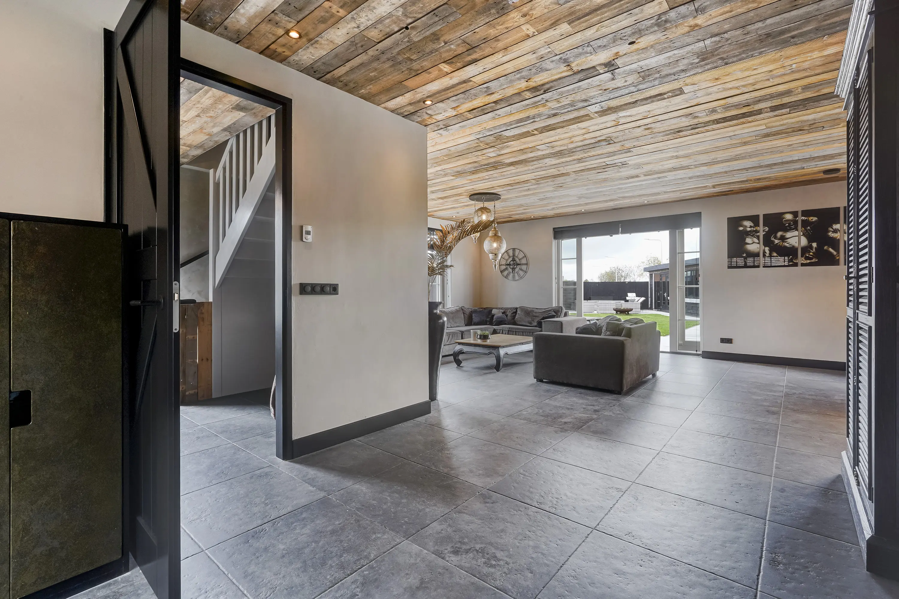 Over de gehele begane grond ligt een onderhoudsvriendelijke plavuizenvloer met vloerverwarming, het (sloop)houten plafond met lichtspots geeft de woonkamer een robuuste uitstraling.