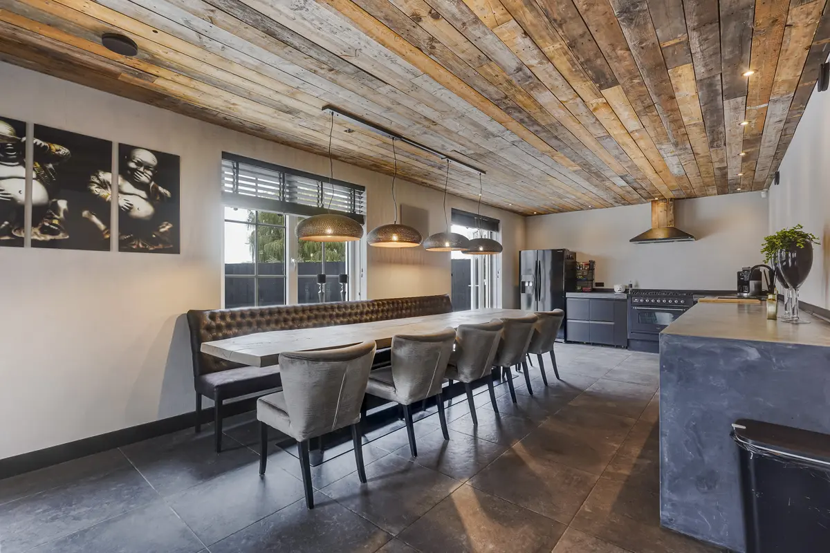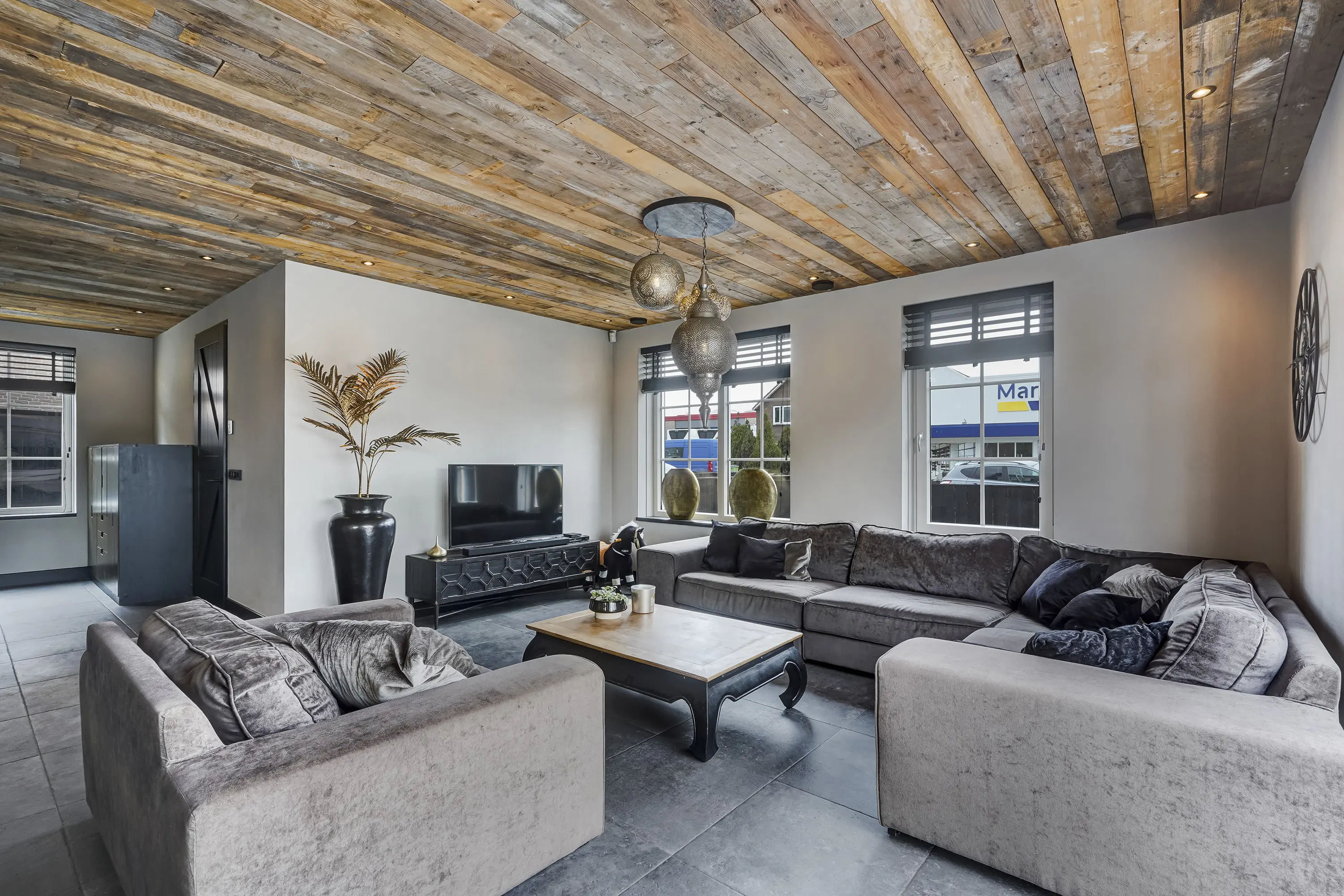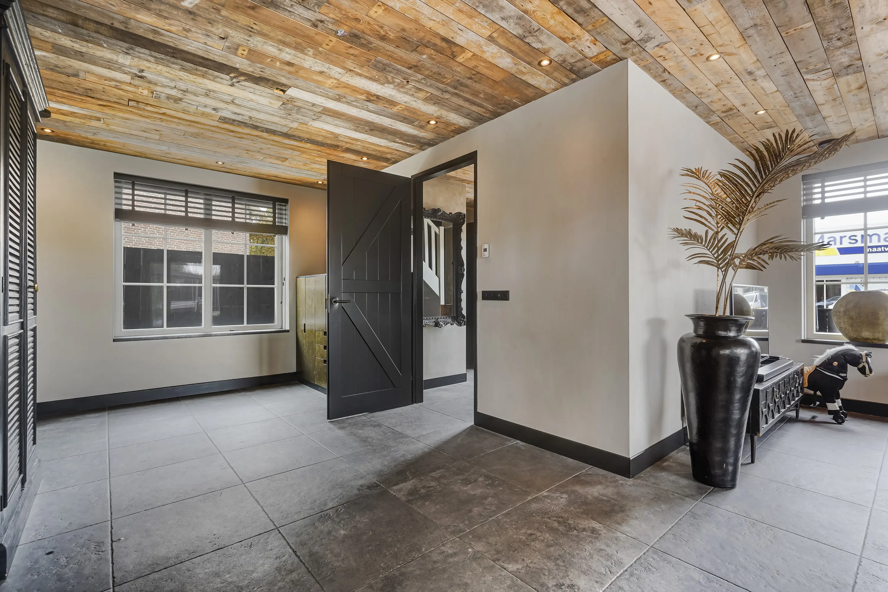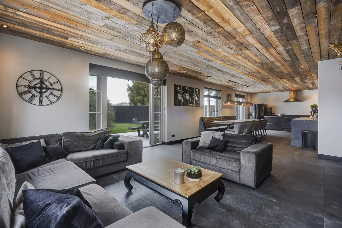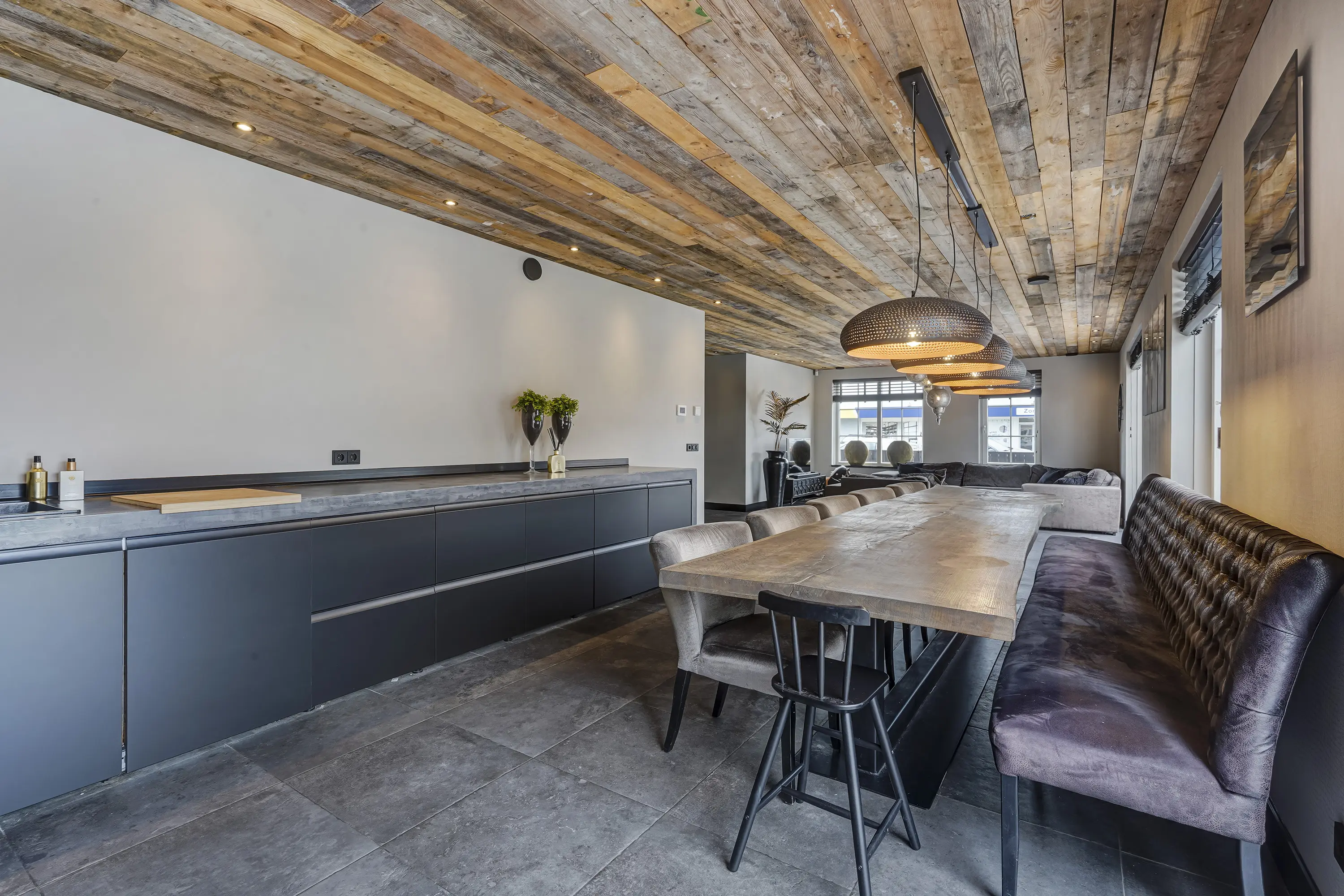 Over de gehele begane grond ligt een onderhoudsvriendelijke plavuizenvloer met vloerverwarming, het (sloop)houten plafond met lichtspots geeft de woonkamer een robuuste uitstraling.