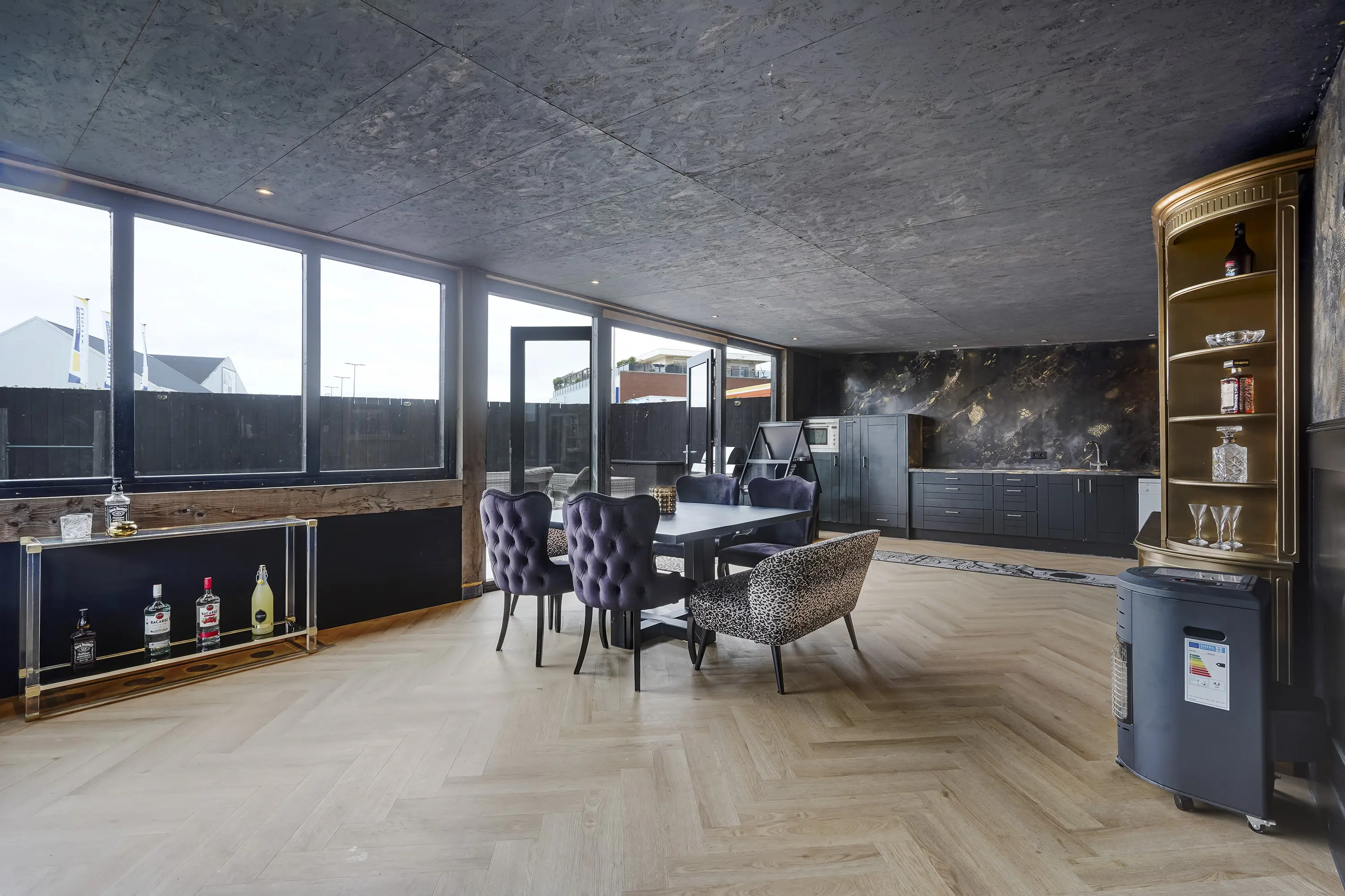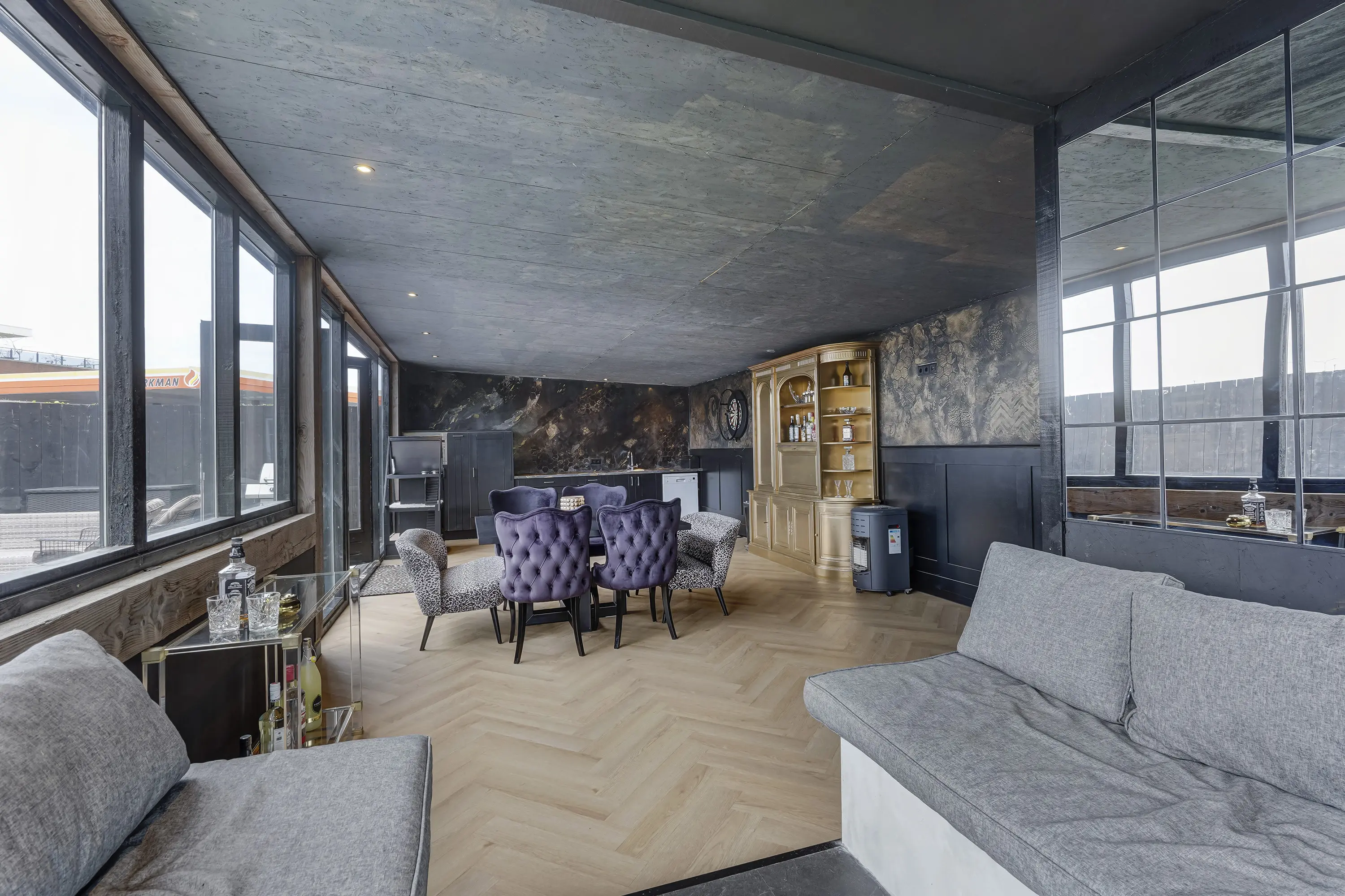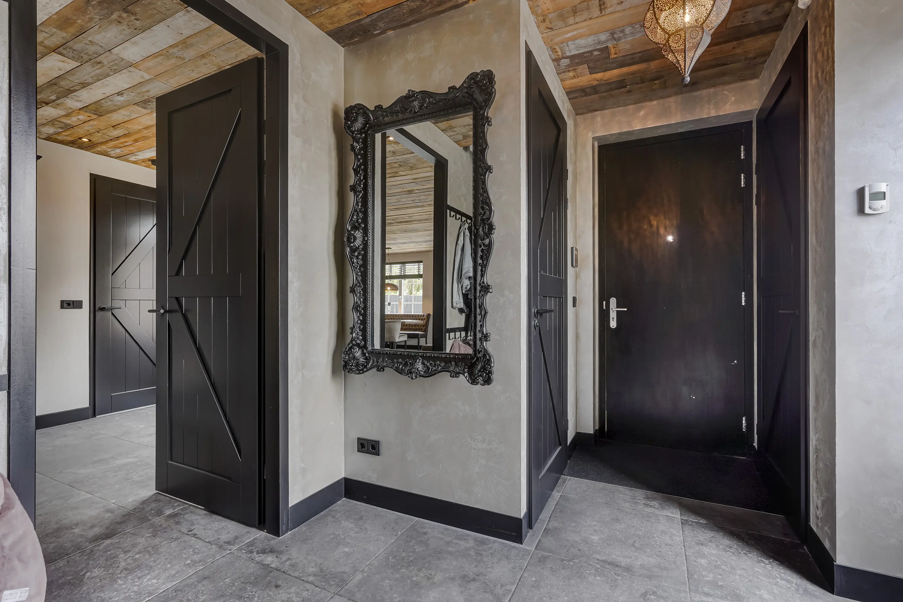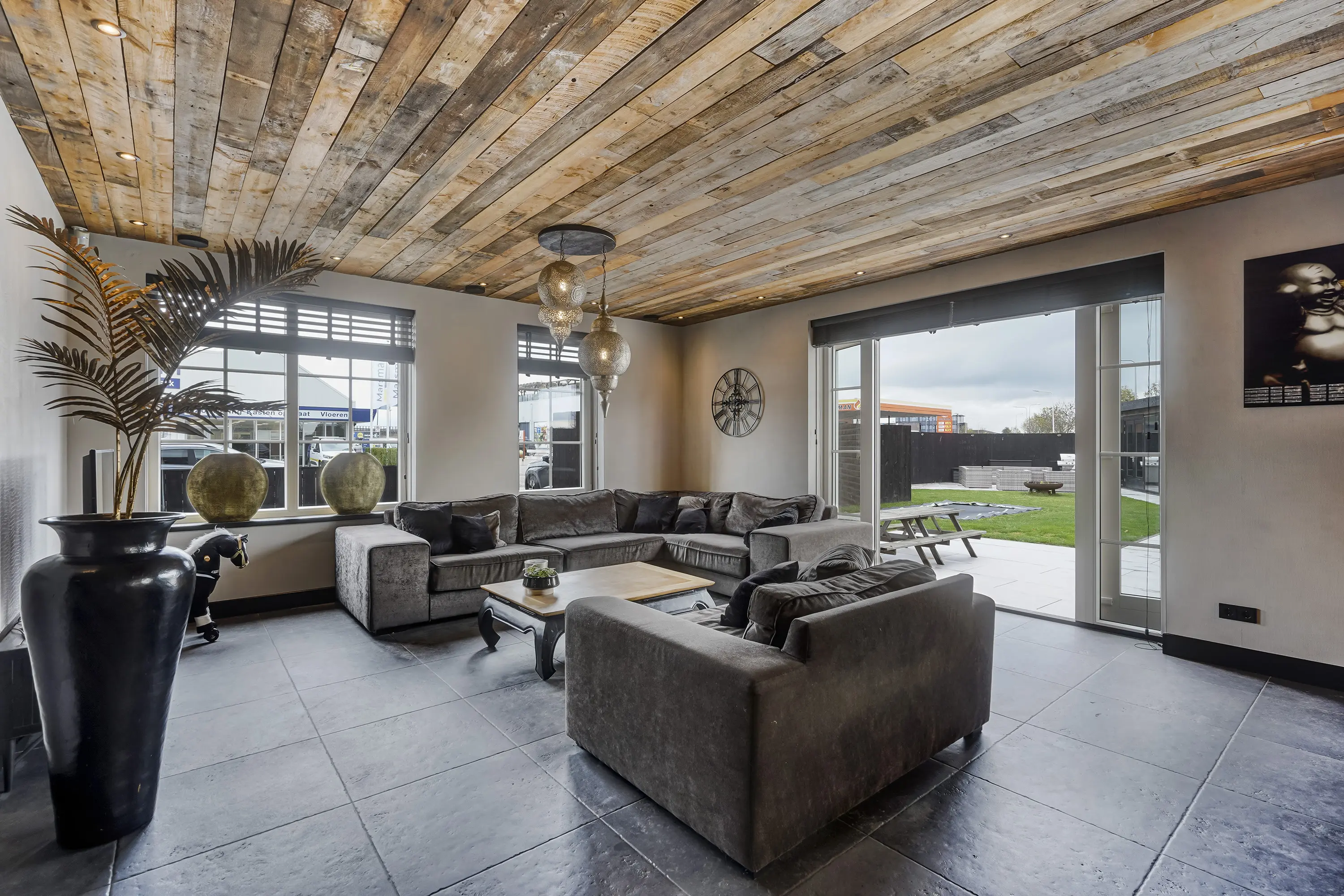 Over de gehele begane grond ligt een onderhoudsvriendelijke plavuizenvloer met vloerverwarming, het (sloop)houten plafond met lichtspots geeft de woonkamer een robuuste uitstraling.