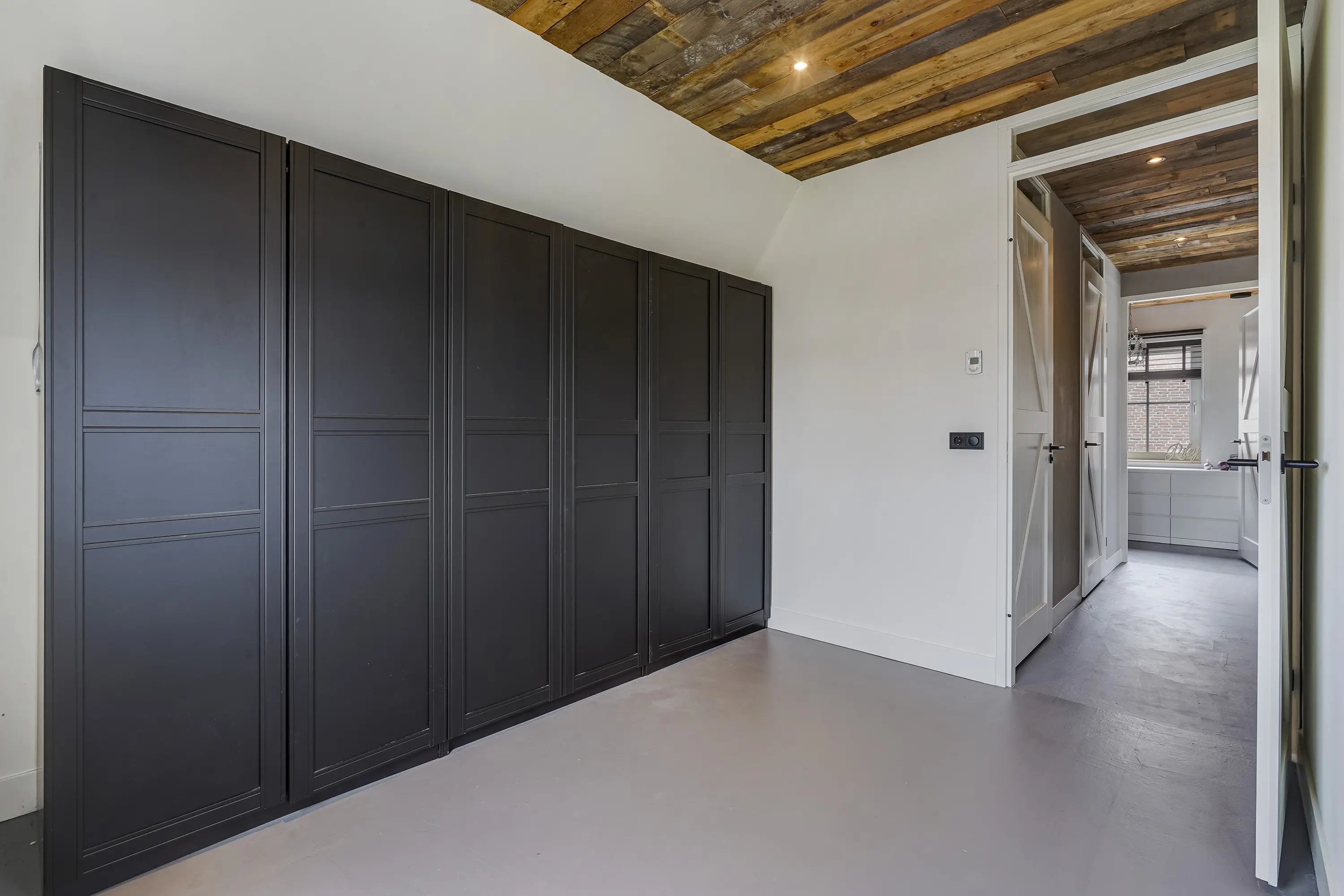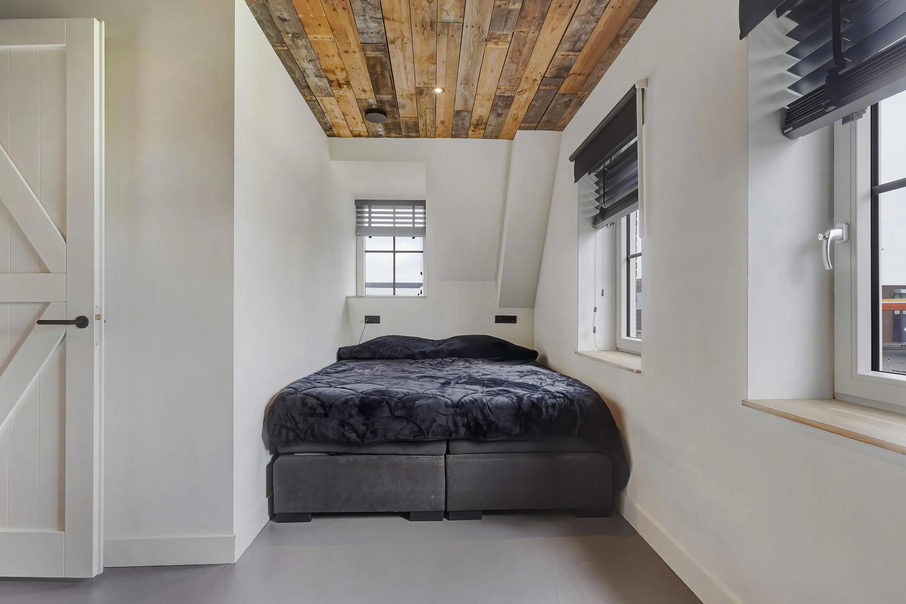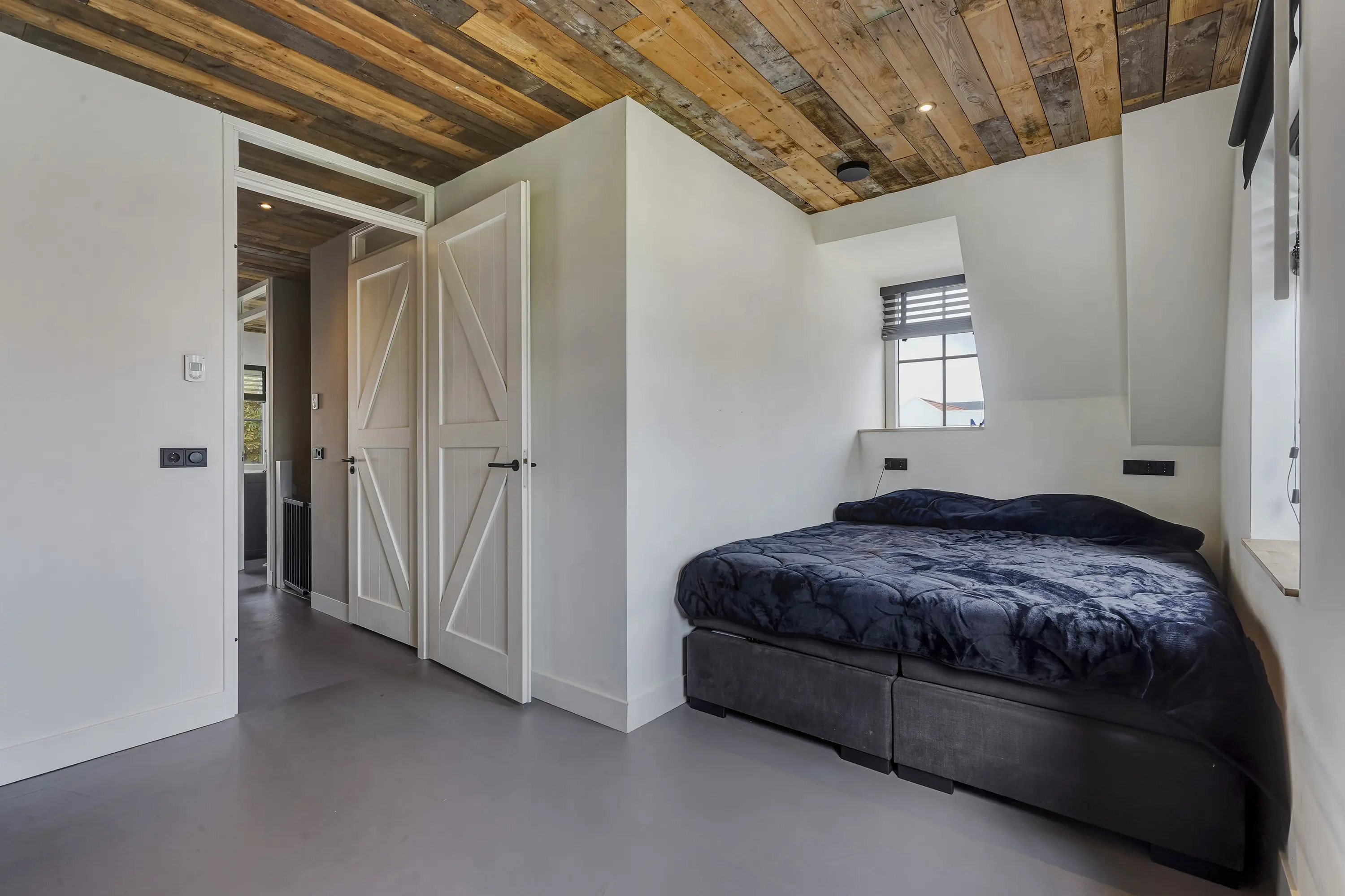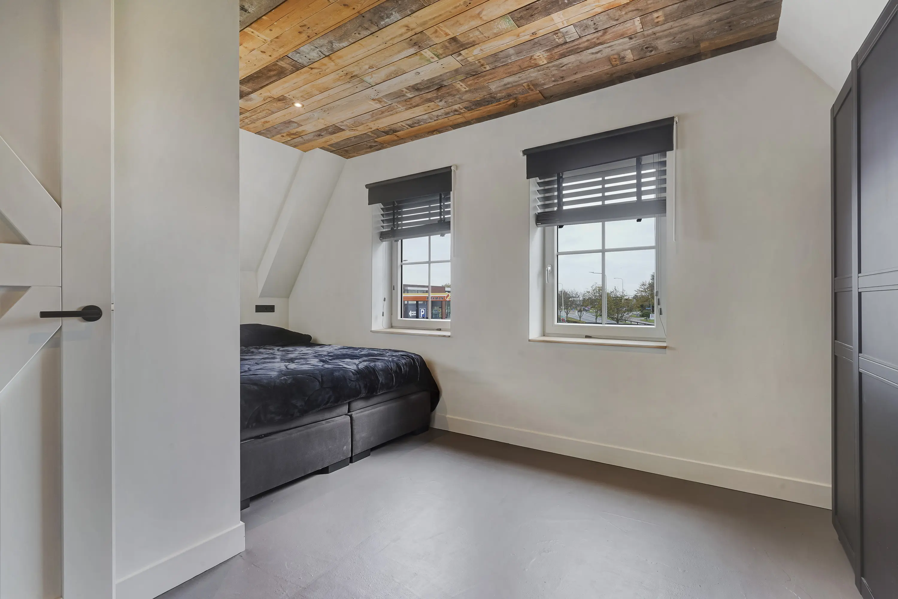 De hoofdslaapkamer beschikt over twee extra zijramen en (sloop) houten plafond met lichtspots. De kastenwand is groot genoeg voor uw garderobe.