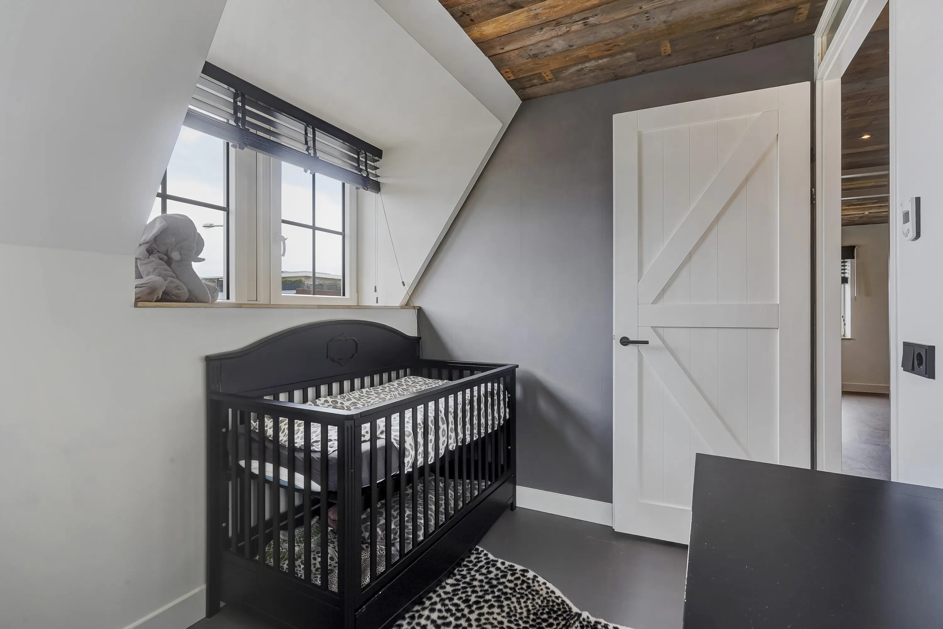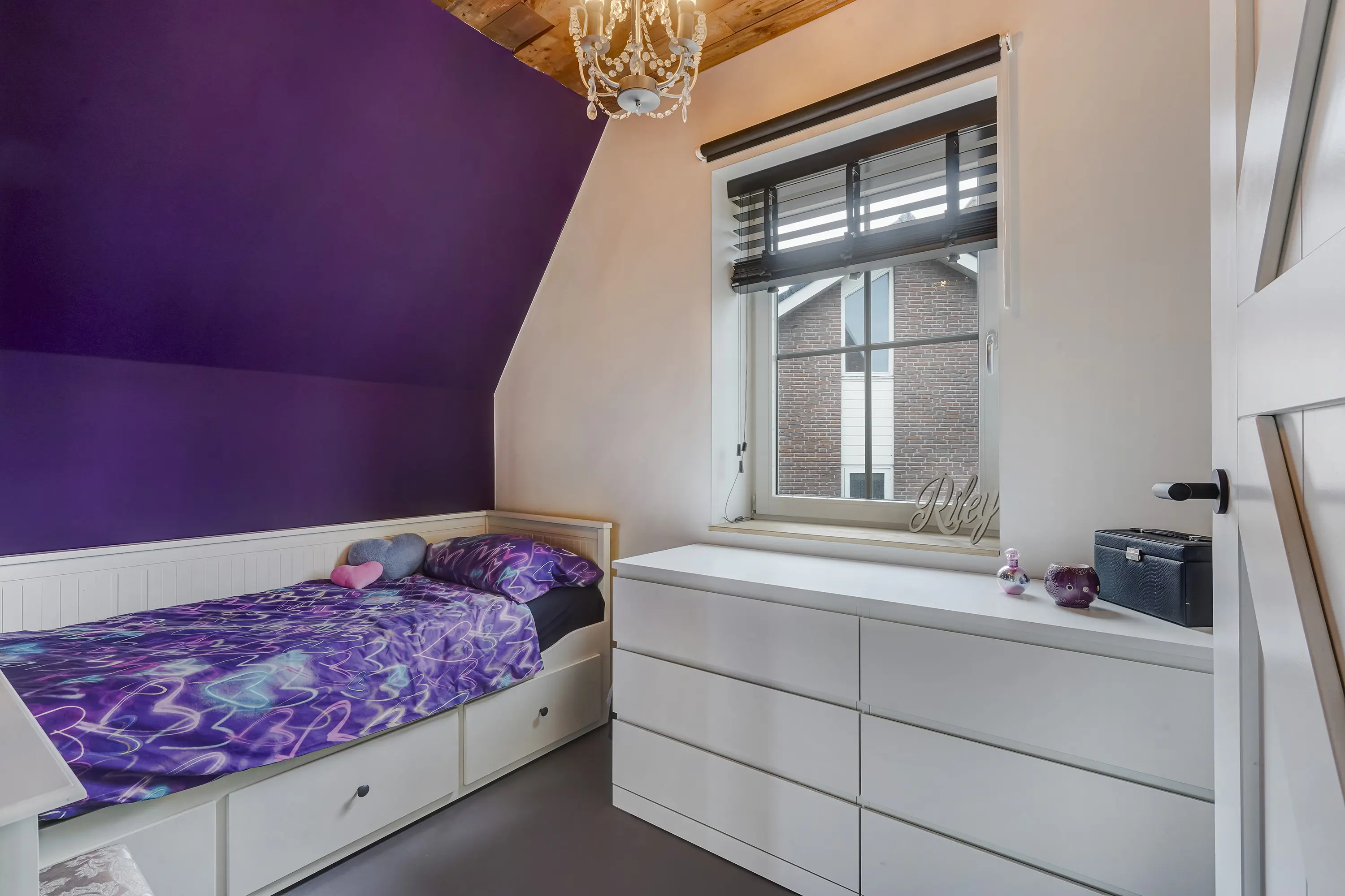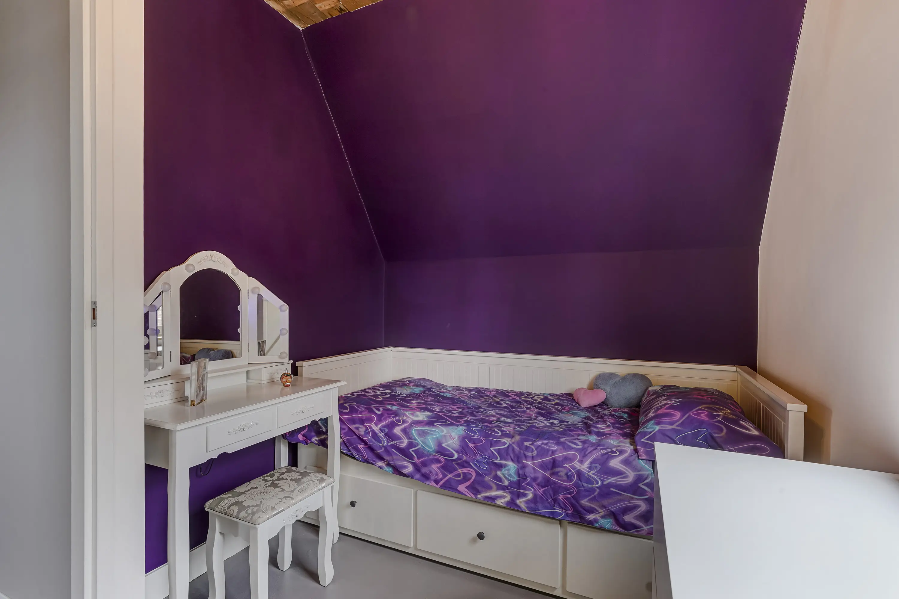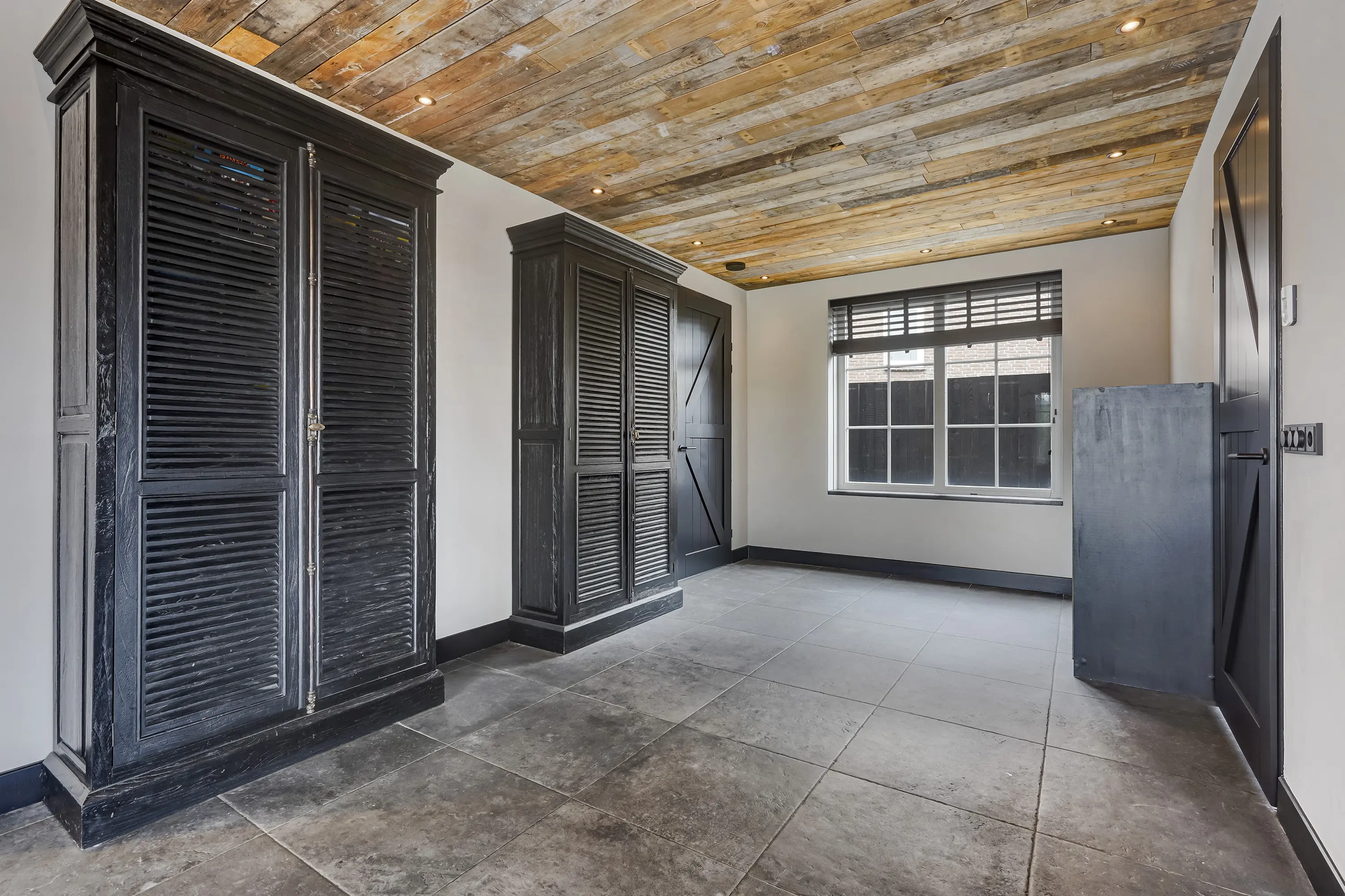 De hoofdslaapkamer beschikt over twee extra zijramen en (sloop) houten plafond met lichtspots. De kastenwand is groot genoeg voor uw garderobe.