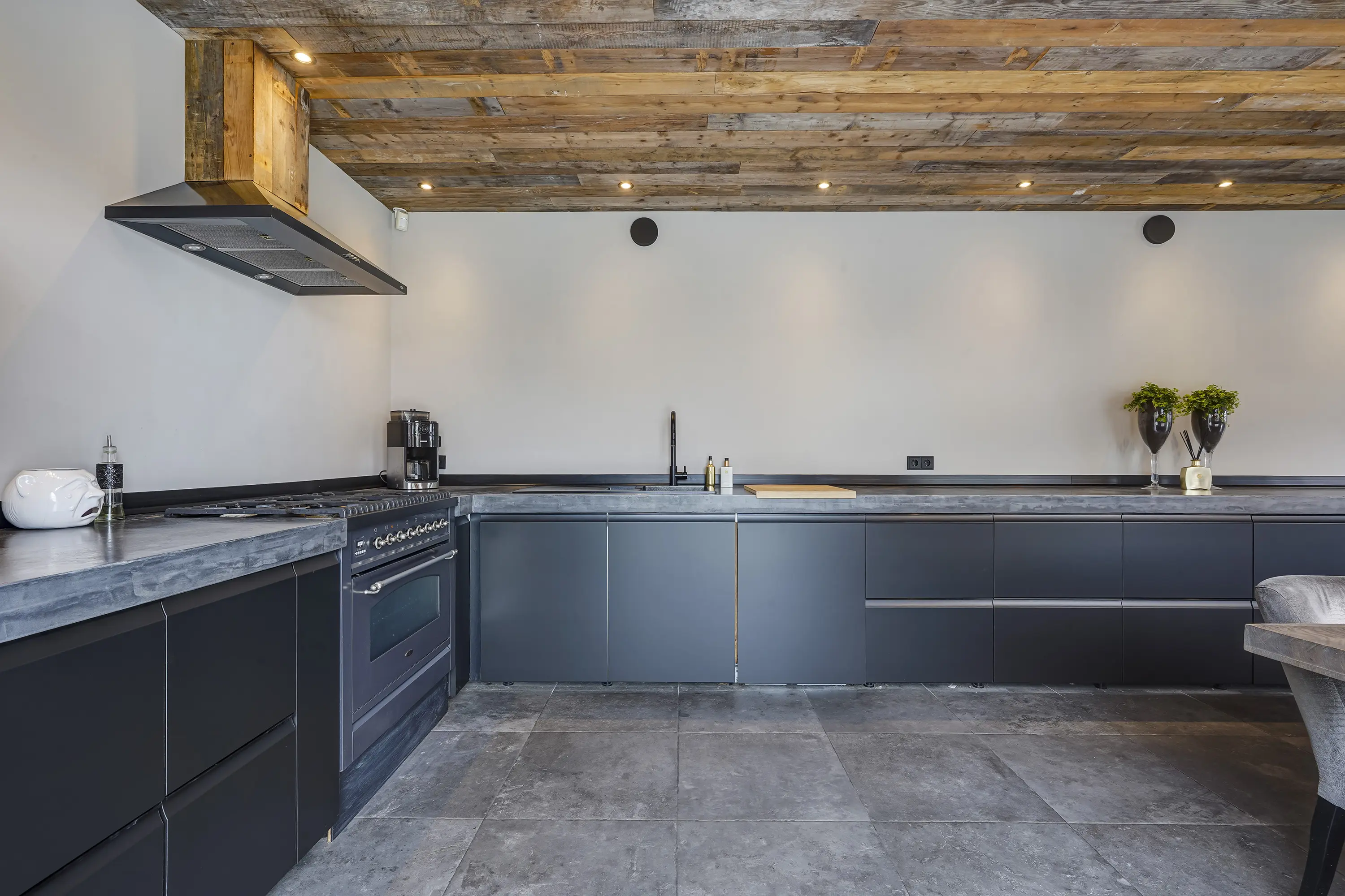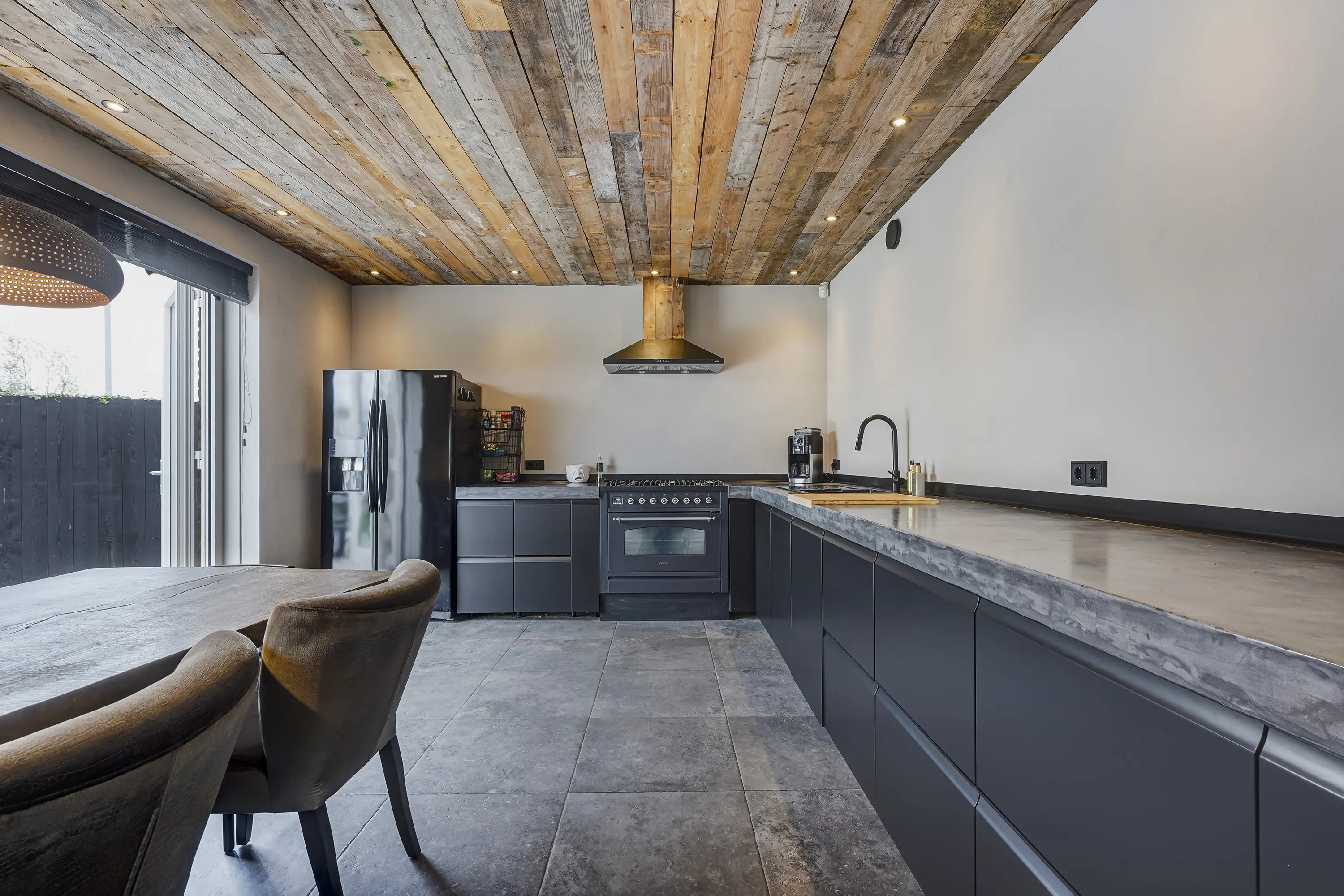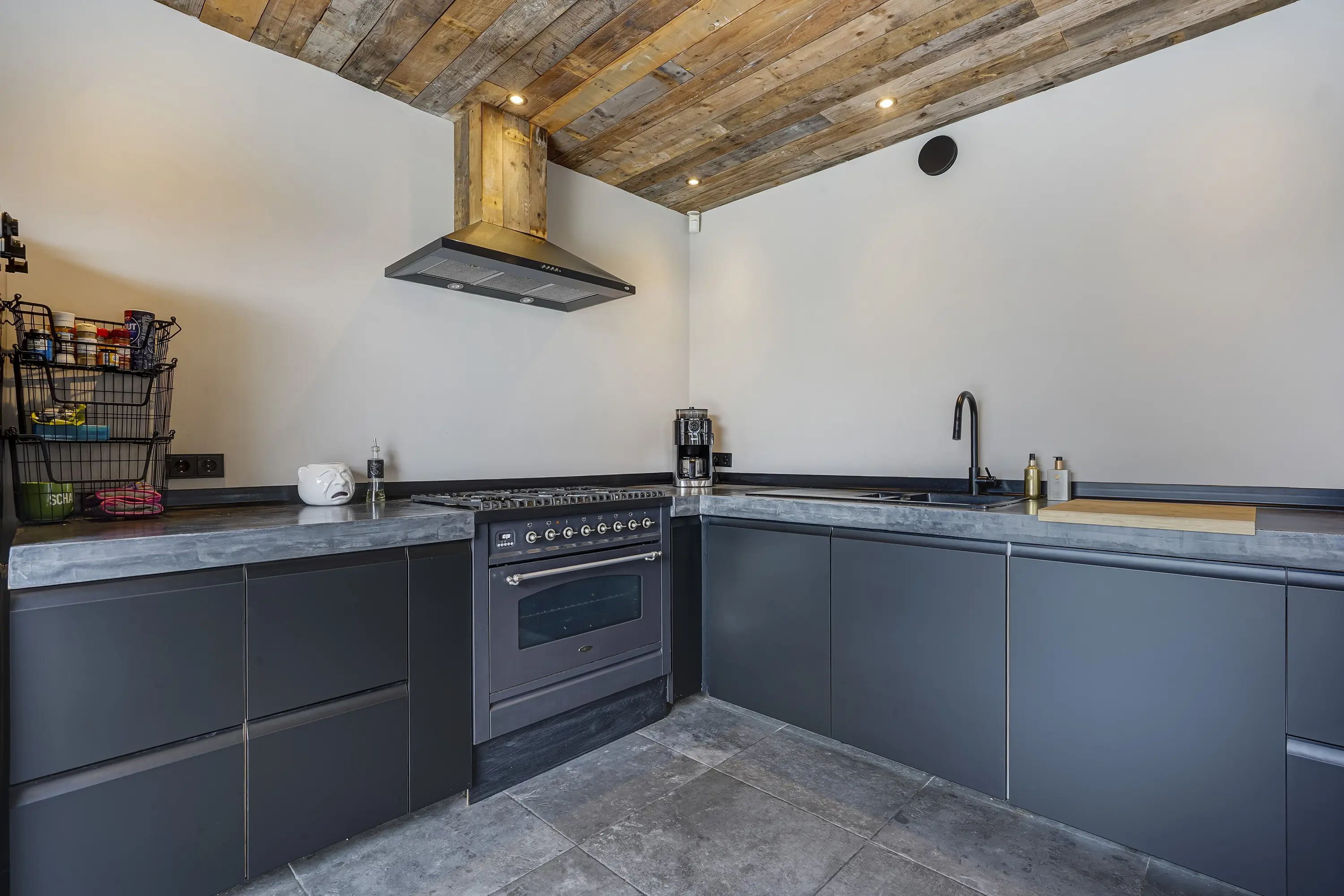 De hoogwaardige afwerking van de woning komt terug in de keuken. De keuken bestaat uit een betonlook keukenblad met greeploze fronten en diverse inbouwapparatuur; een 6-pits Boretti gasfornuis met oven en afzuigkap, vaatwasser, spoelbak met mengkraan en (losse) koel-/vriescombinatie.