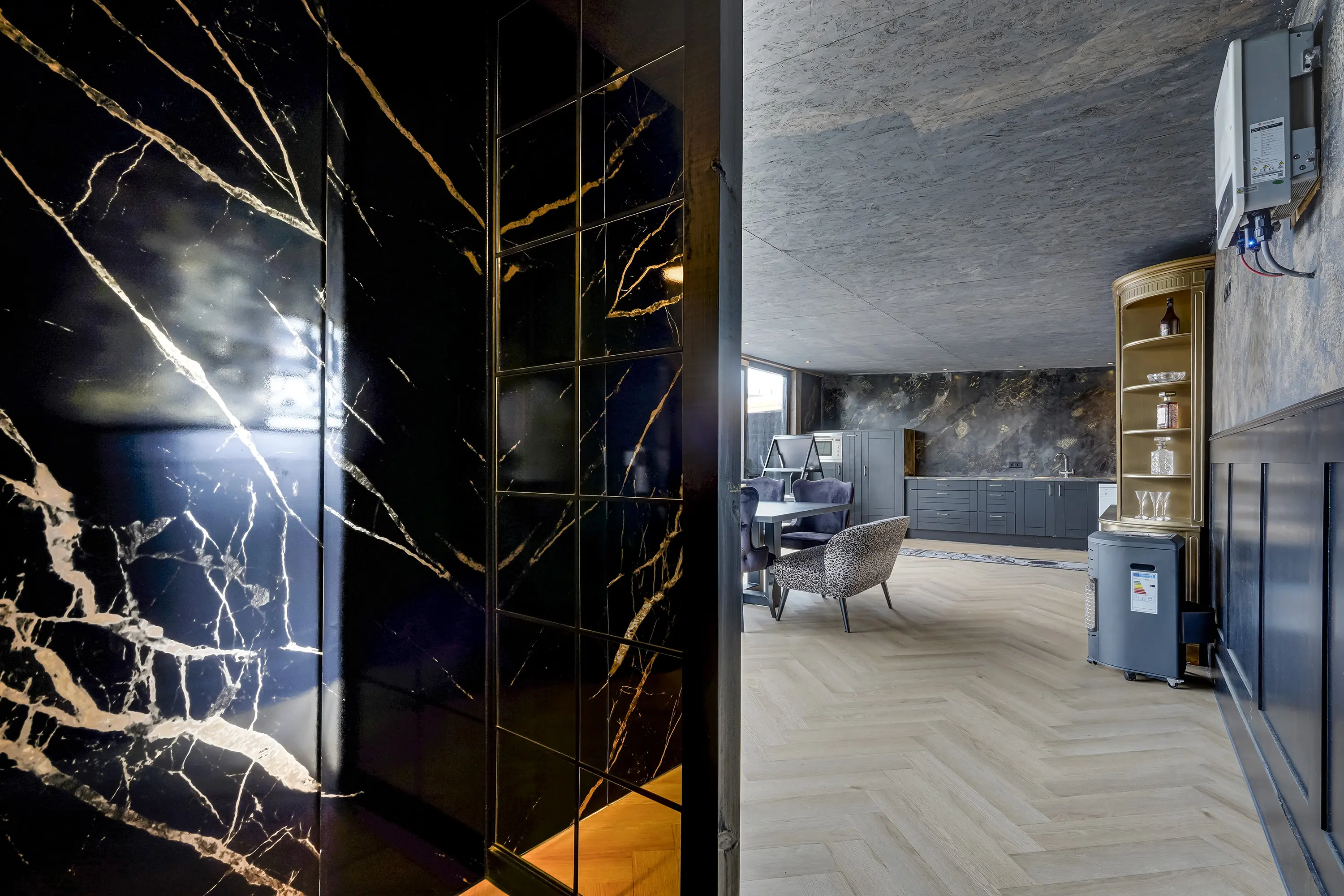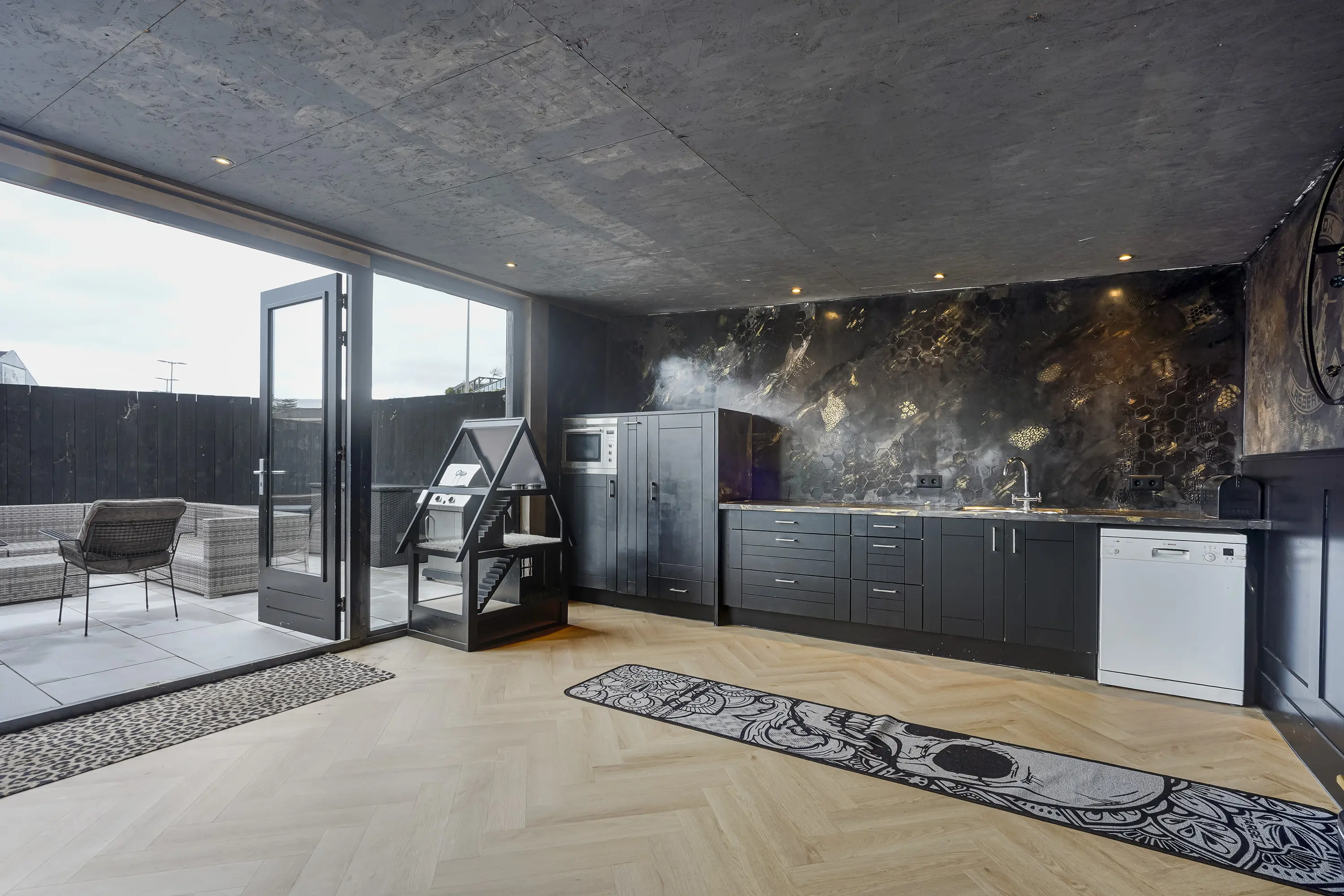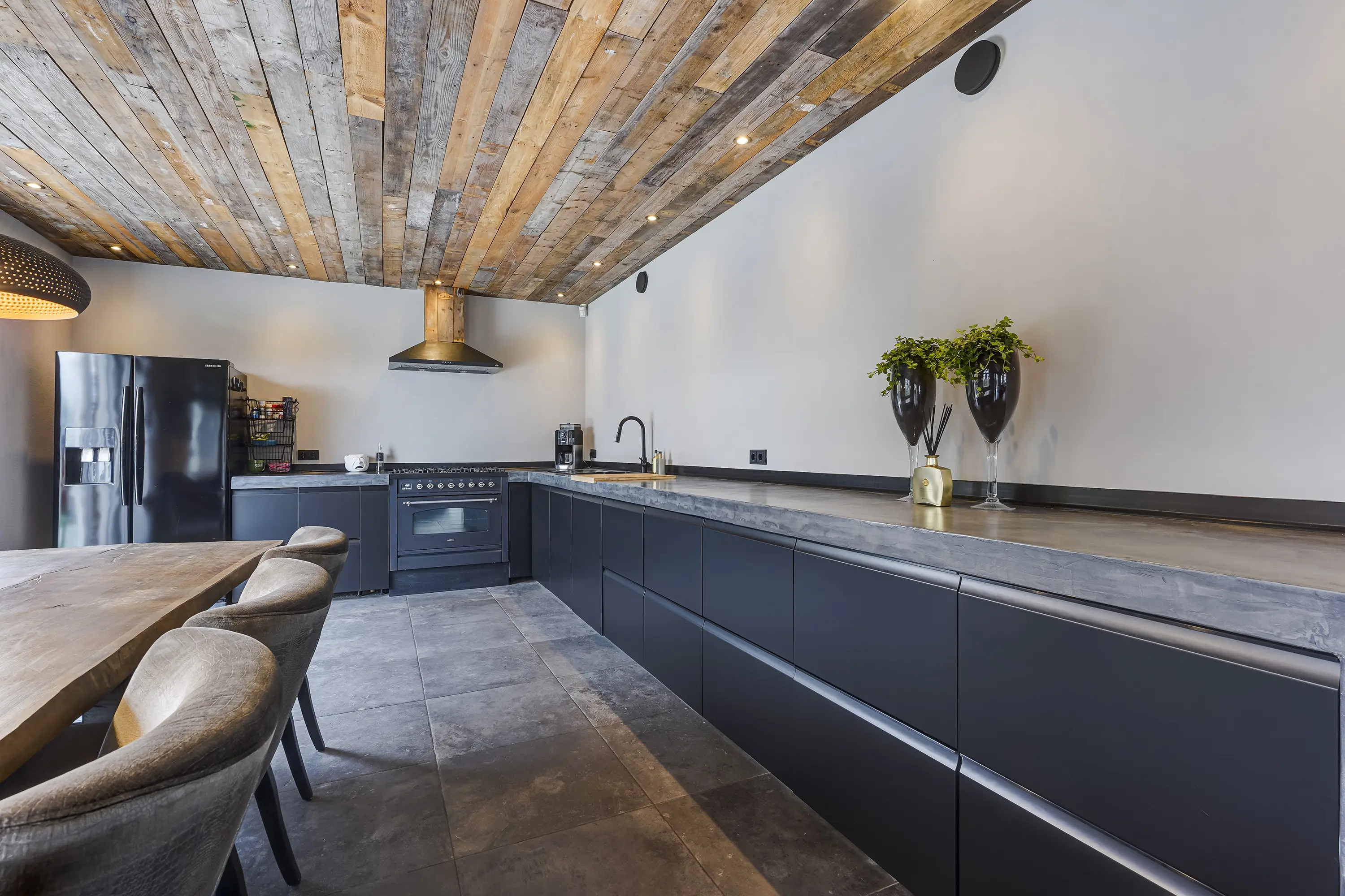 De hoogwaardige afwerking van de woning komt terug in de keuken. De keuken bestaat uit een betonlook keukenblad met greeploze fronten en diverse inbouwapparatuur; een 6-pits Boretti gasfornuis met oven en afzuigkap, vaatwasser, spoelbak met mengkraan en (losse) koel-/vriescombinatie.