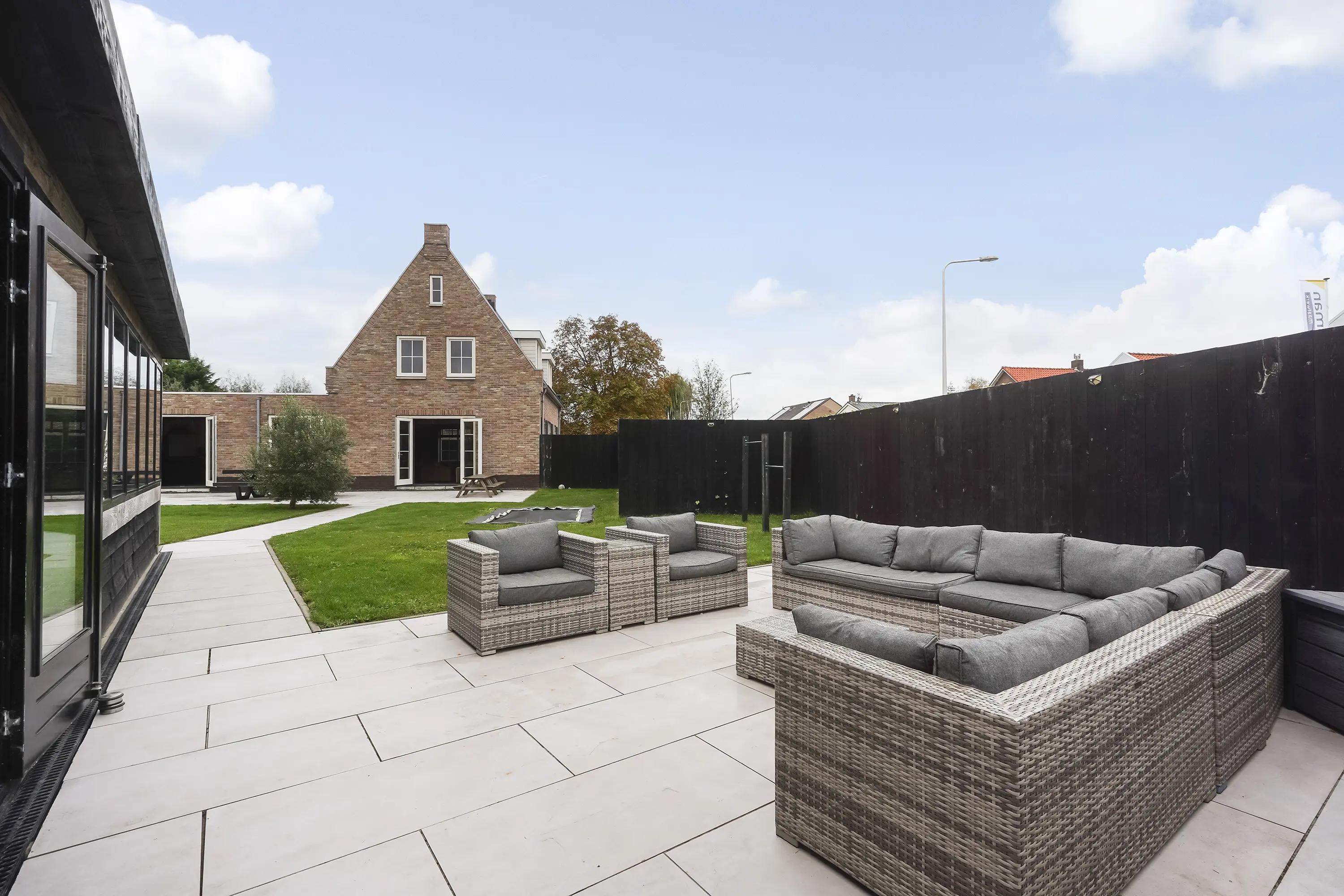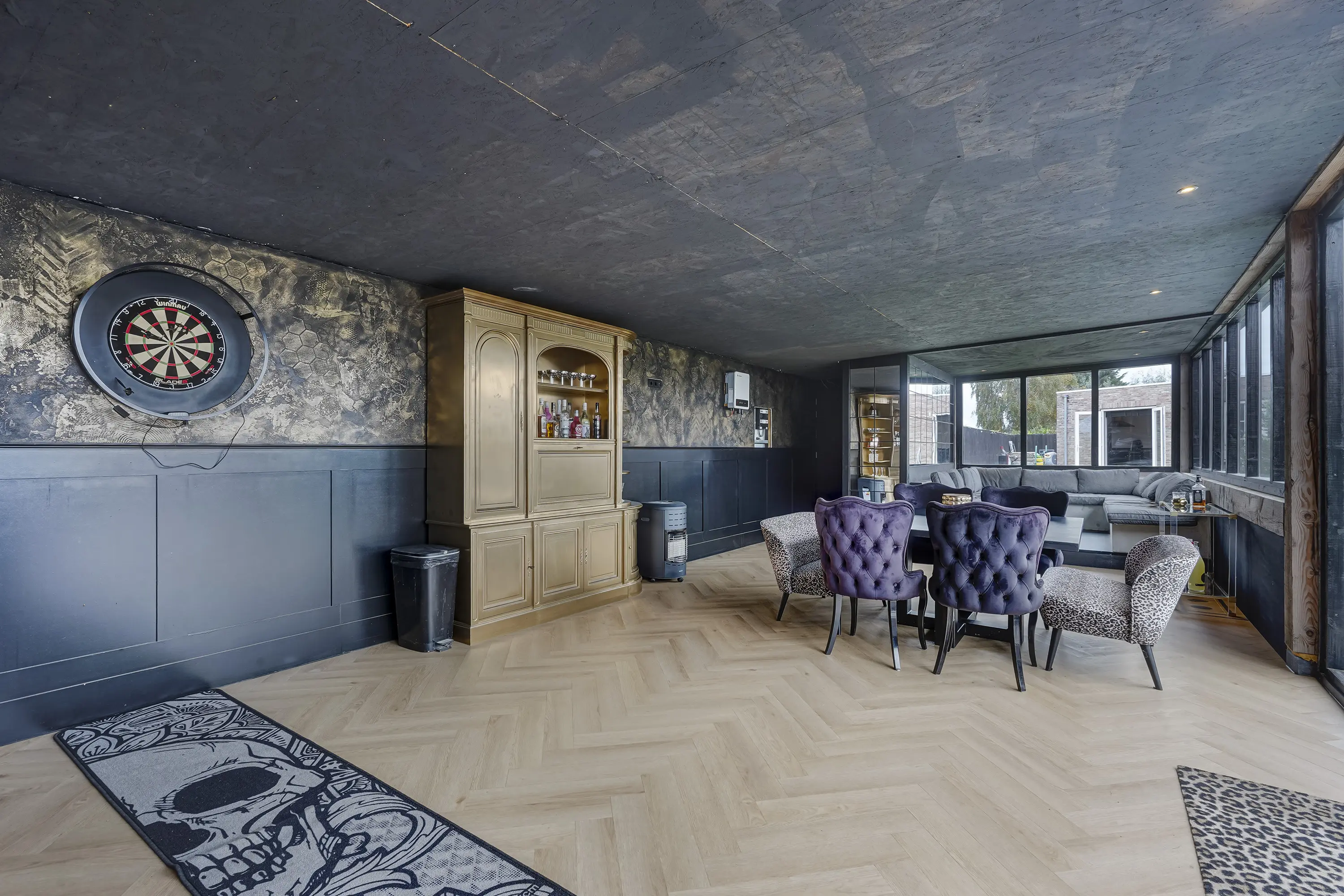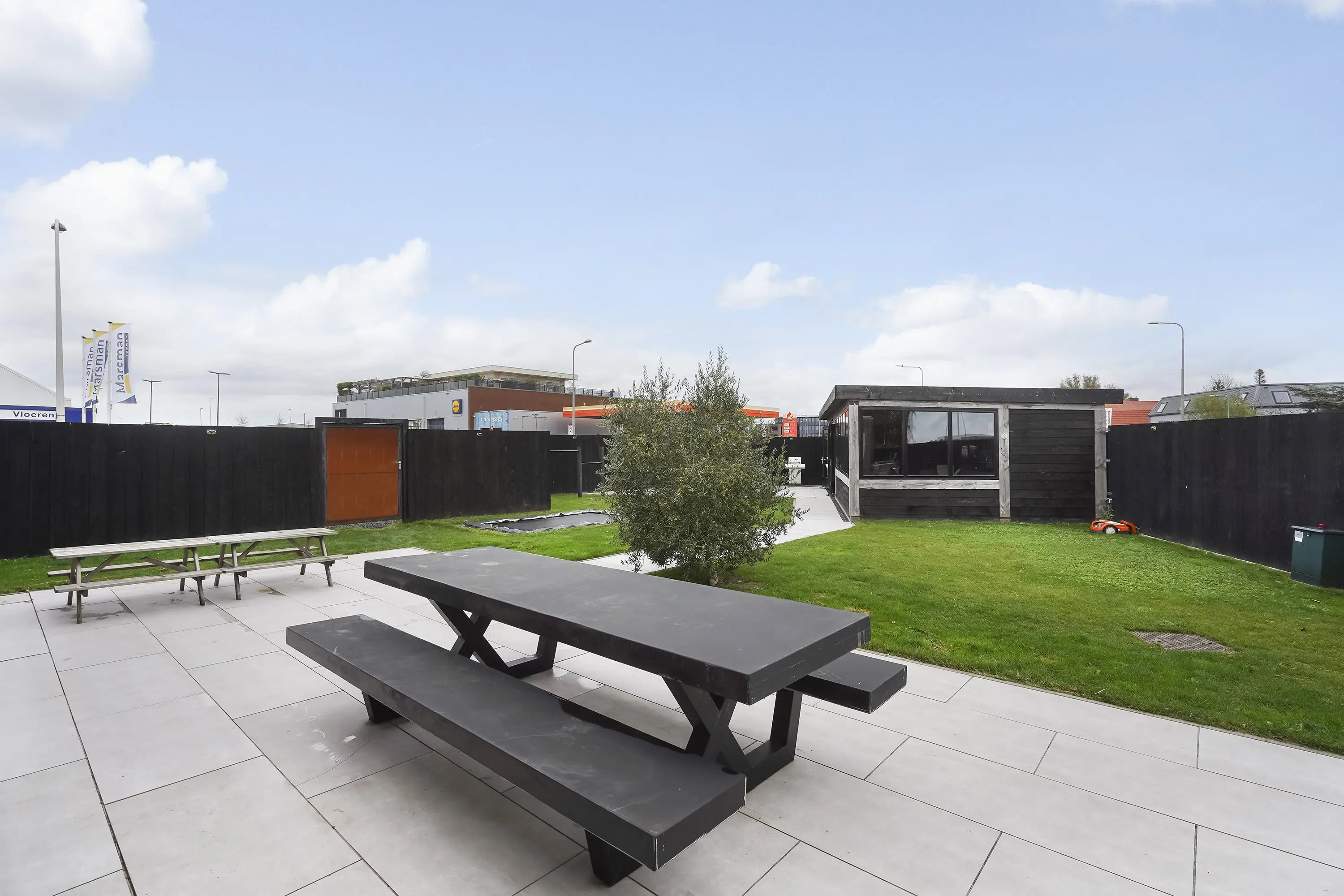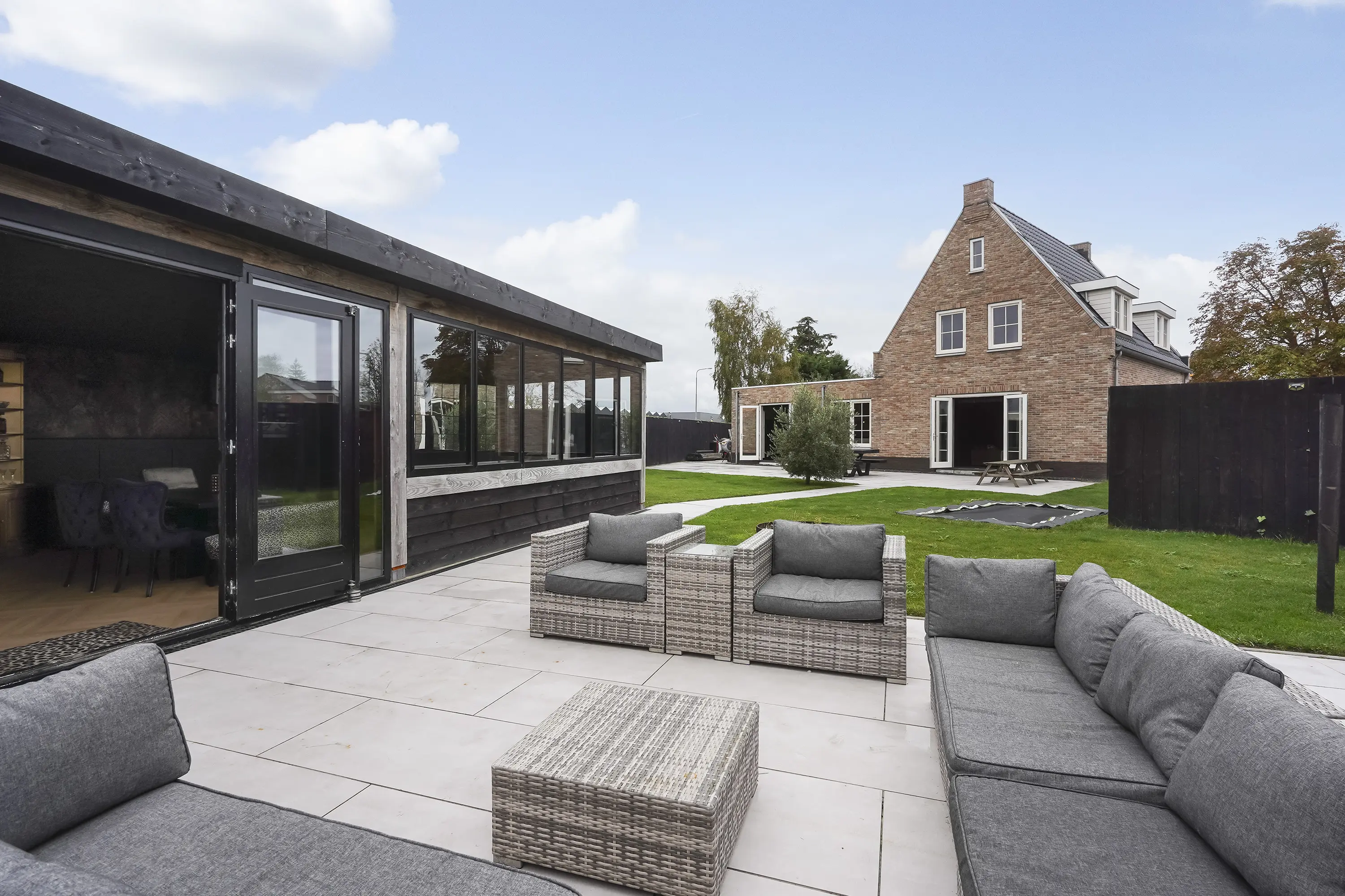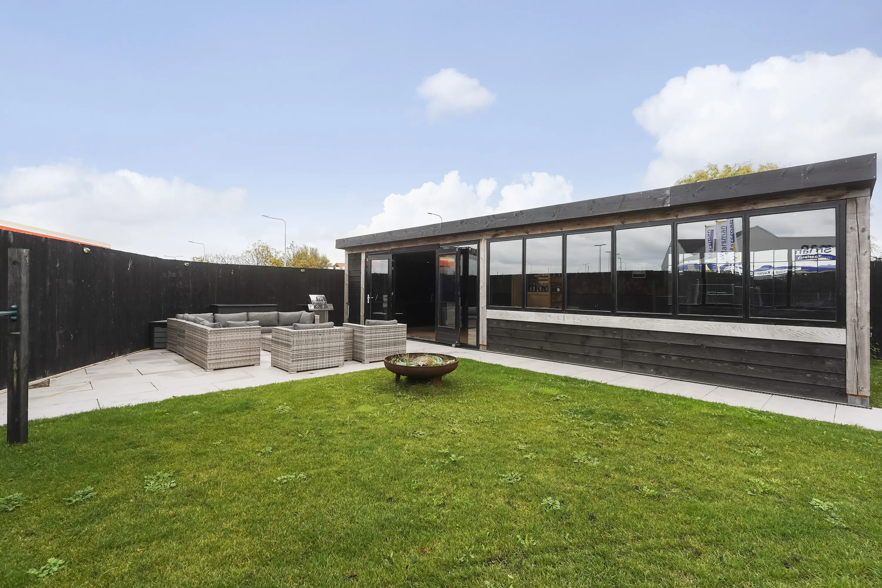 In de riante achtertuin, waar twee terrassen worden afgescheiden door groenzoden, is een royaal houten tuinhuis gebouwd middels stalen constructie met dak- en muurisolatie. Deze multifunctionele ruimte is ingericht met compleet keukenblok. In het OSB plafond zijn lichtspots verwerkt, op de vloer ligt een pvc-vloer in visgraat patroon. Tevens is er een eigen toiletruimte met wandtoilet en urinoir.