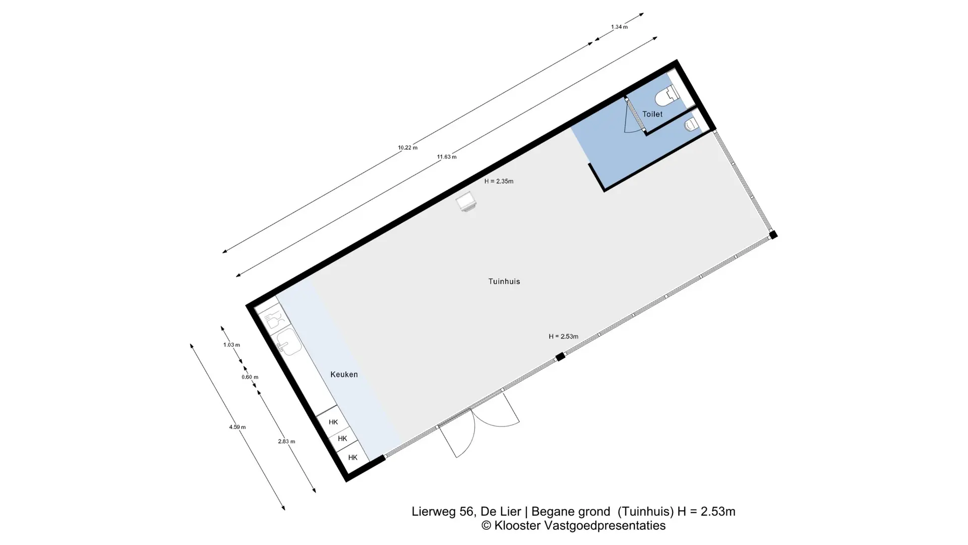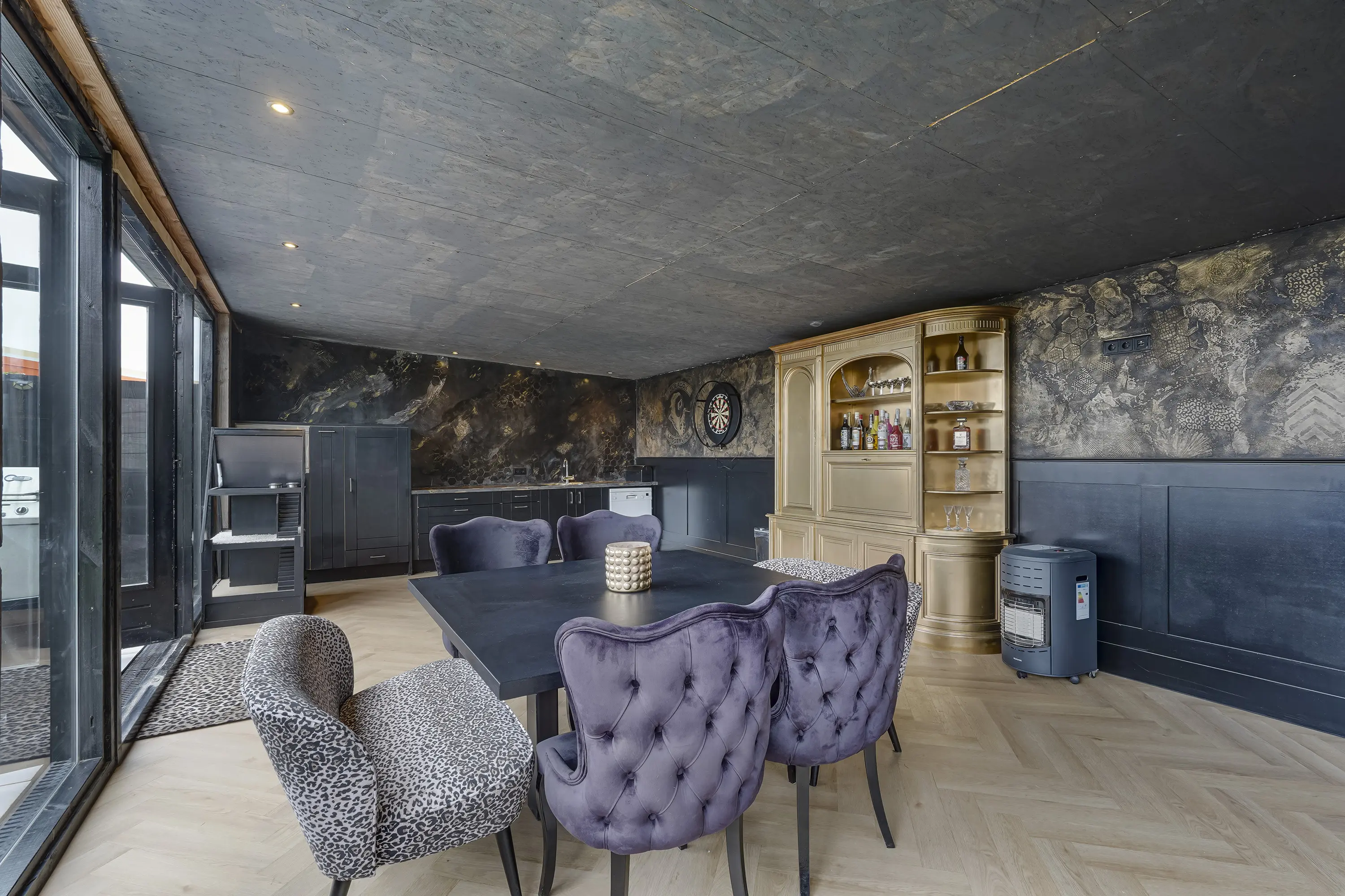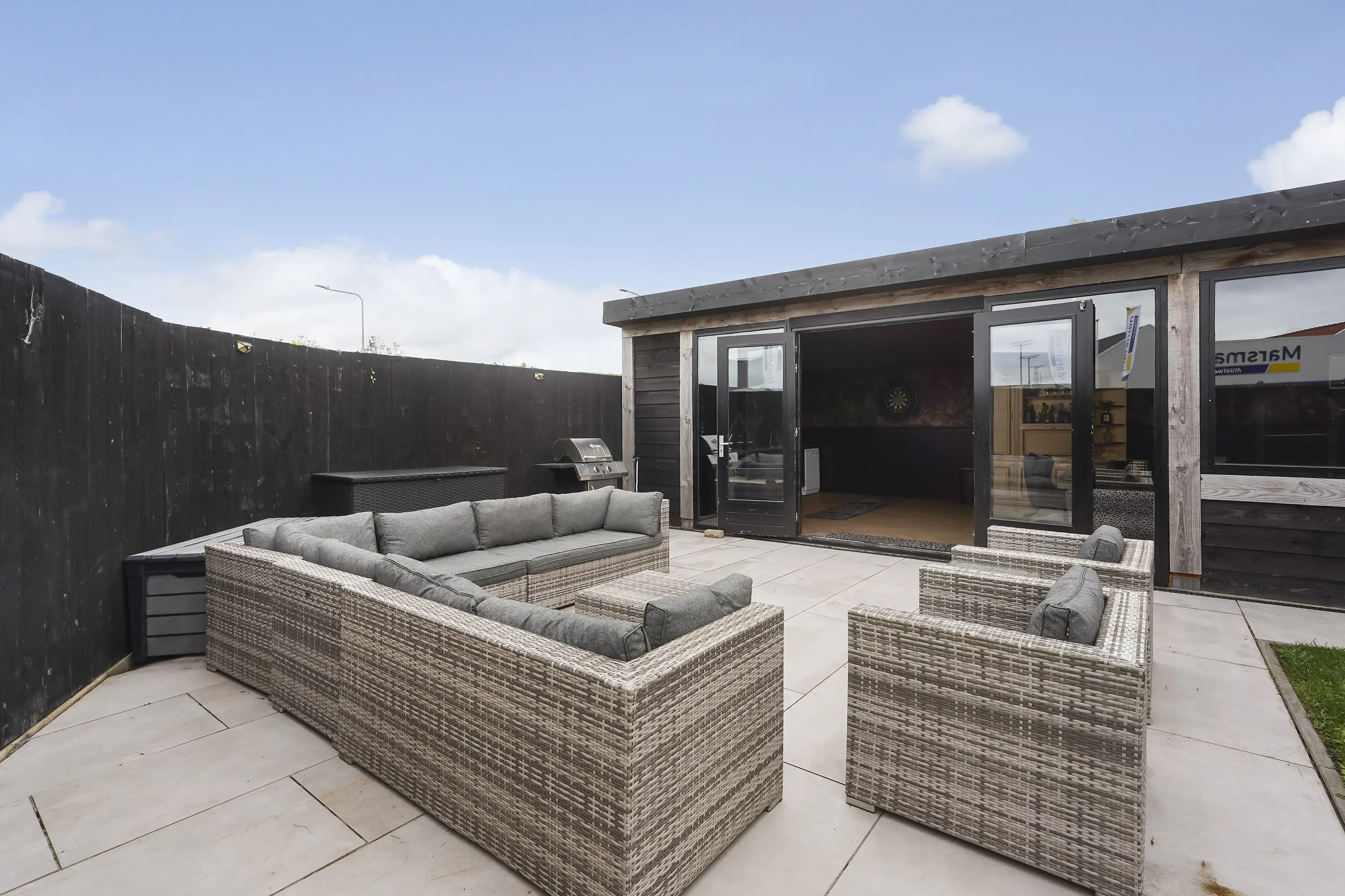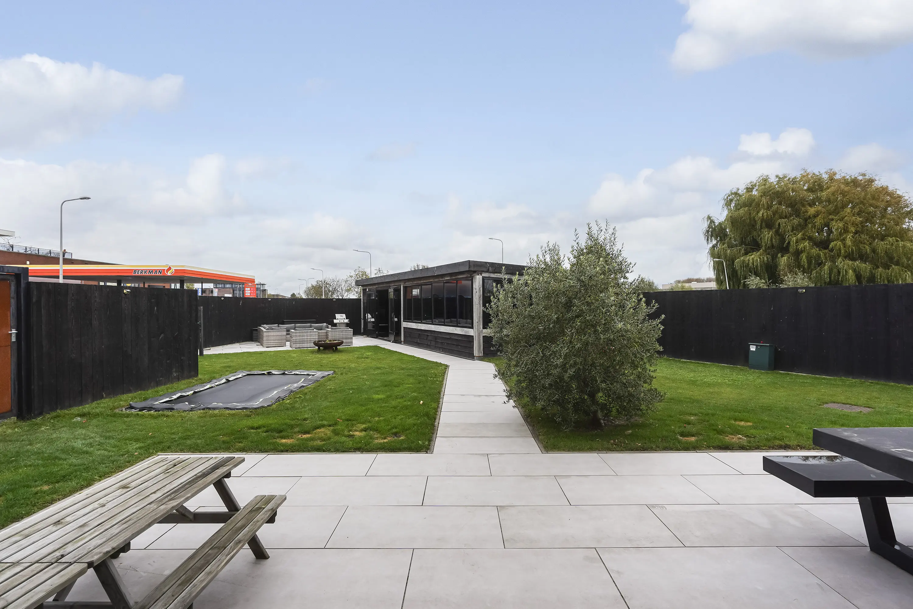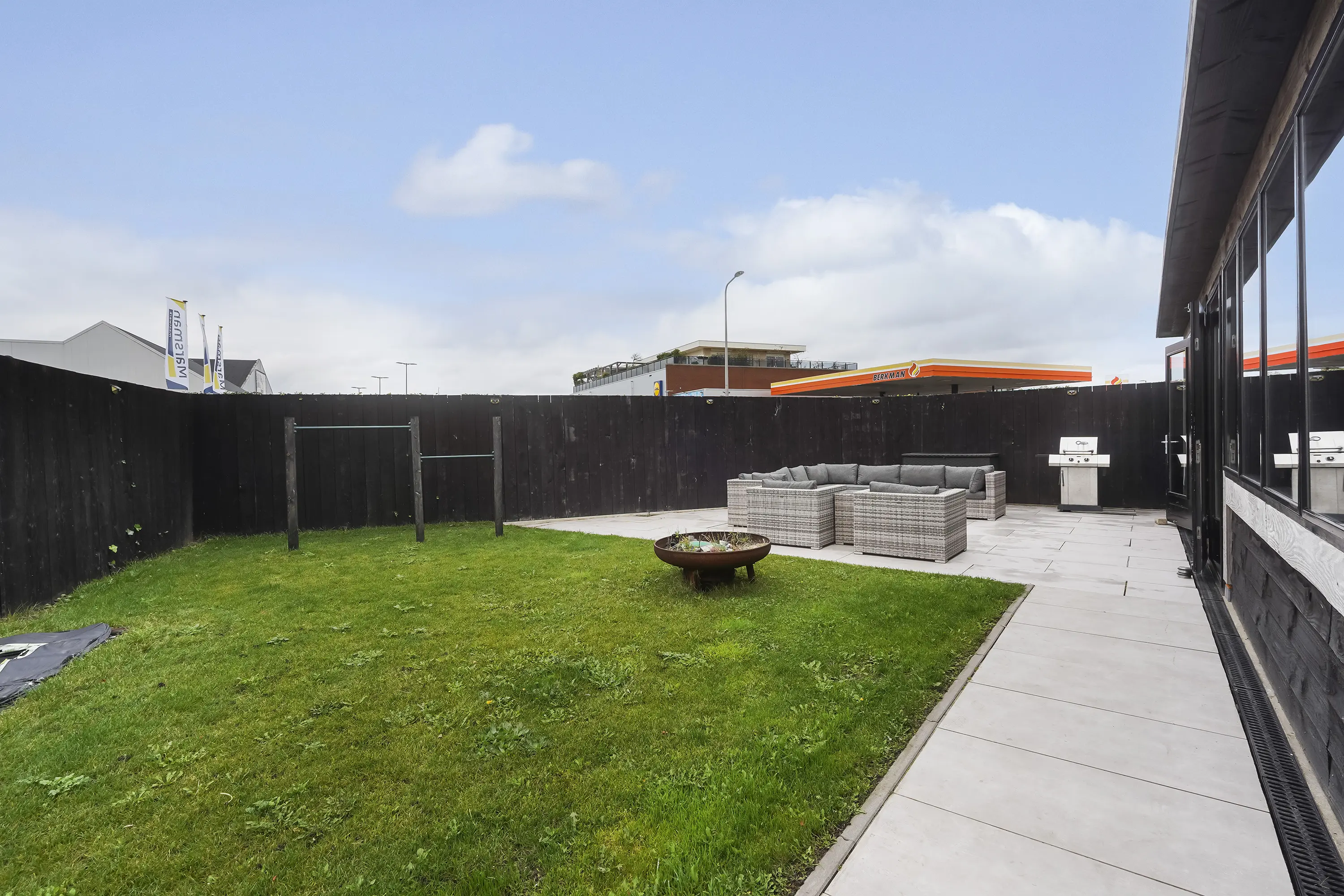 In de riante achtertuin, waar twee terrassen worden afgescheiden door groenzoden, is een royaal houten tuinhuis gebouwd middels stalen constructie met dak- en muurisolatie. Deze multifunctionele ruimte is ingericht met compleet keukenblok. In het OSB plafond zijn lichtspots verwerkt, op de vloer ligt een pvc-vloer in visgraat patroon. Tevens is er een eigen toiletruimte met wandtoilet en urinoir.