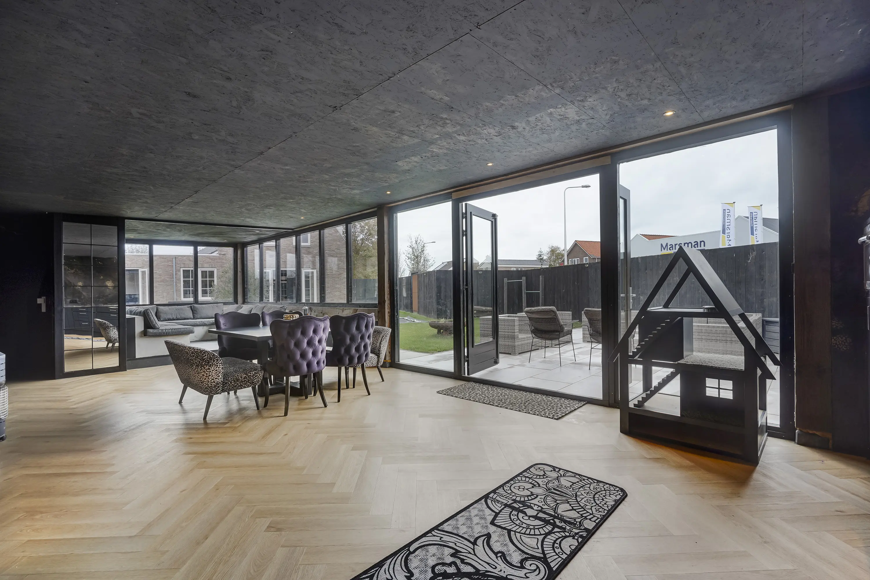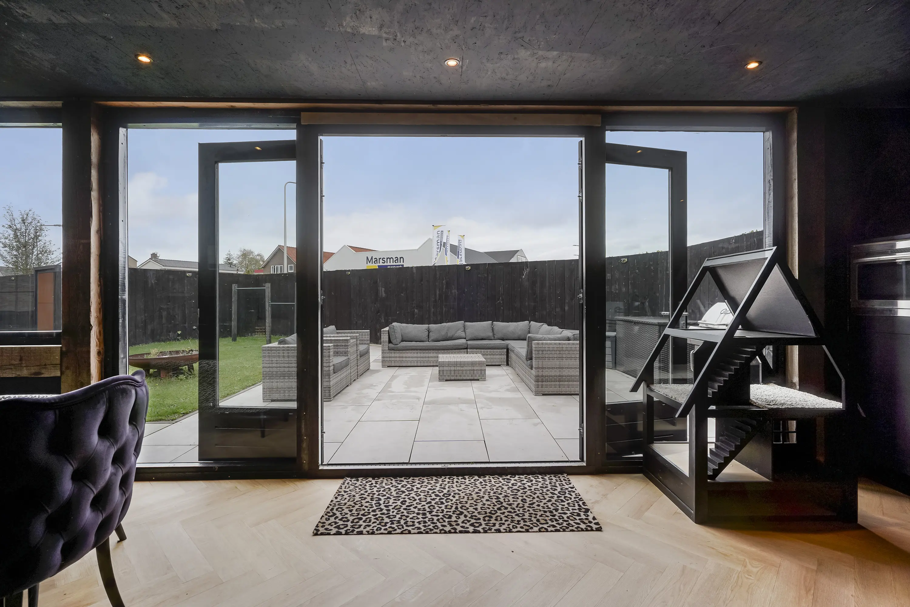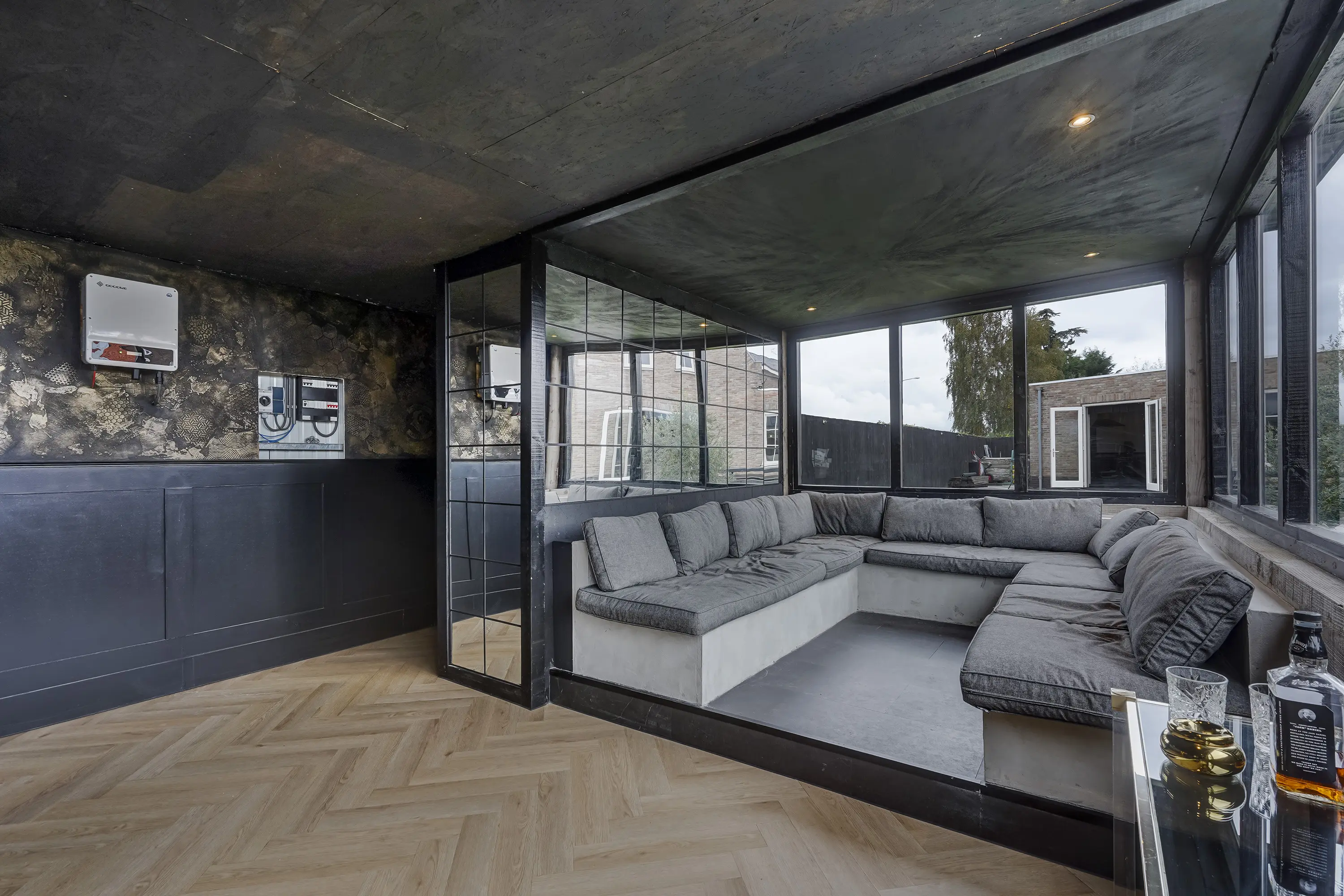 Bijna de gehele lange zijde van het tuinhuis bestaat uit glas, waardoor dit een lichte ruimte betreft met uitzicht op de tuin en de woning.