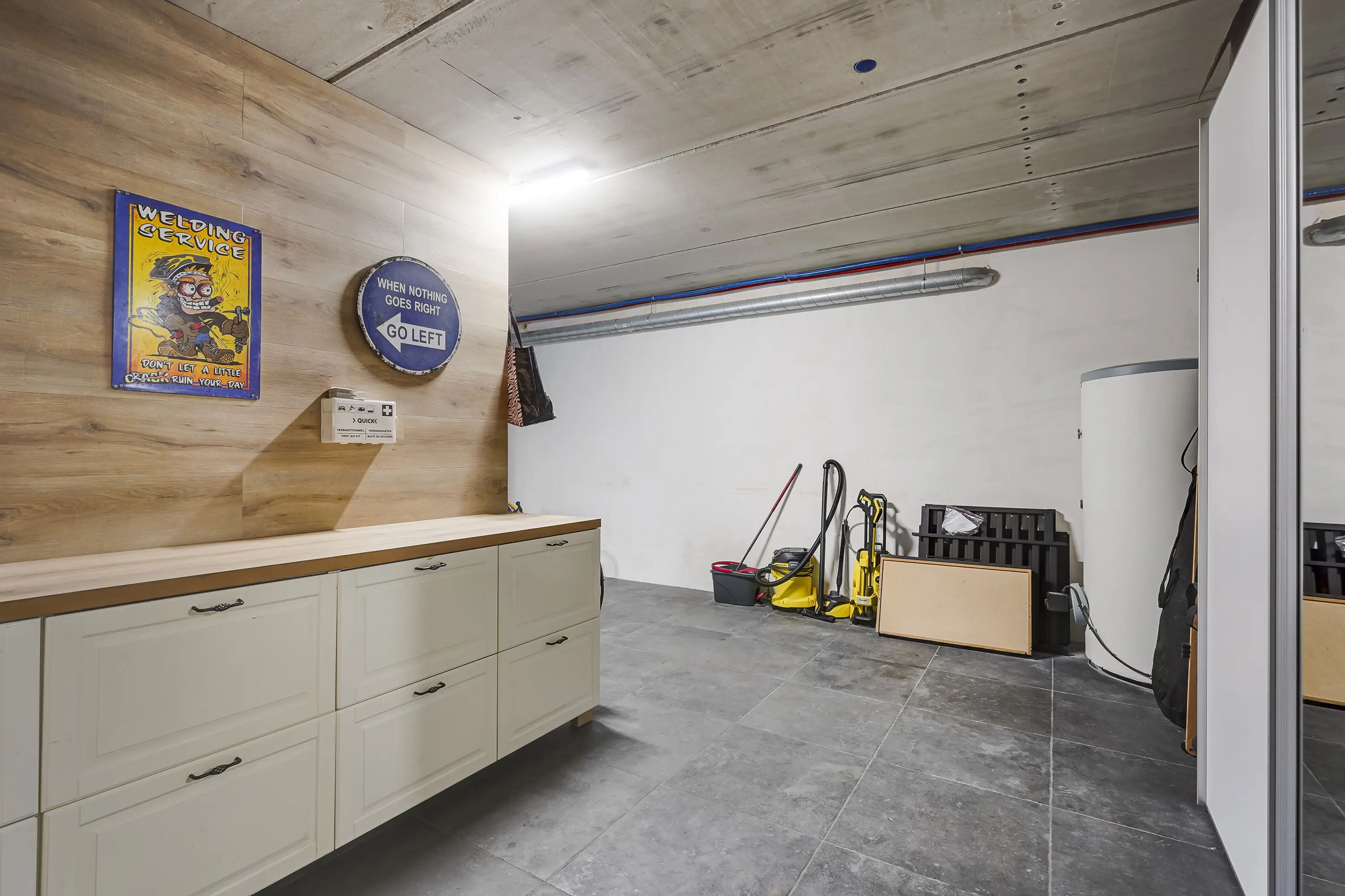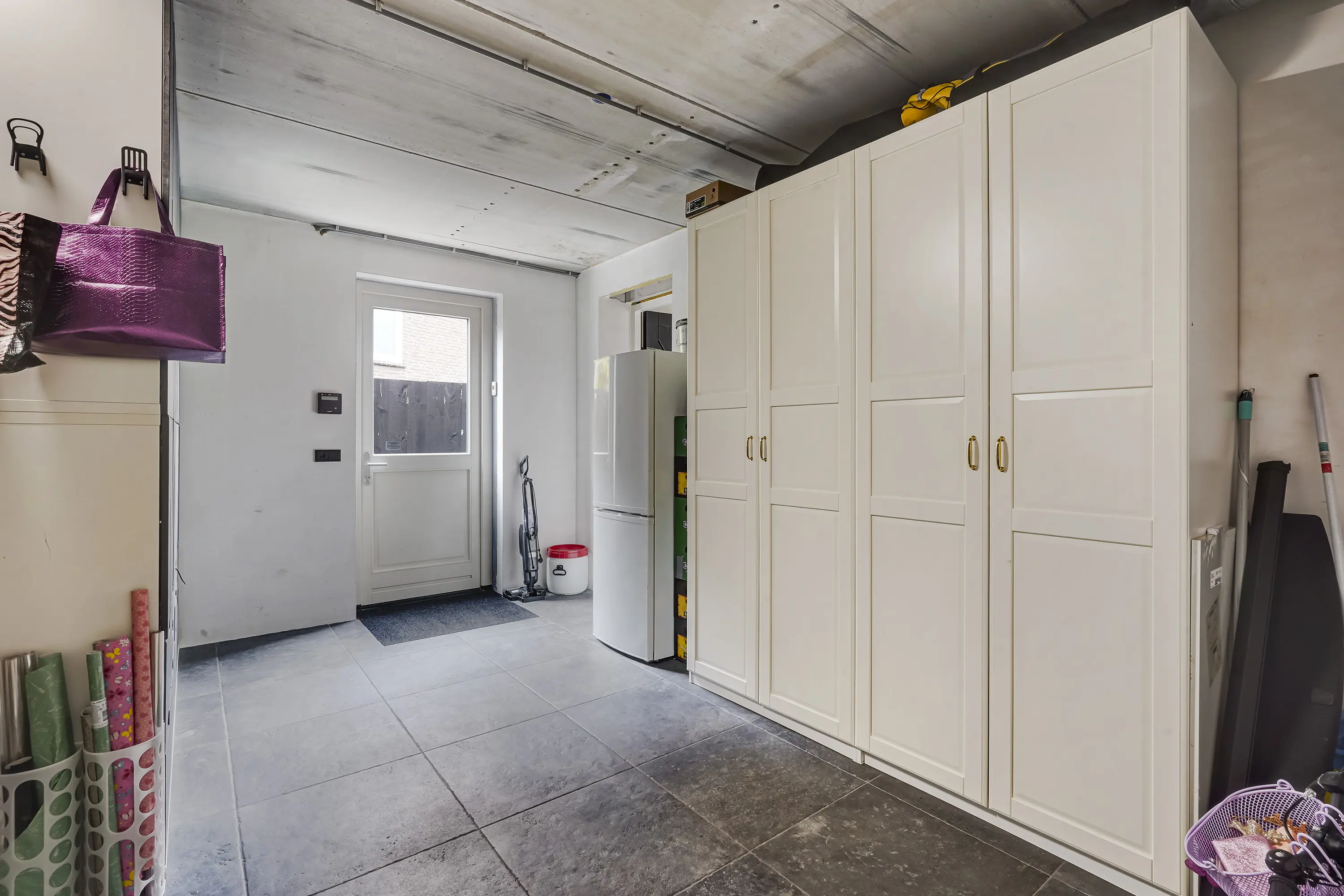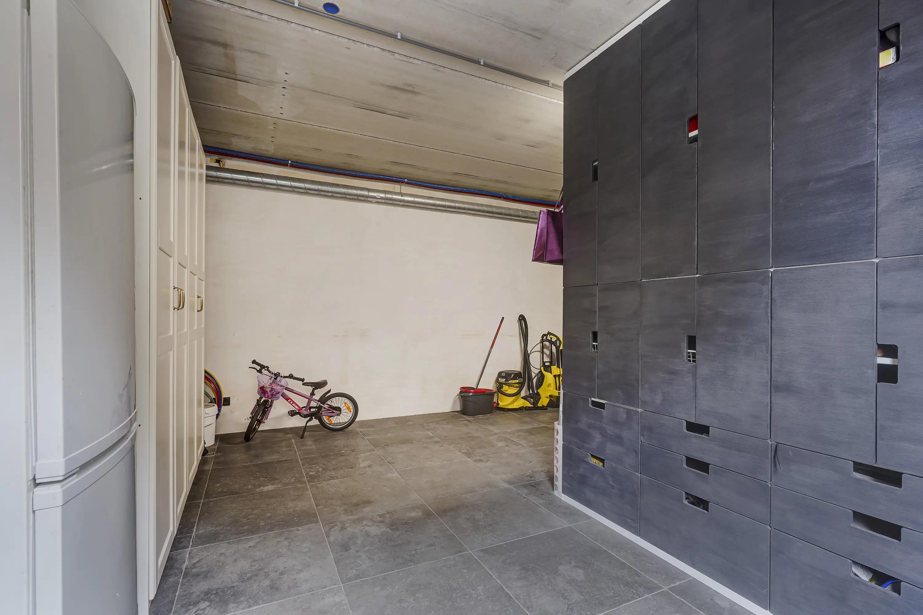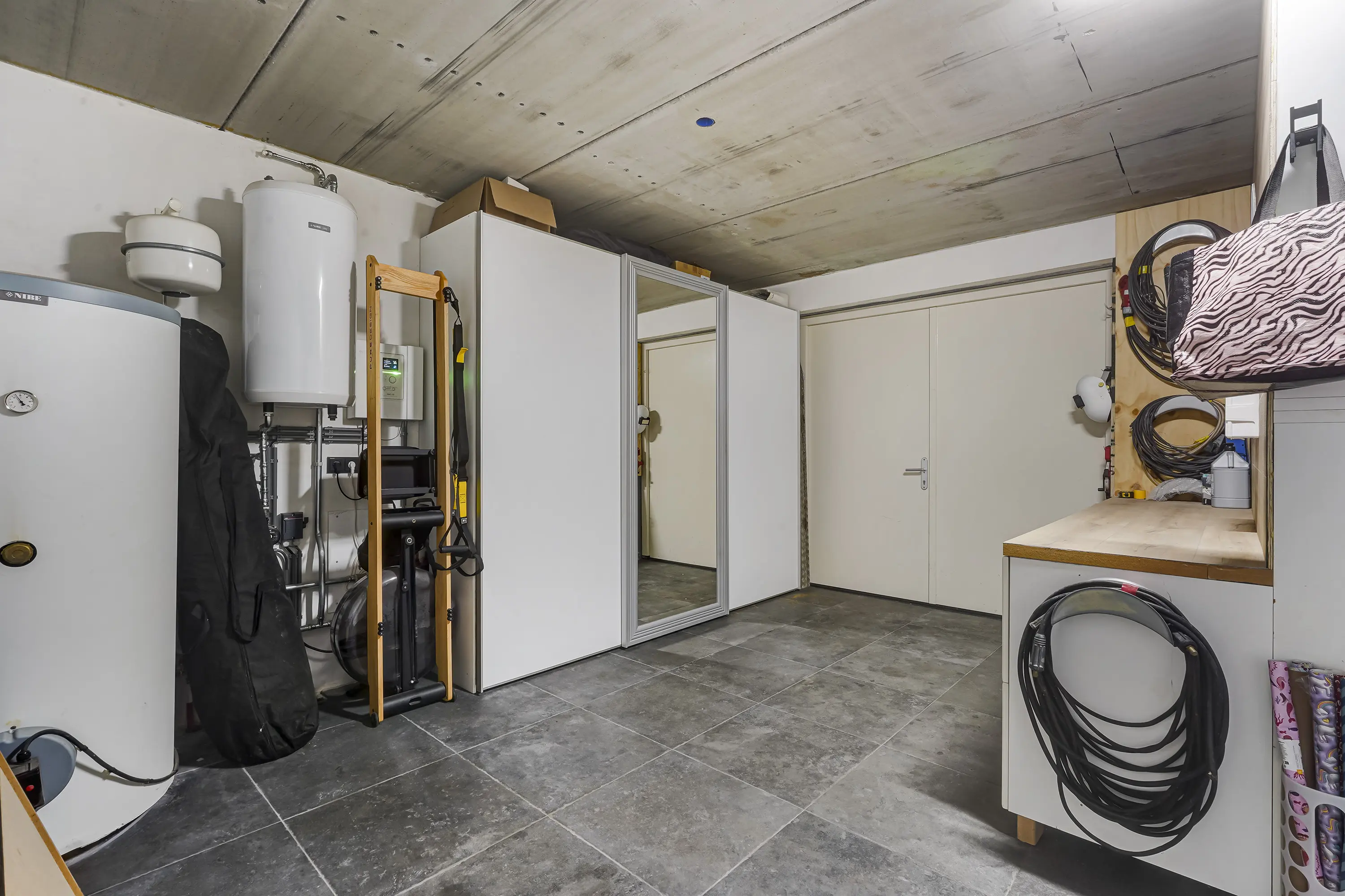 Aangrenzend aan de woonkamer is een praktische en royale bergruimte te bereiken, met zowel een separate toegangsdeur van buitenaf als openslaande deuren. Deze ruimte leent zich uitstekend voor het opbergen van fietsen en tuinspullen, maar ook voor regenkleding, sporttassen en gereedschap. De berging beschikt over diverse vaste kasten en betreft eveneens de opstelplaats van de technische installaties van de woning. Tevens beschikt de berging over een handige werkbank.