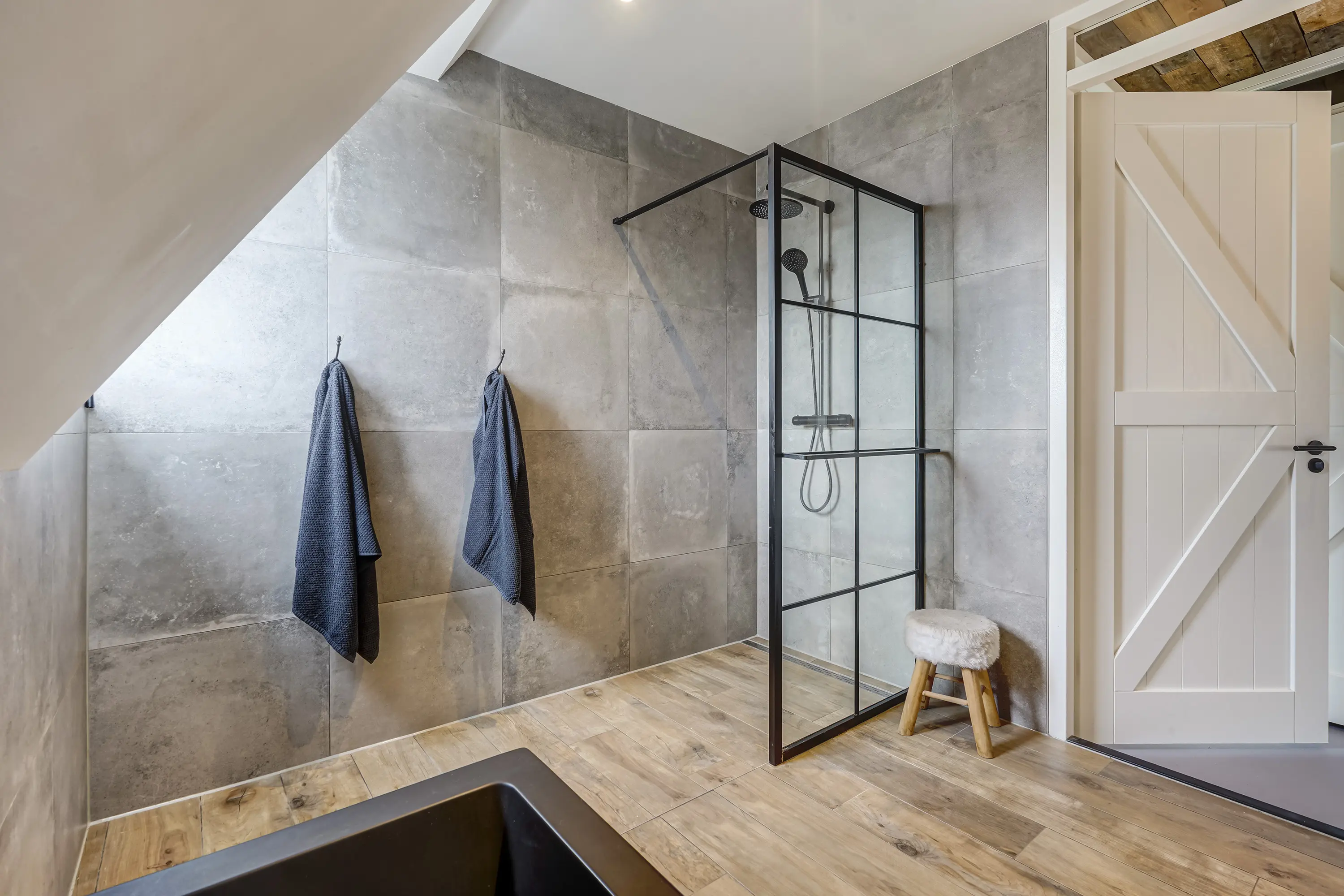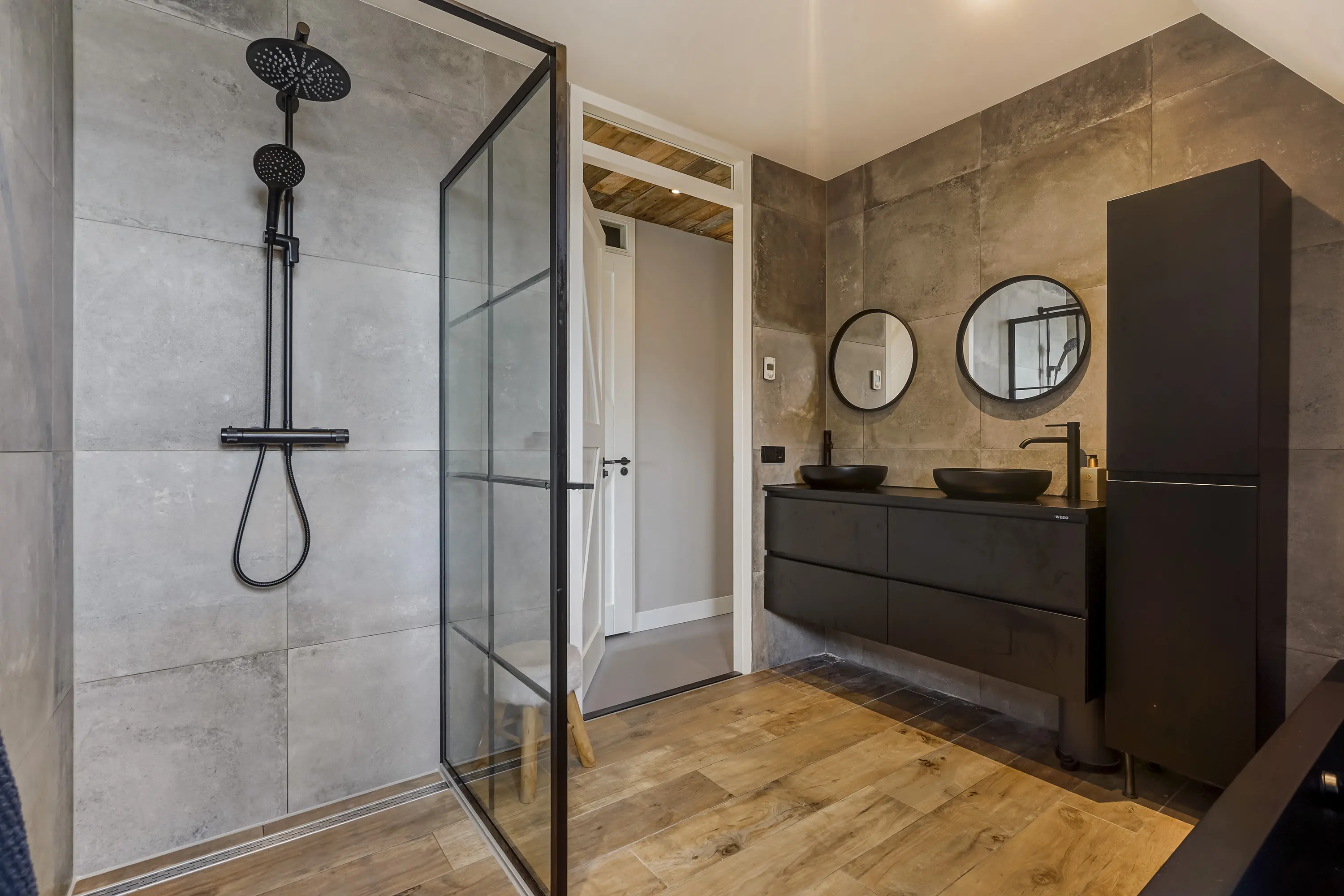In de badkamer kunt u heerlijk genieten van een warm bad of warme douche. Deze ruimte is volledig betegeld en heeft een groot wastafelmeubel met dubbele waskom en vaste kastruimte en berglades.