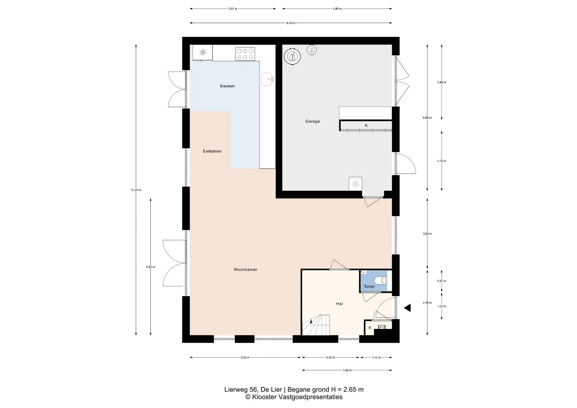 Zowel in de keuken als in de woonkamer zijn de wanden strak gestuukt en is er veel daglicht middels de grote raampartijen en dubbele openslaande deuren naar de tuin.