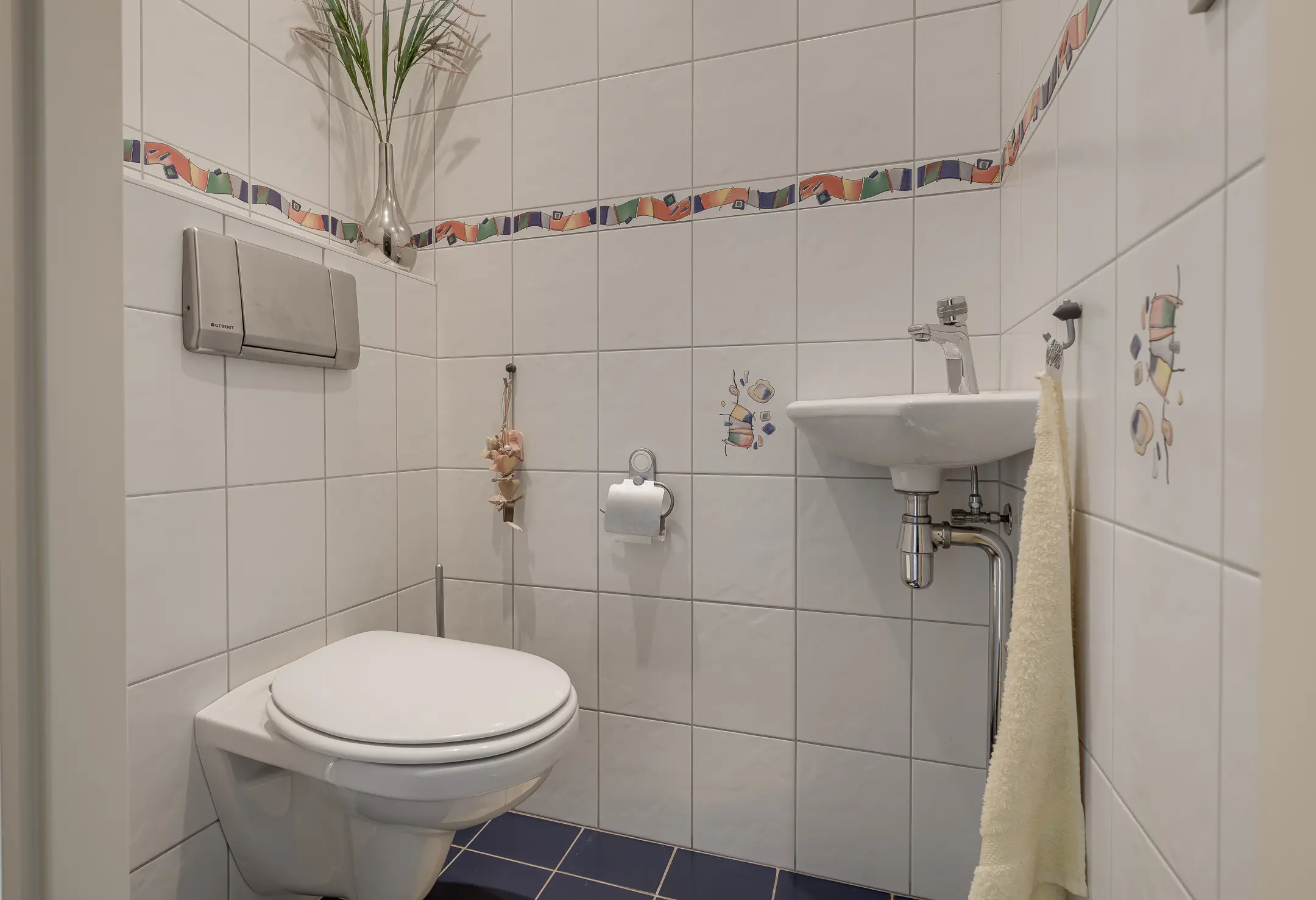 Direct aan de rechterzijde bevindt zich de meterkast met 7 groepen. Aan de linkerzijde van de entree vindt u het toilet met fonteintje.
