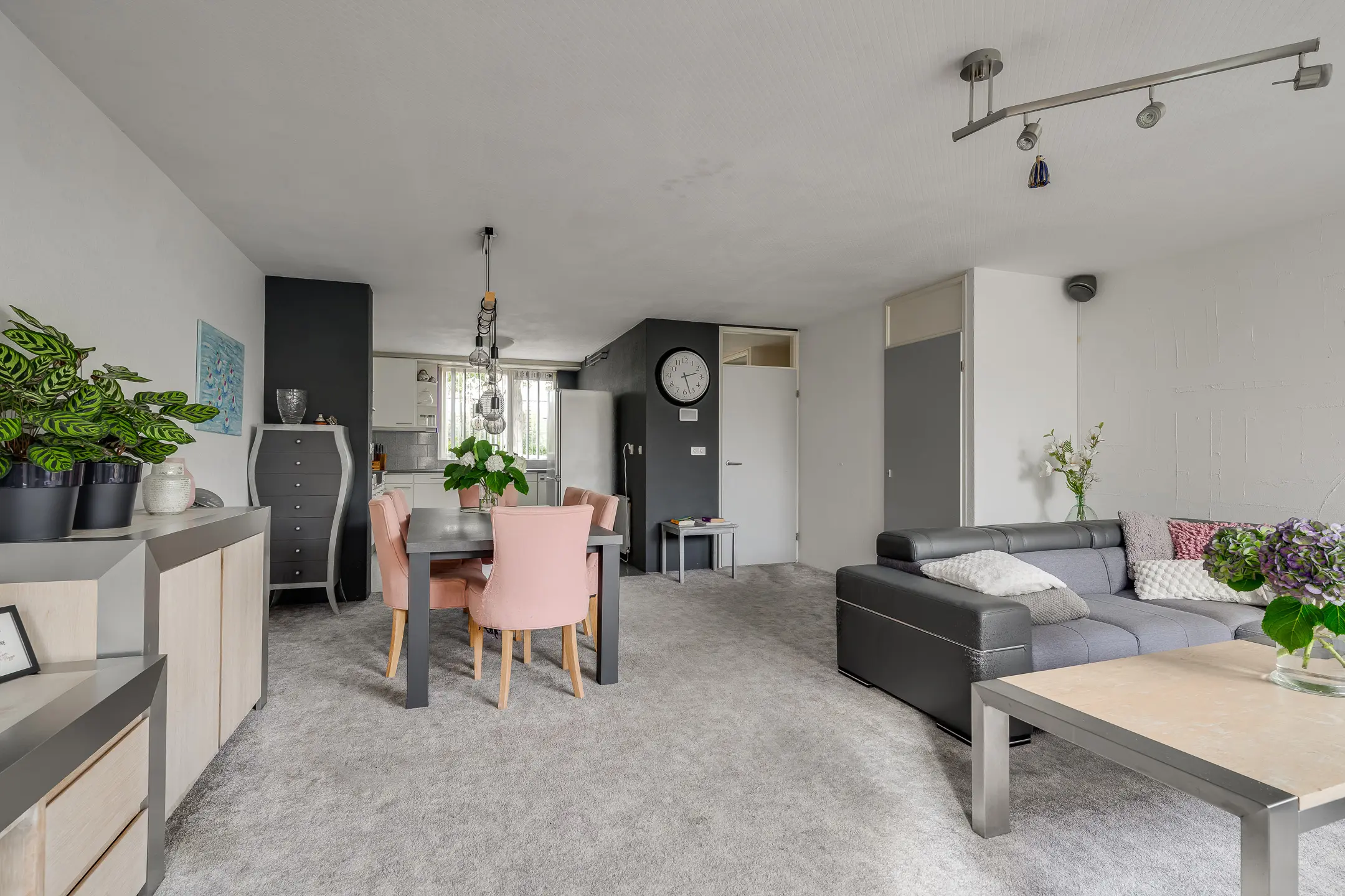 De open keuken sluit aan op de woonkamer en vormt samen met de eetkamer het voorste gedeelte van de ruimte. Aan de achterzijde van de woning bevindt zich het zitgedeelte.