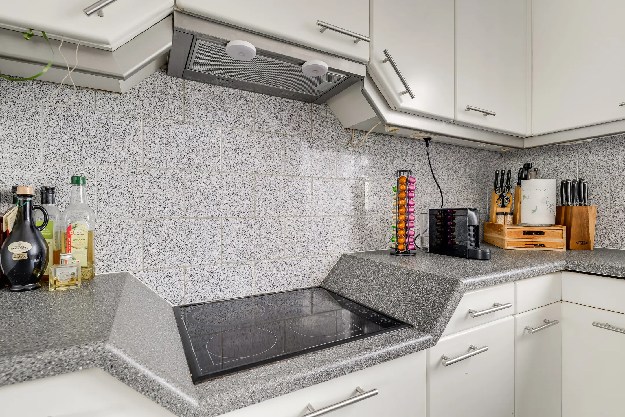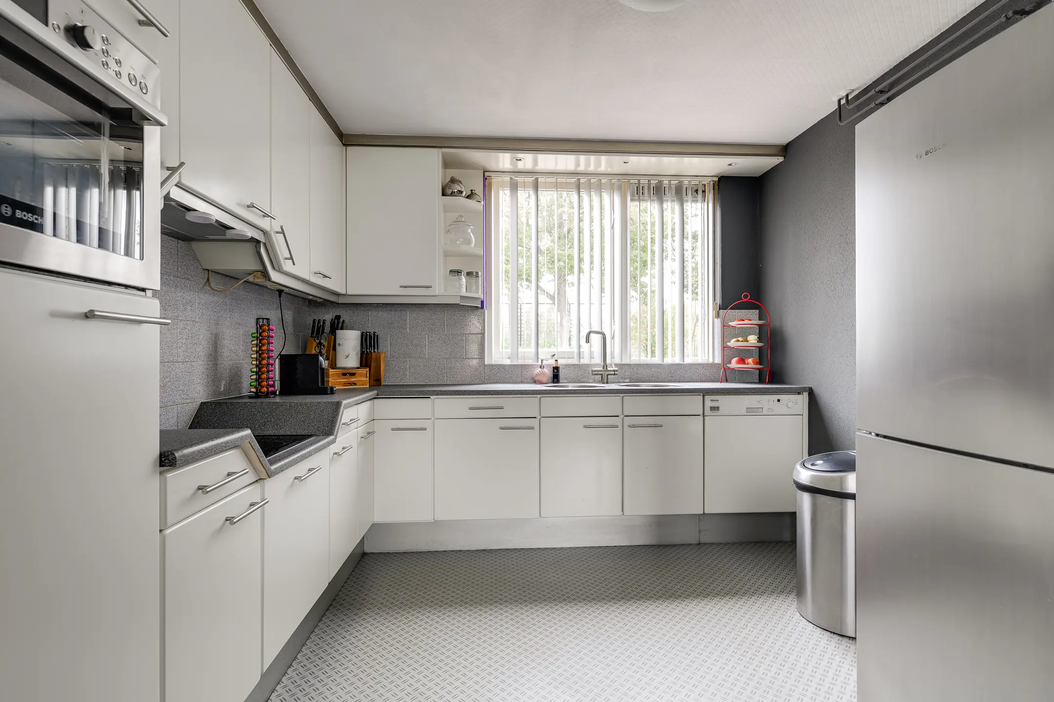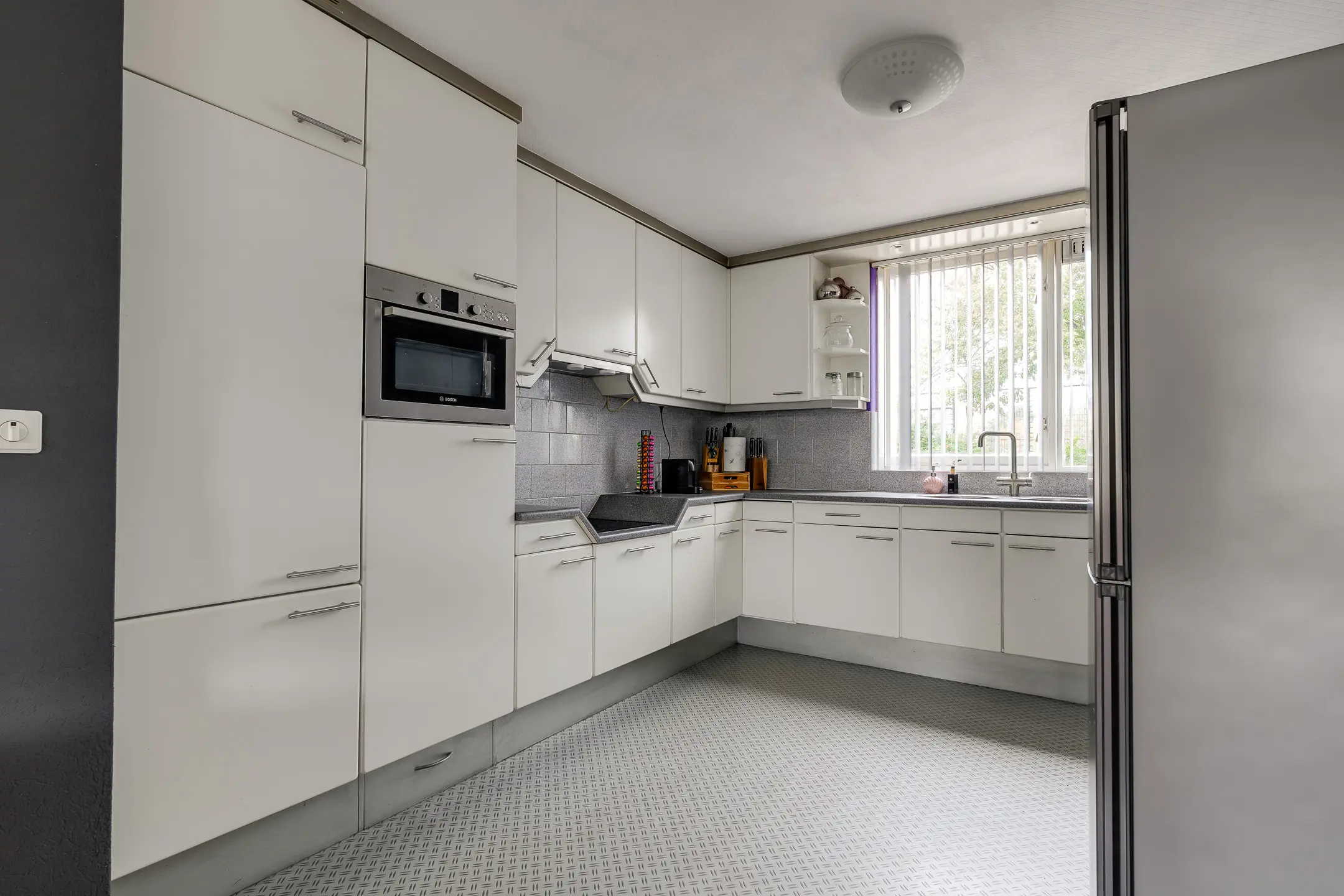 De keuken is voorzien van een keramische kookplaat en een vrijstaande koel-/vriescombinatie. Daarnaast is er in de woonkamer nog een extra kast voor opslag, gesitueerd onder de trap naar de eerste verdieping.