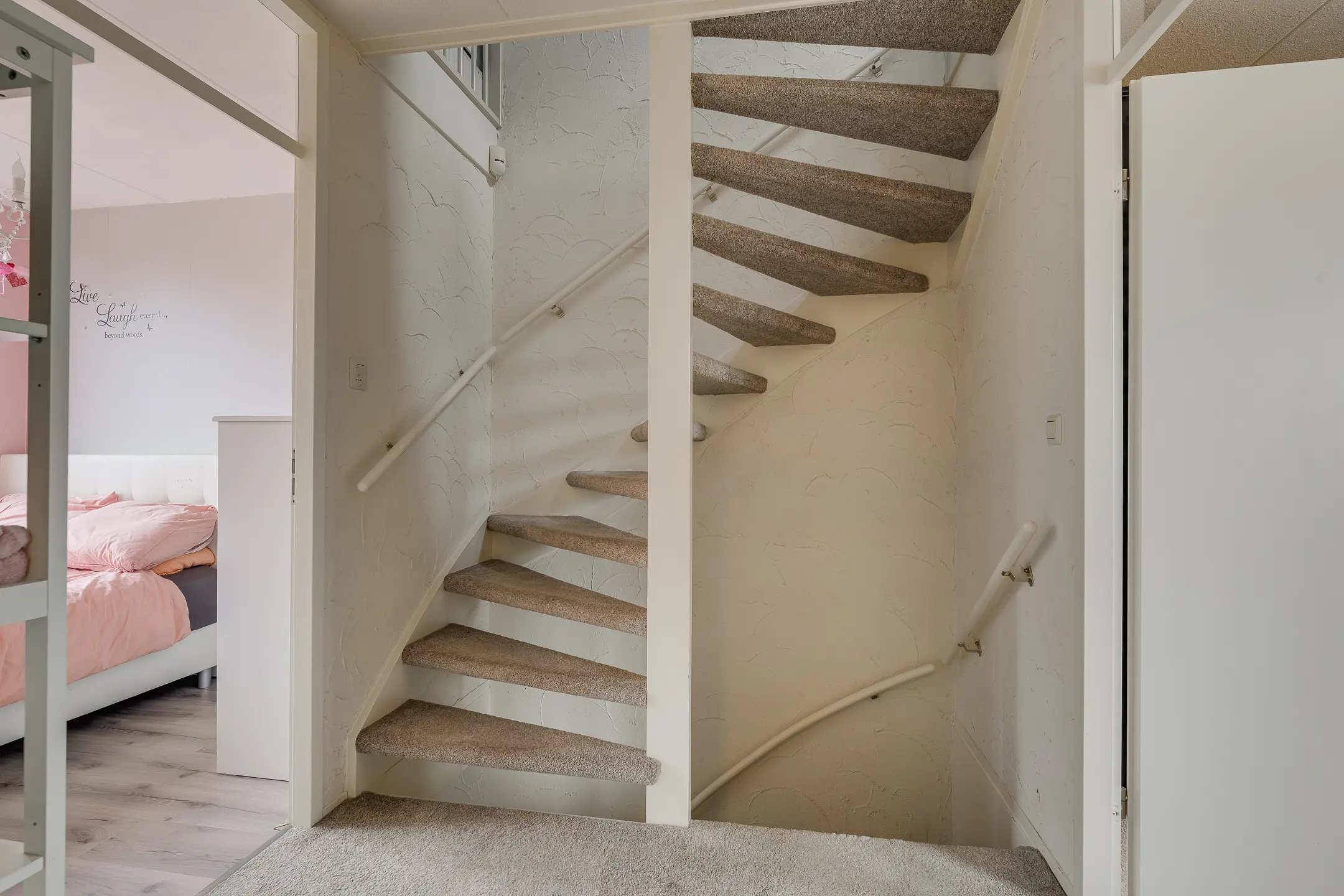 Recht tegenover de voordeur bevindt zich links de trap naar de eerste verdieping, en rechts de deur naar de woonkamer.