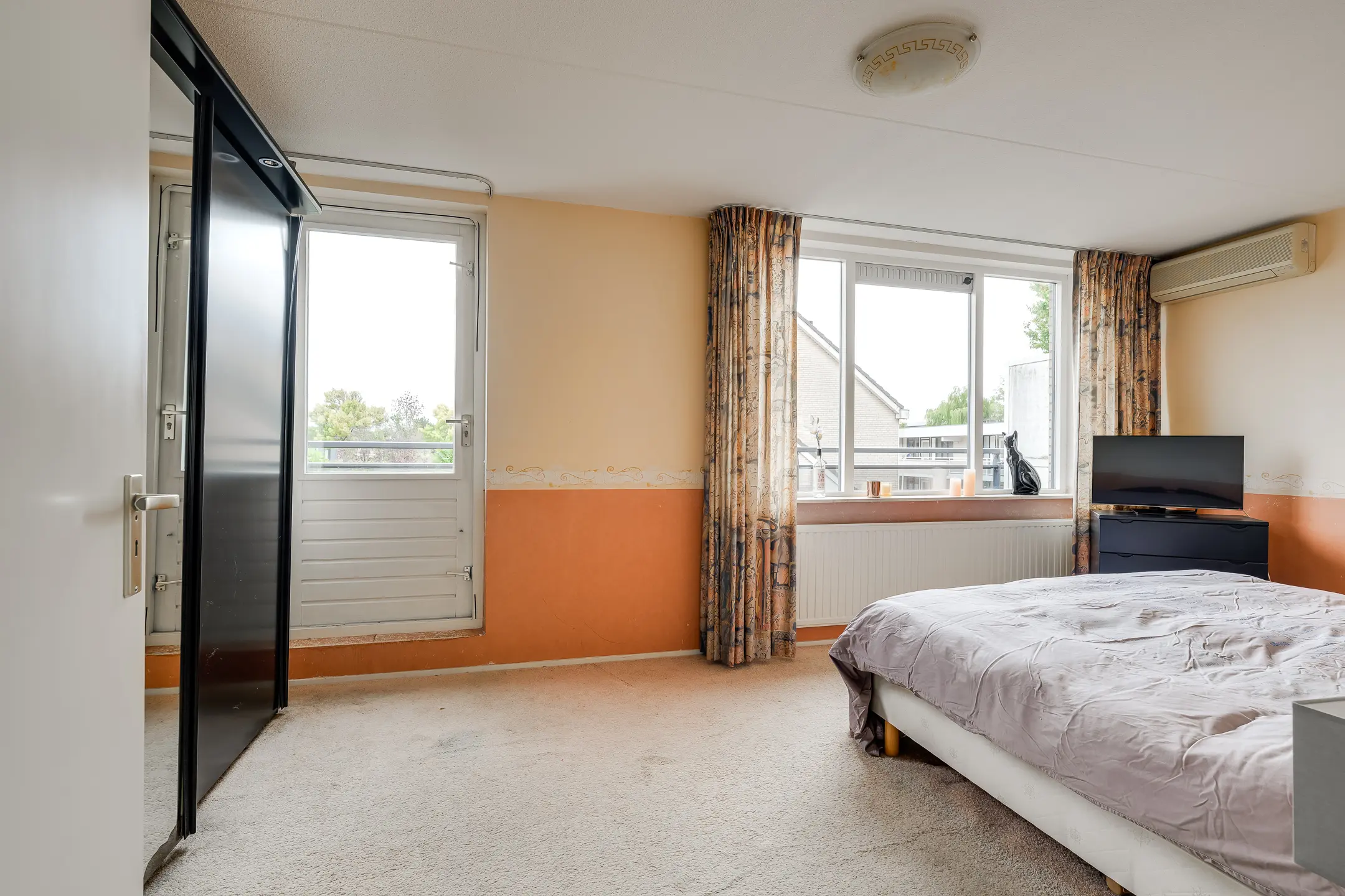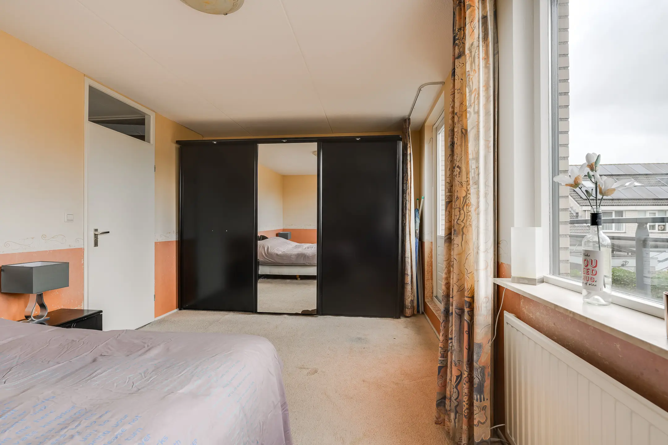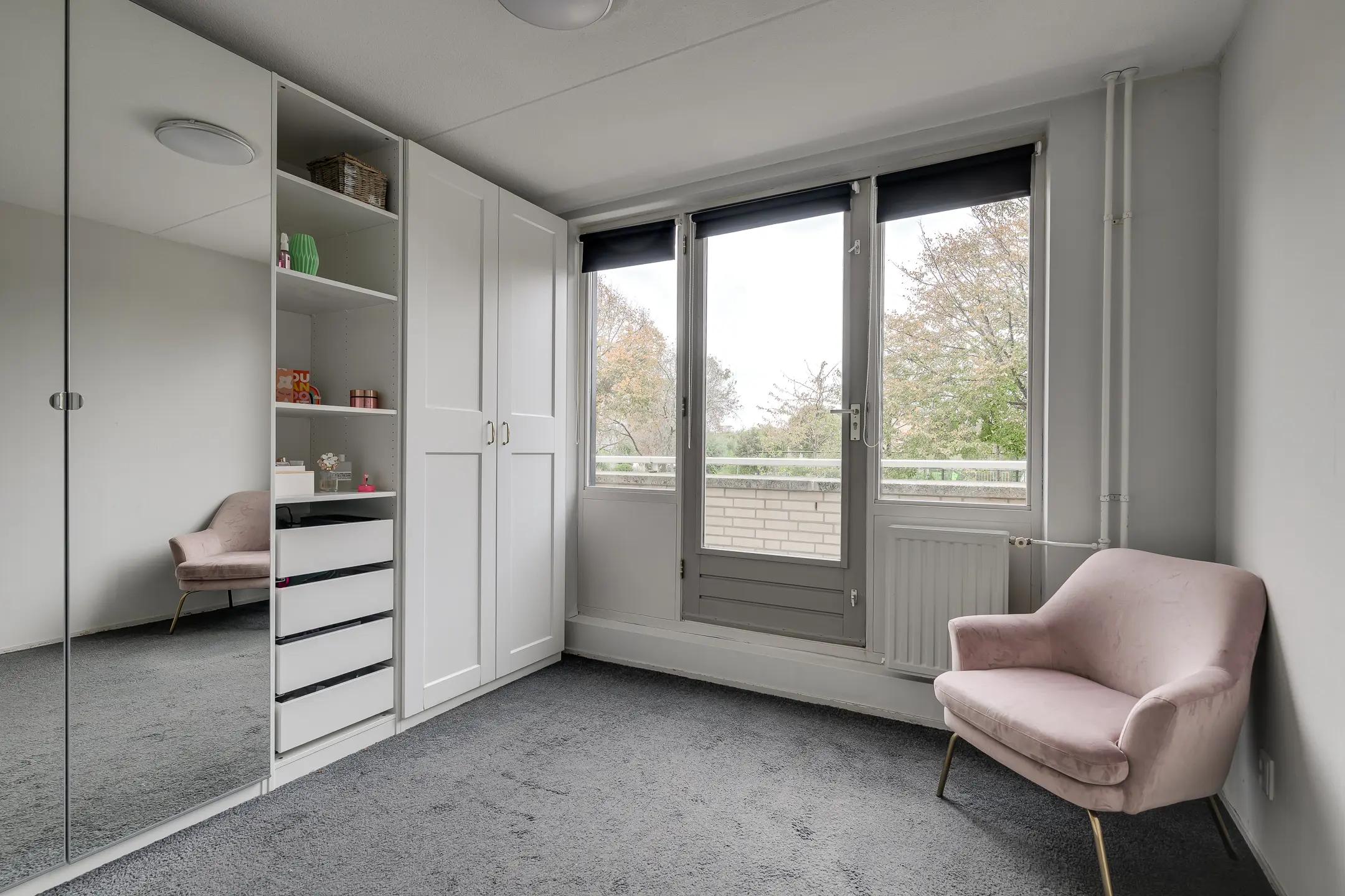 Aan de voorzijde van de woning bevinden zich de twee resterende slaapkamers. De linker kamer is knus en voorzien van een grote raampartij, wat zorgt voor een aangename lichtinval. De andere kamer aan de voorzijde wordt momenteel gebruikt als inloopkast, maar is uitstekend geschikt als volwaardige slaapkamer. Vanuit deze kamer heeft u tevens toegang tot het balkon aan de voorzijde van de woning.