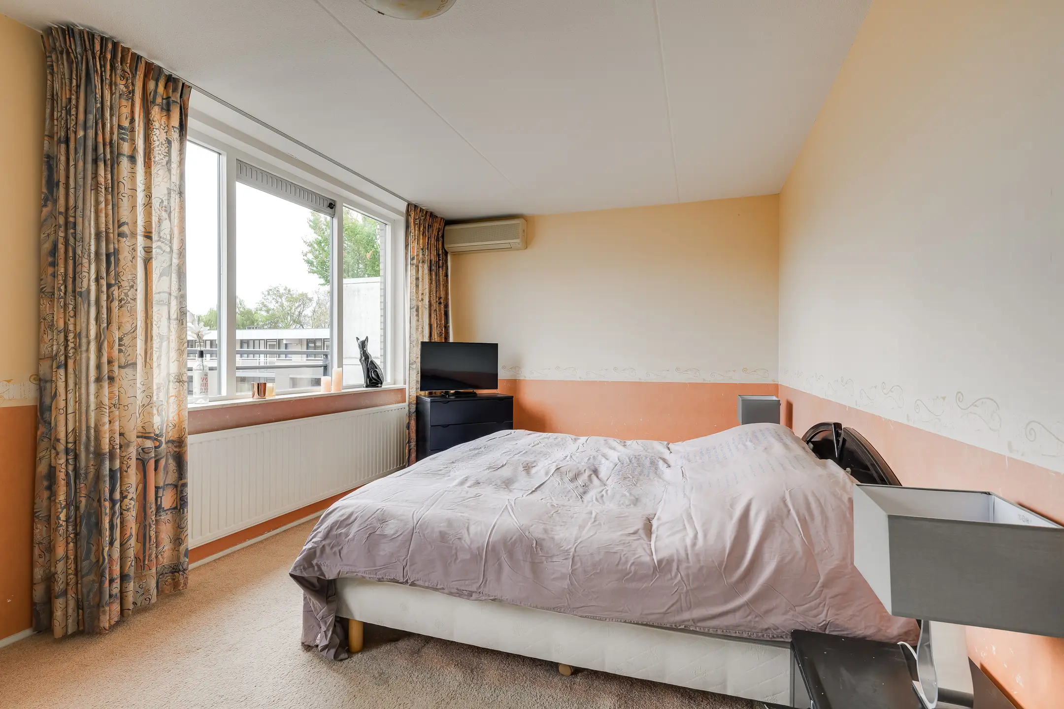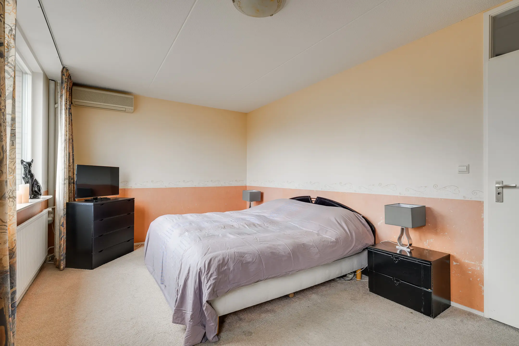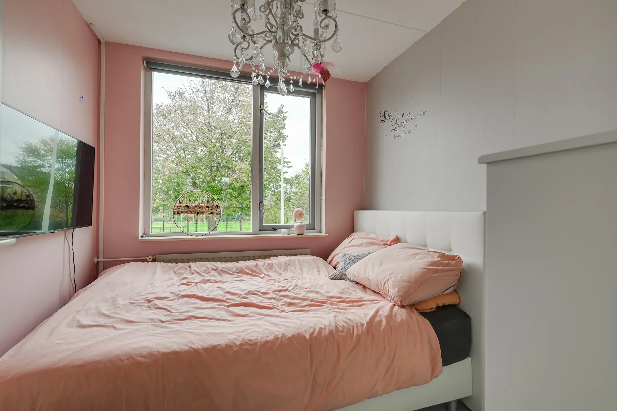 Aan de voorzijde van de woning bevinden zich de twee resterende slaapkamers. De linker kamer is knus en voorzien van een grote raampartij, wat zorgt voor een aangename lichtinval. De andere kamer aan de voorzijde wordt momenteel gebruikt als inloopkast, maar is uitstekend geschikt als volwaardige slaapkamer. Vanuit deze kamer heeft u tevens toegang tot het balkon aan de voorzijde van de woning.