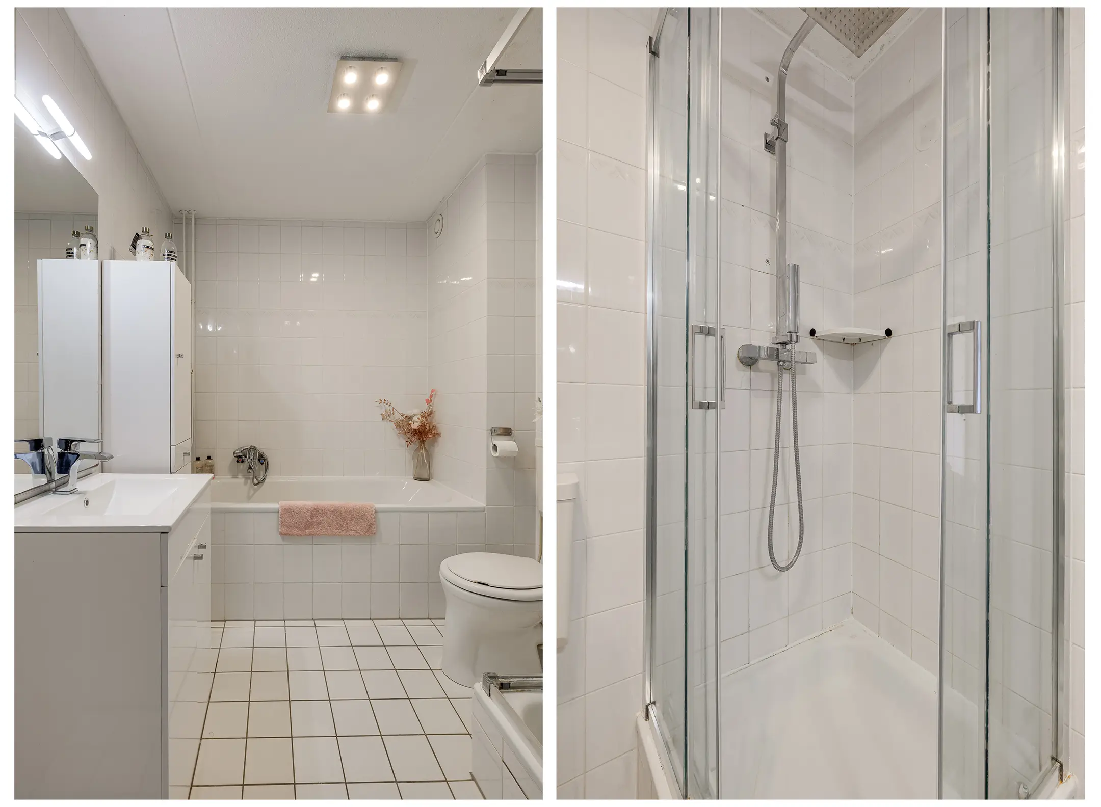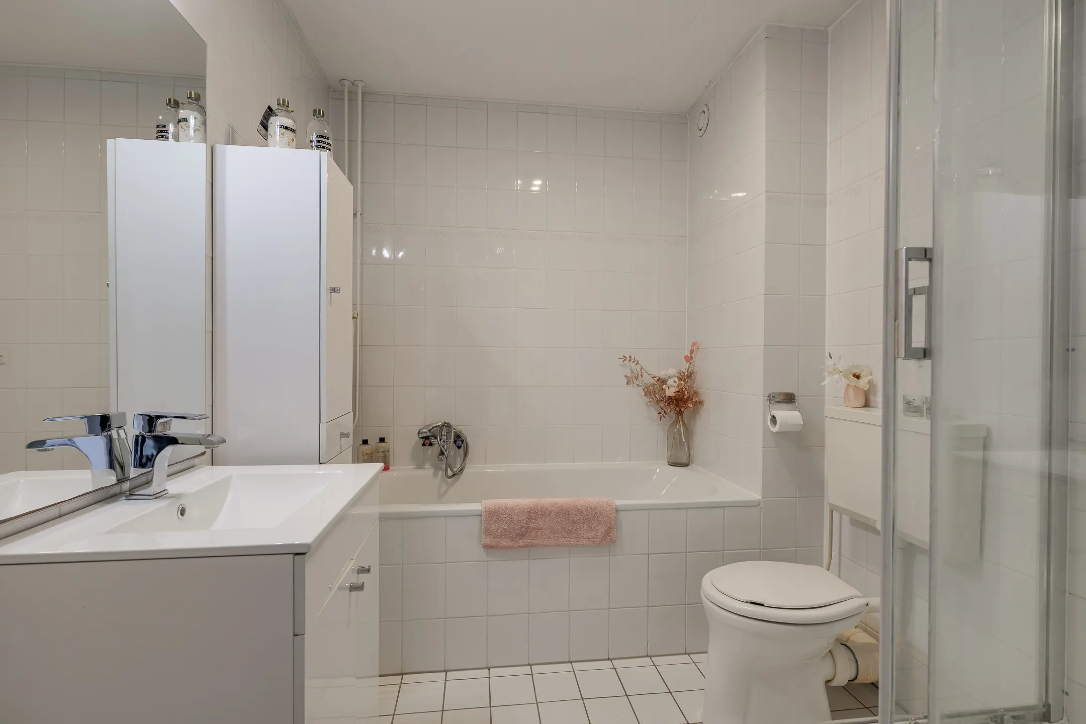 De badkamer is compleet uitgerust met een wastafelmeubel, een ligbad, een toilet en een aparte douche met zowel een gewone douchekop als een regendouche.