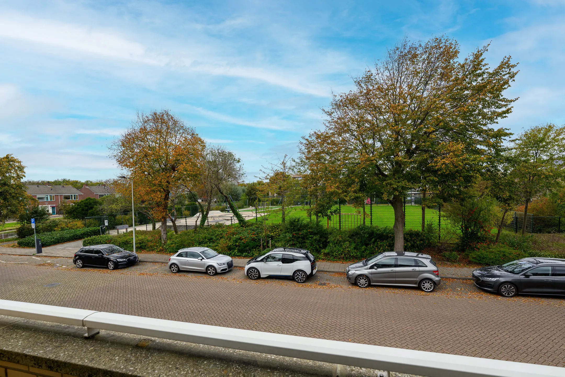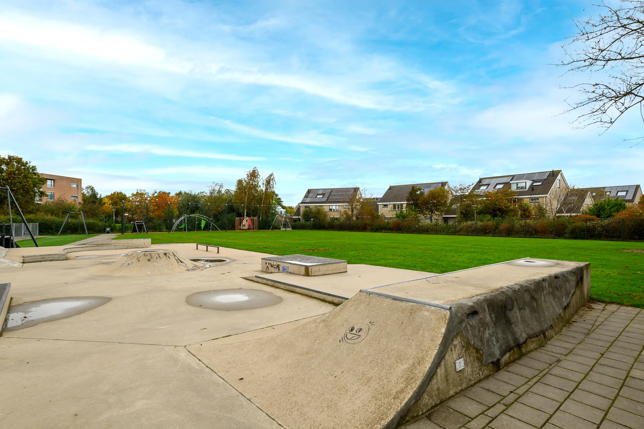 - Voorzijde met vrij uitzicht op een grasveld, speeltuin en skatebaan;