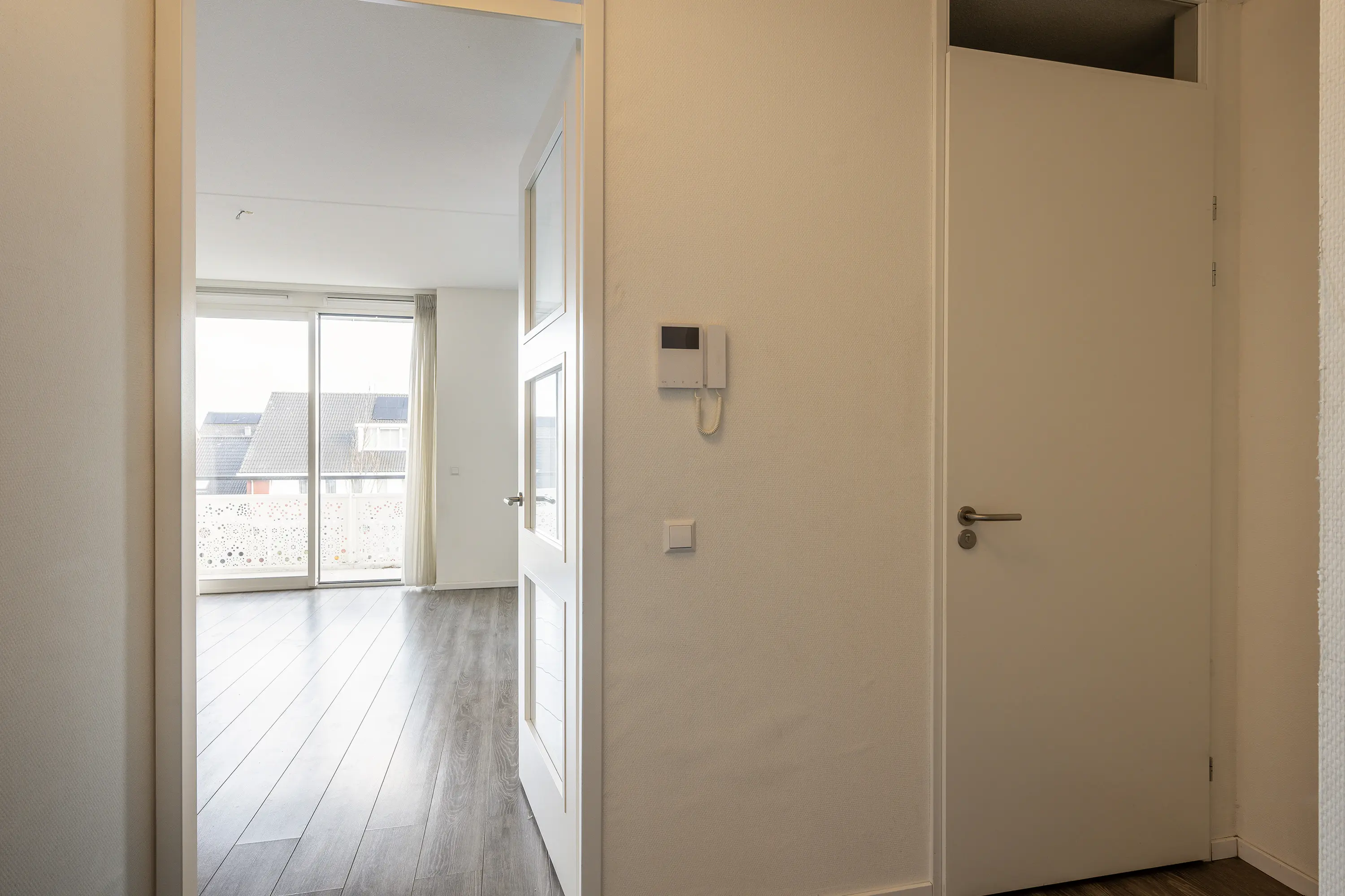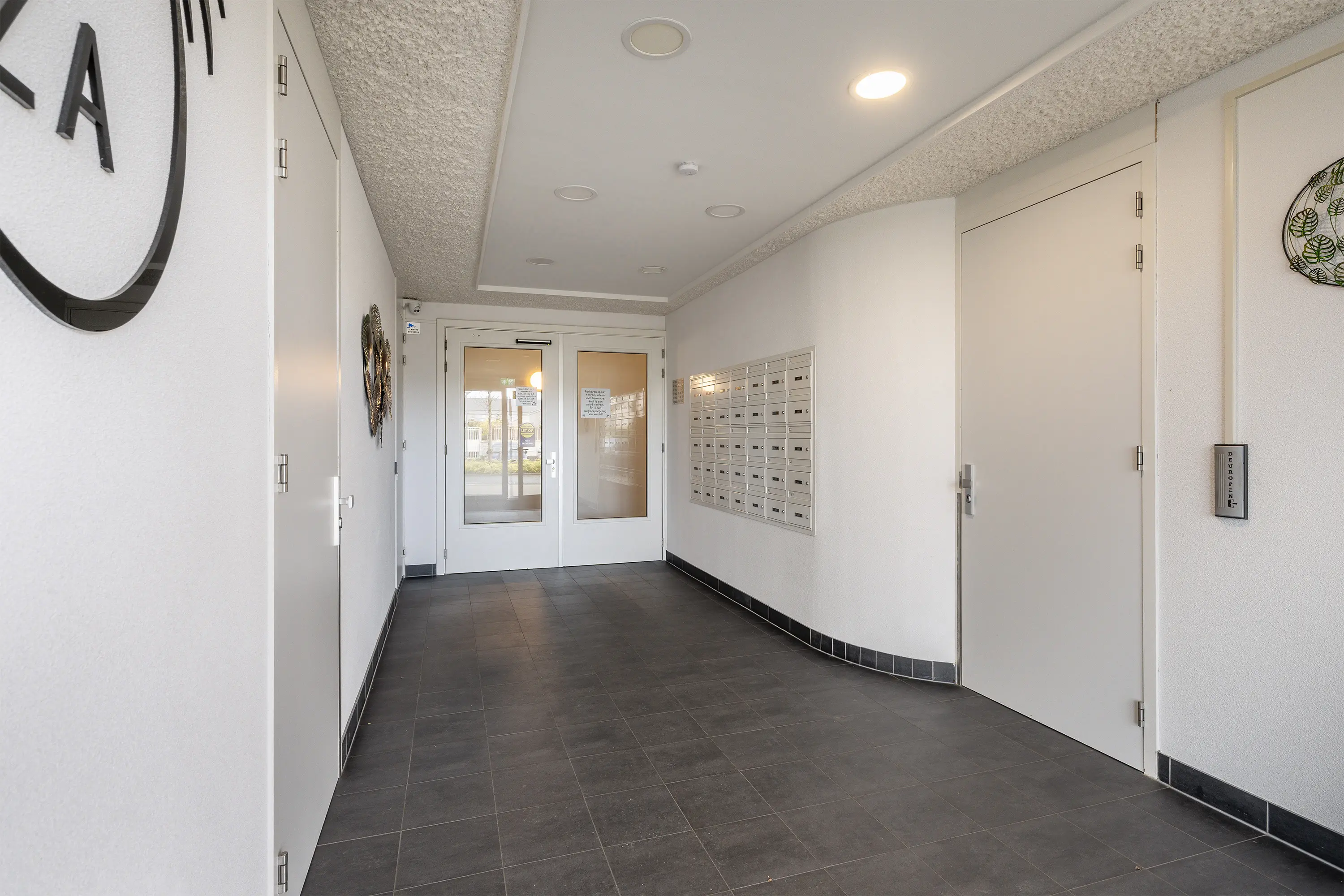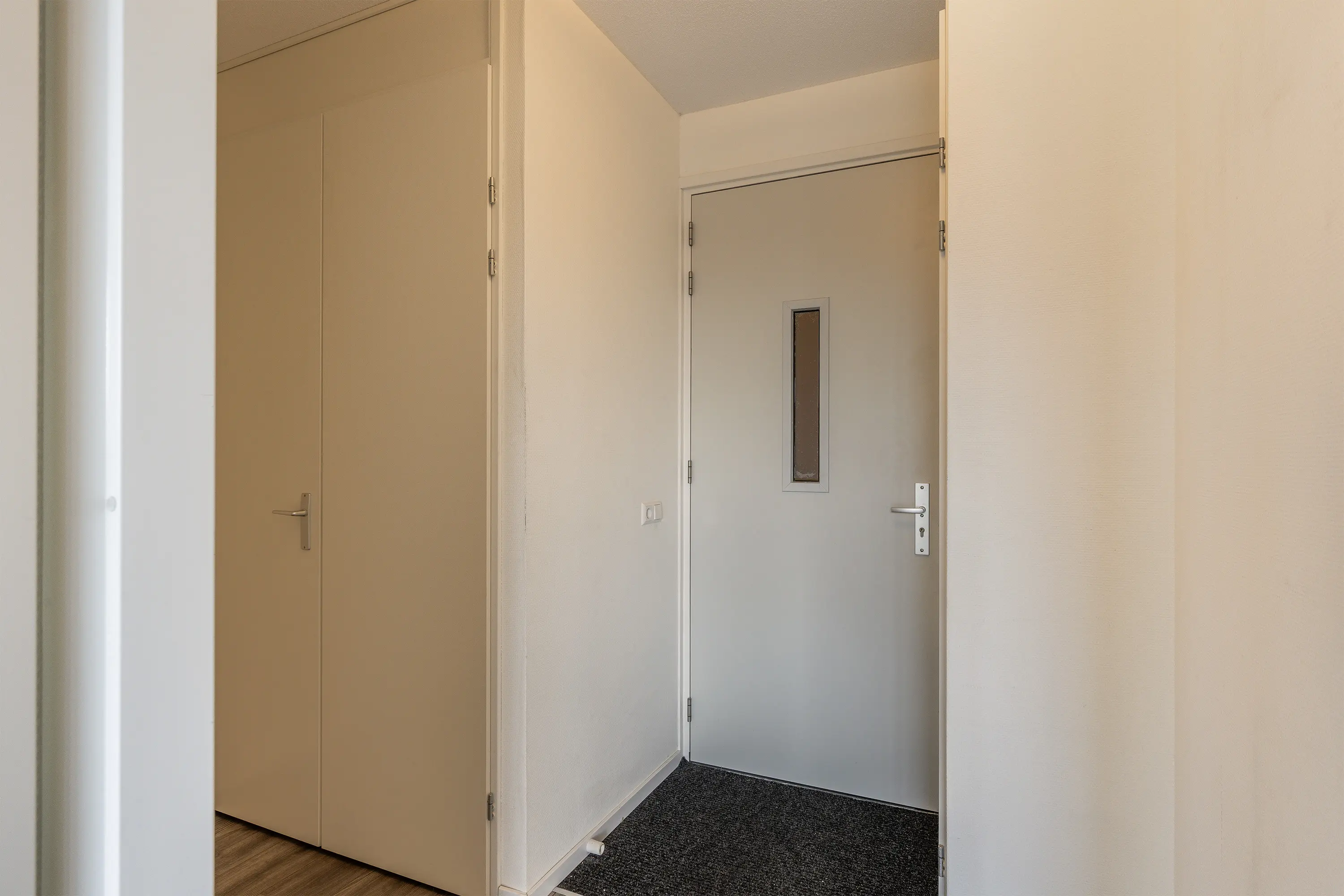 Voordeur/entree naar het appartement. Hal met toegang tot de vertrekken. Vaste bergkast met opstelplaats warmtepomp, mechanische ventilatie en wasmachineaansluiting.