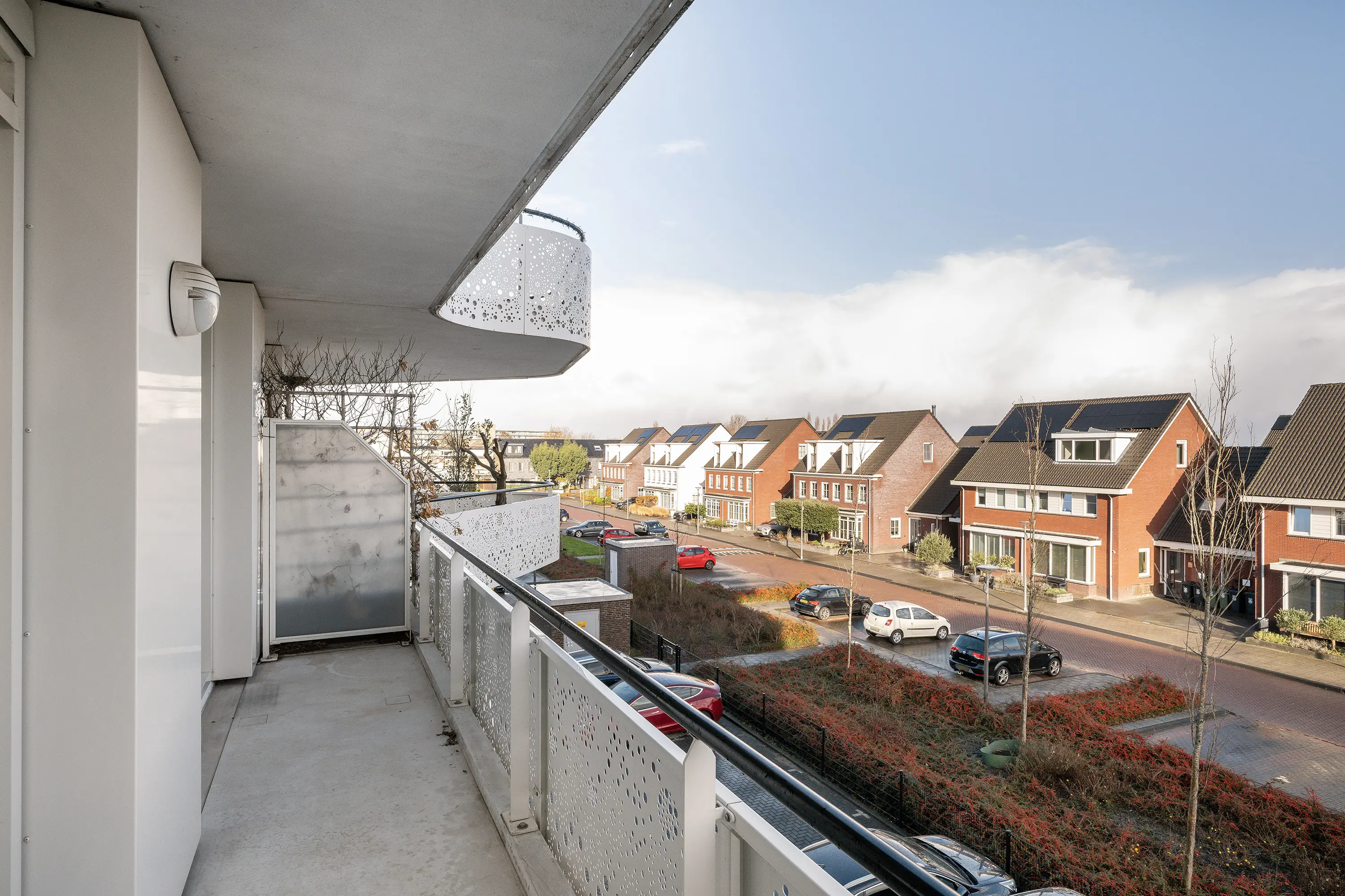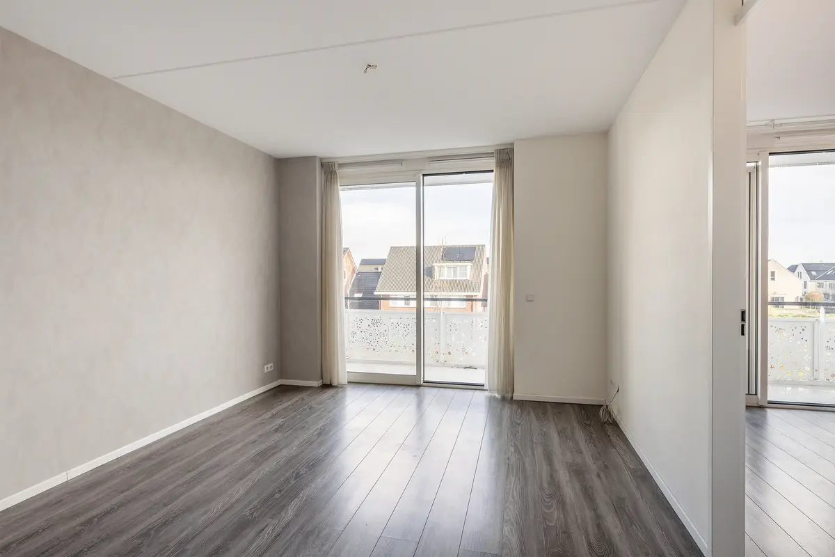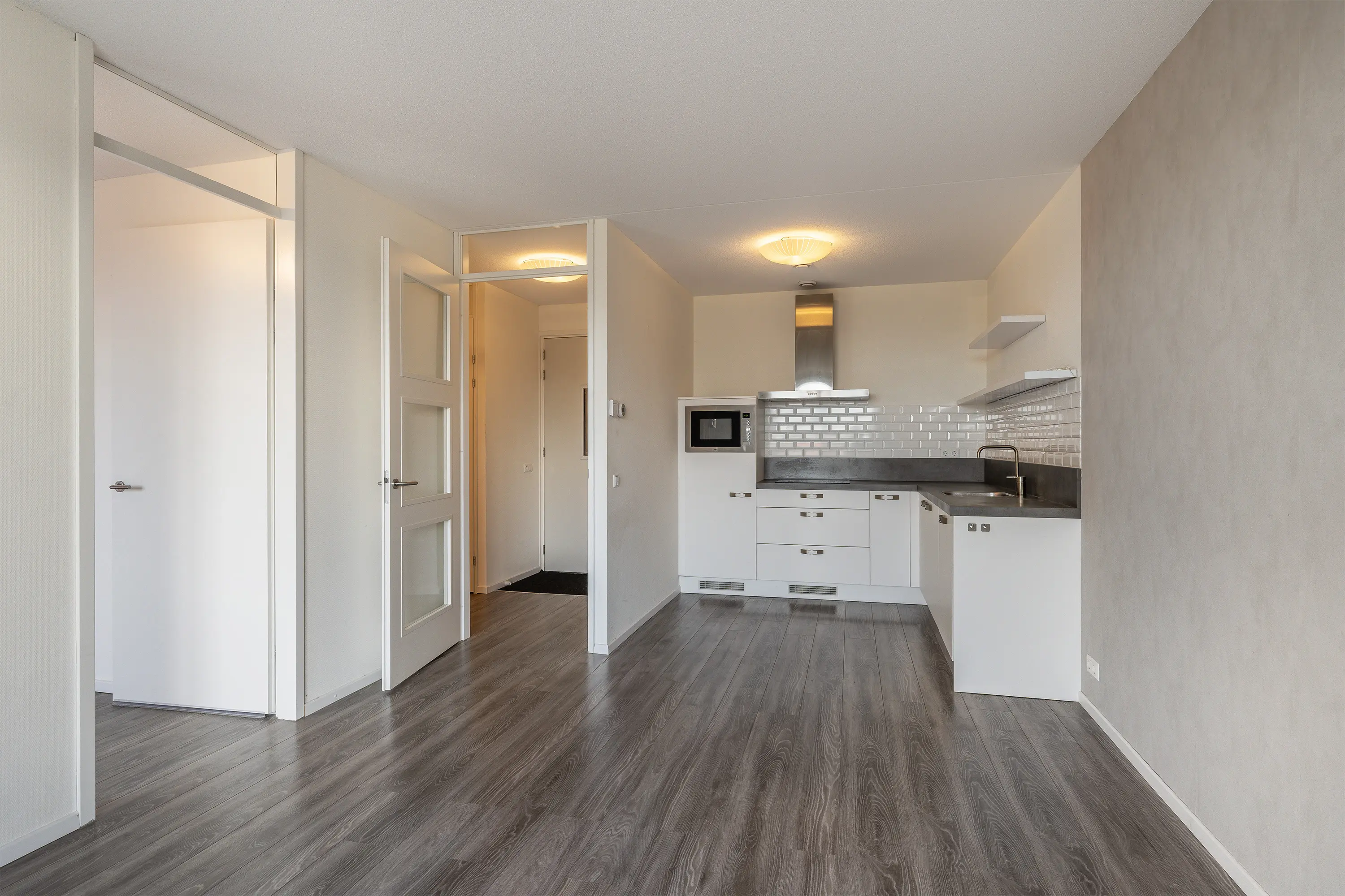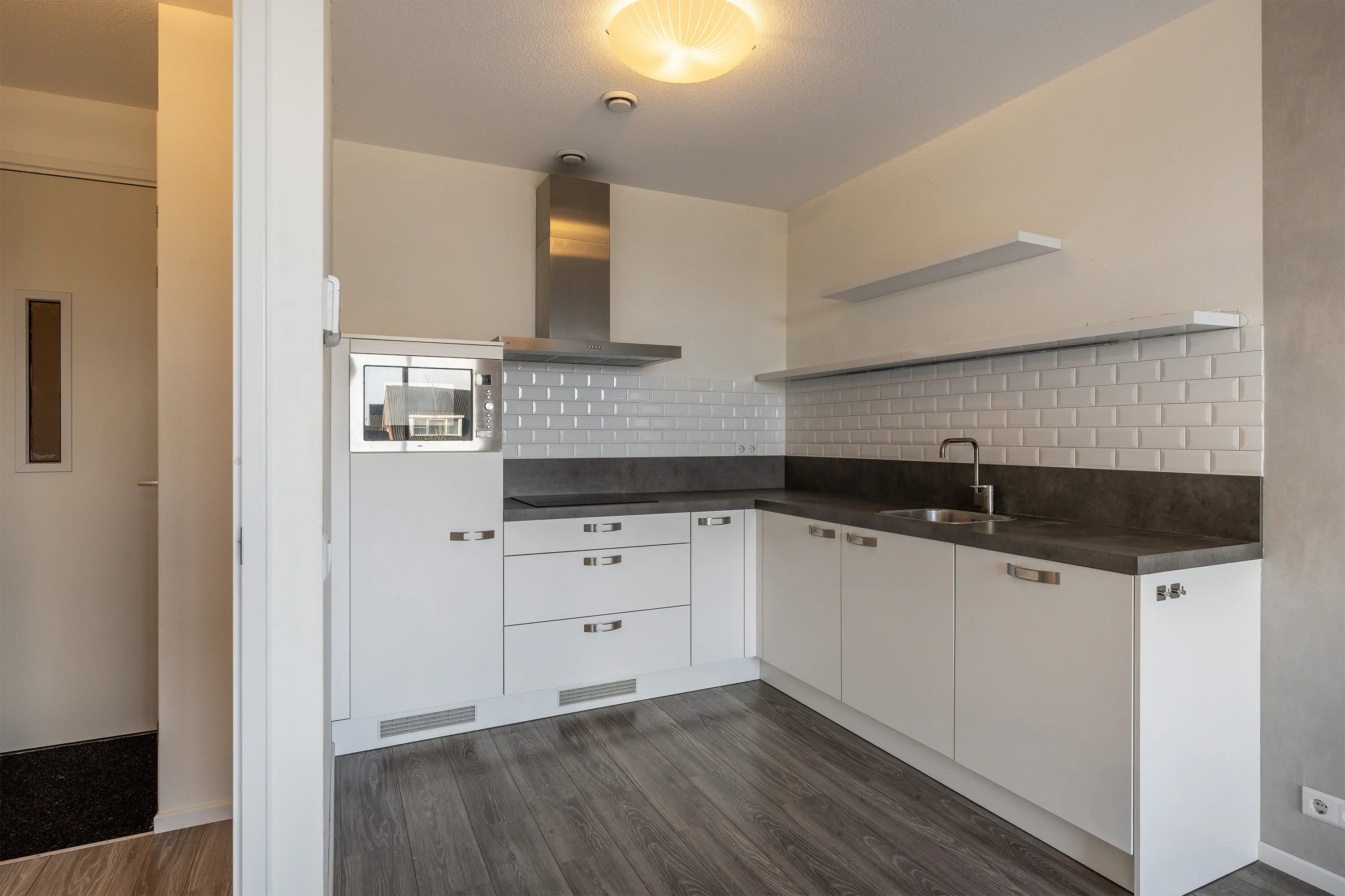 De woonkamer kenmerkt zich met een moderne open keuken in L-opstelling. De keuken is voorzien van een kunststof werkblad, spoelbak, inductie kookplaat, vaatwasser, koelkast met vriesvak en combi-oven. De woonkamer biedt middels een schuifpui toegang tot het balkon. Dit balkon is circa 10 m2 en heeft een oostelijke ligging. Vanuit de woonkamer bereikt u de slaapkamer, die eveneens toegang biedt tot het balkon.