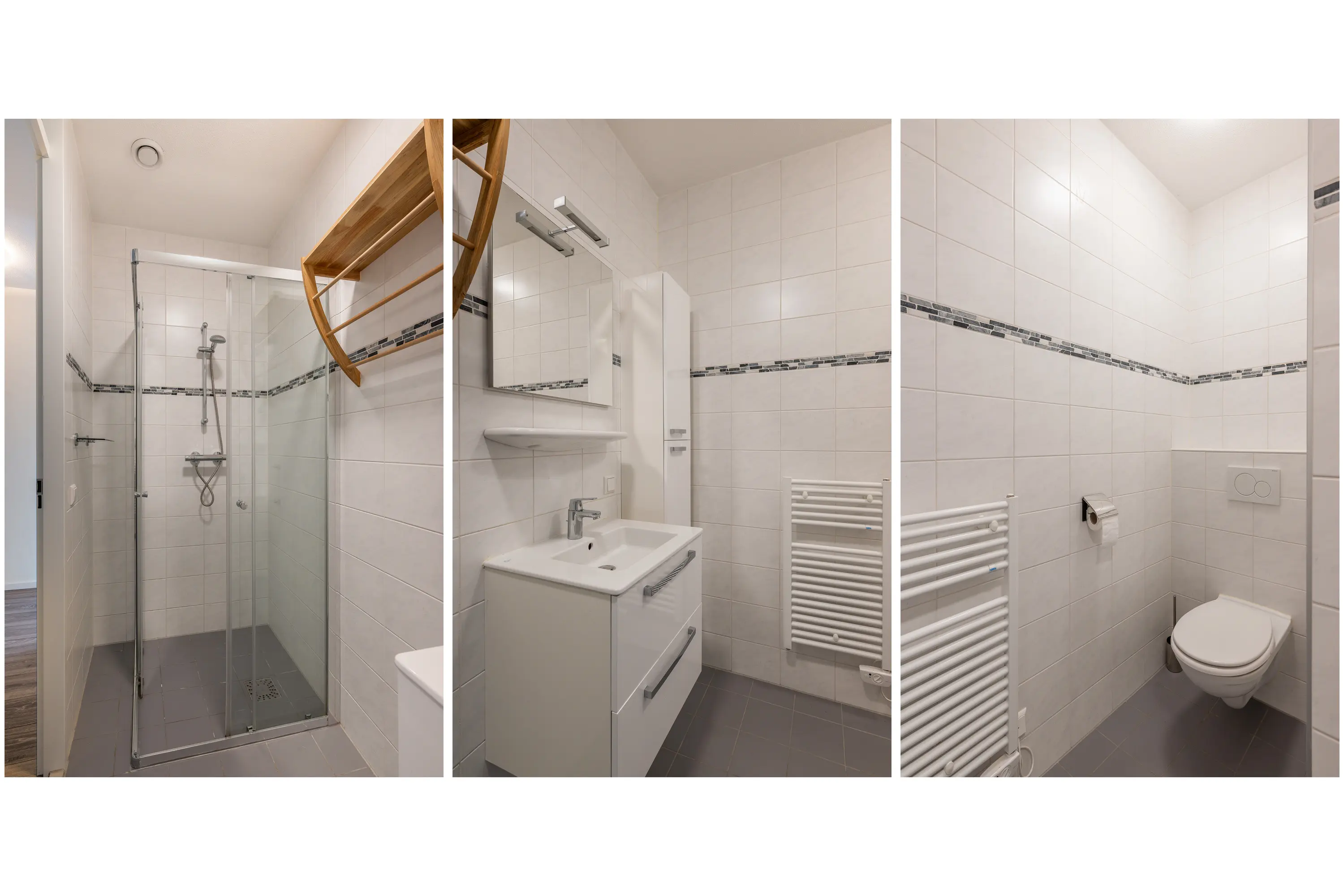 Het appartement is grotendeels afgewerkt met een donkere laminaatvloer. In de badkamer ligt een grijze tegelvloer. De volledig betegelde badkamer is uitgerust met een douche, wastafelmeubel, toilet en elektrische designradiator. Het gehele appartement beschikt over comfortabele vloerwarming/-koeling.