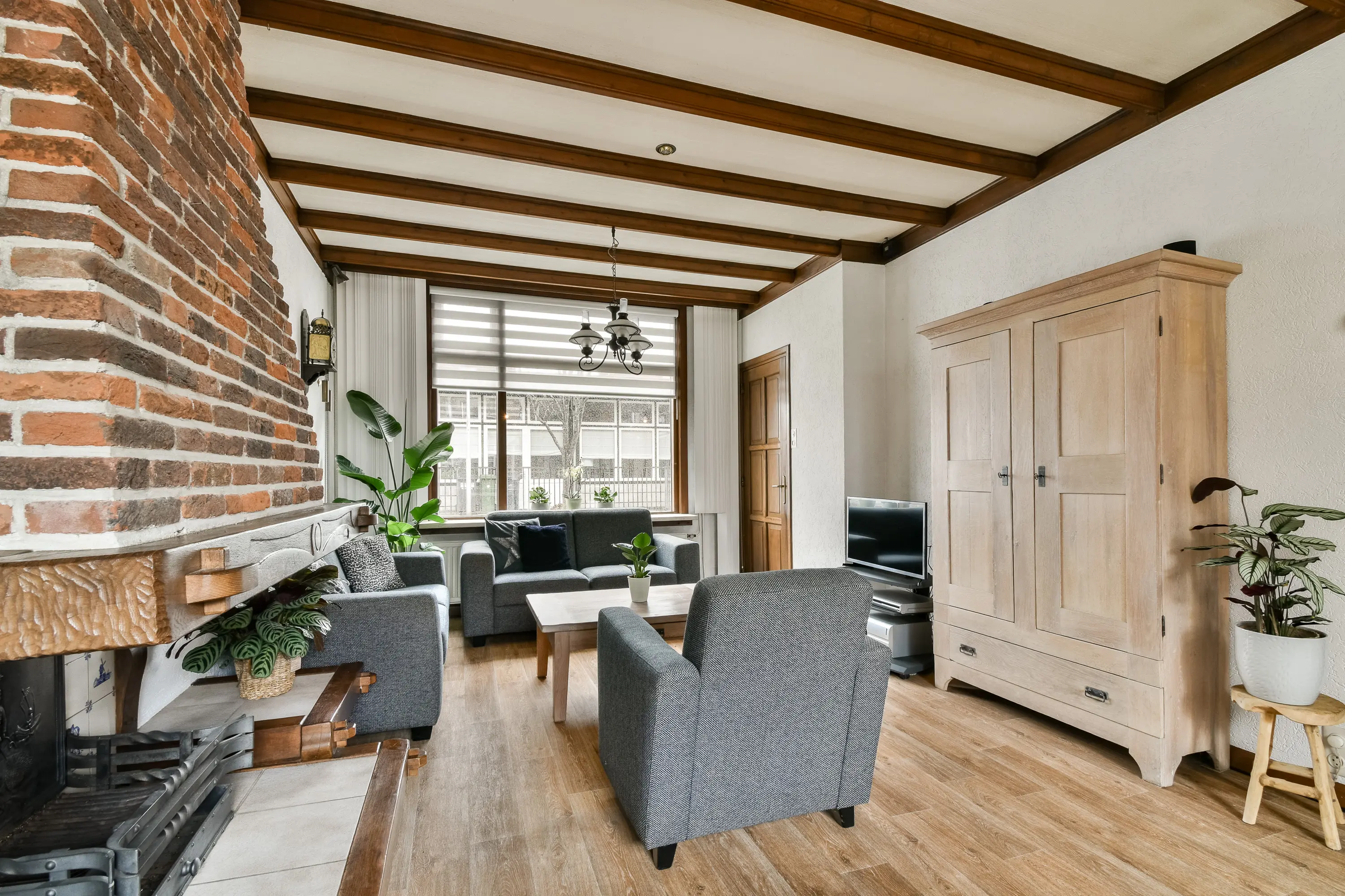 - Woonkamer met sfeervolle gashaard in stenen schouw;