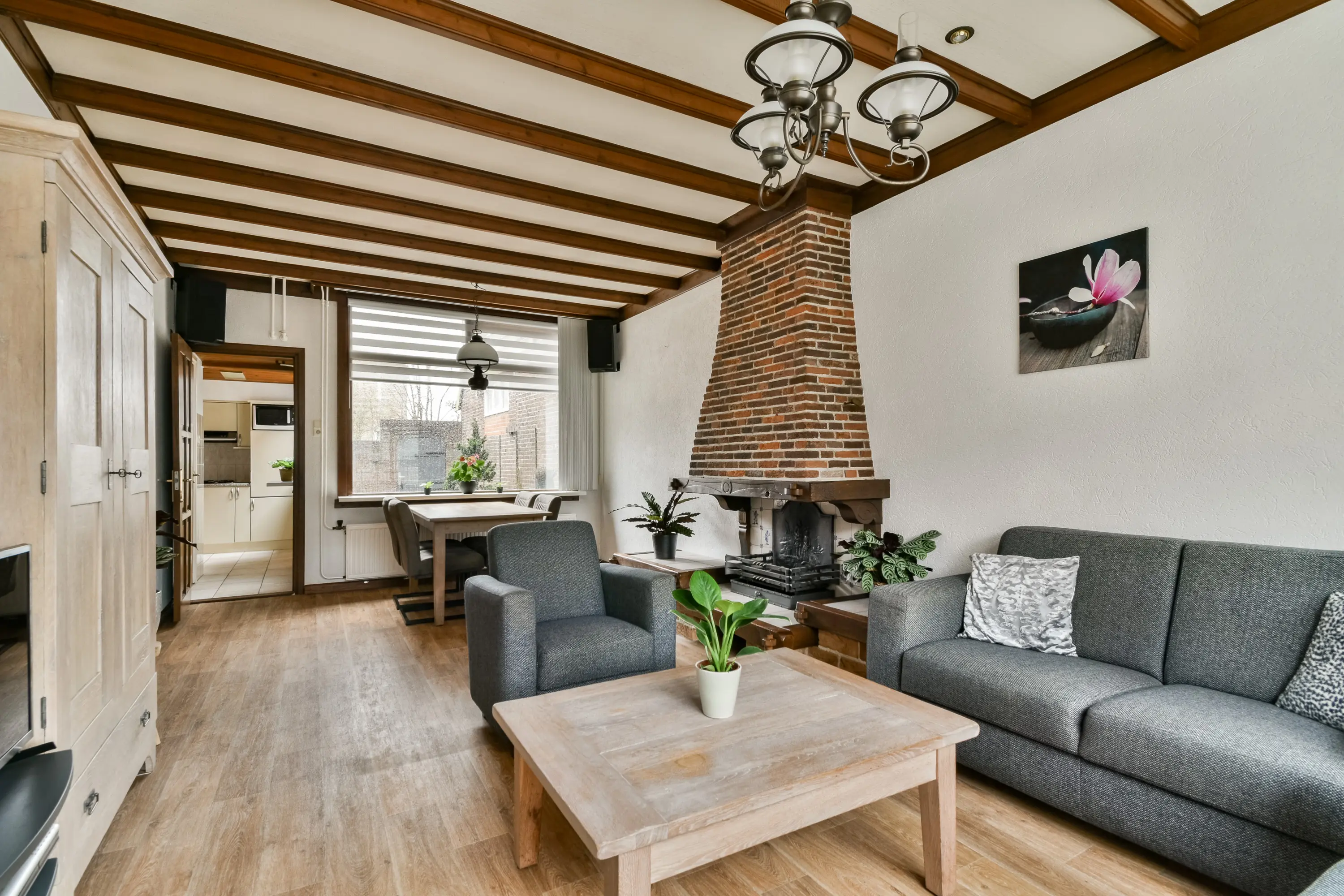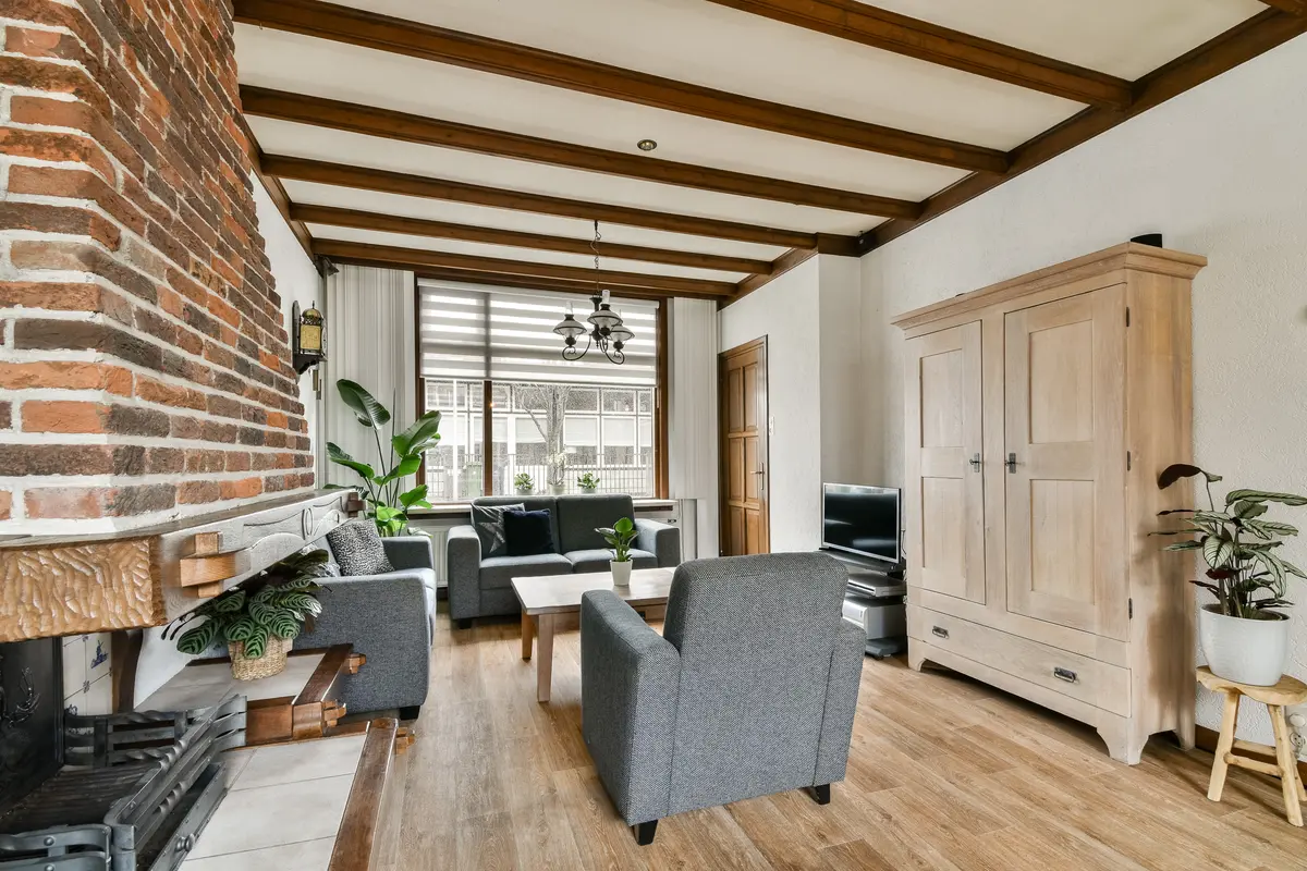 Centraal in de woonkamer bevindt zich een sfeervolle gashaard met stenen schouw.