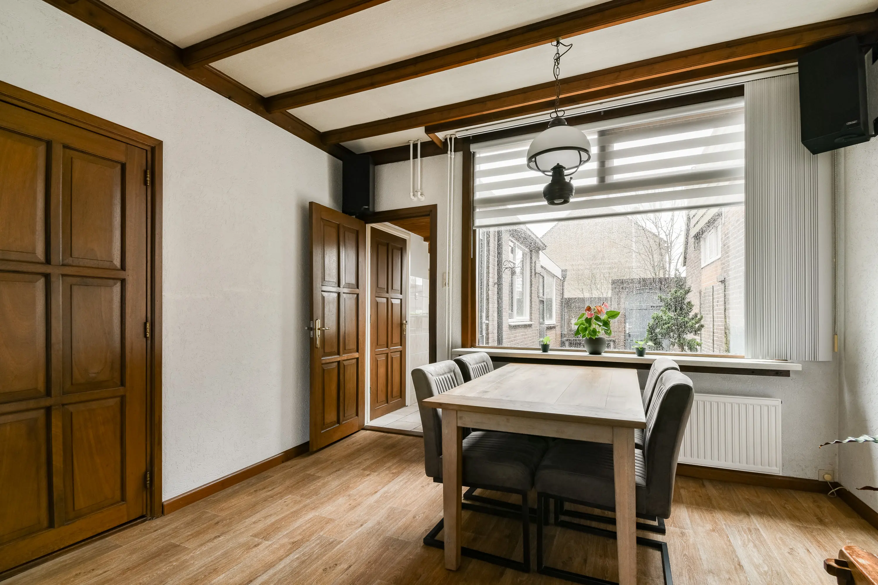 Het betreft een ruime kamer met authentiek balkenplafond en daglicht middels de grote raampartij aan zowel voor- als achterzijde.