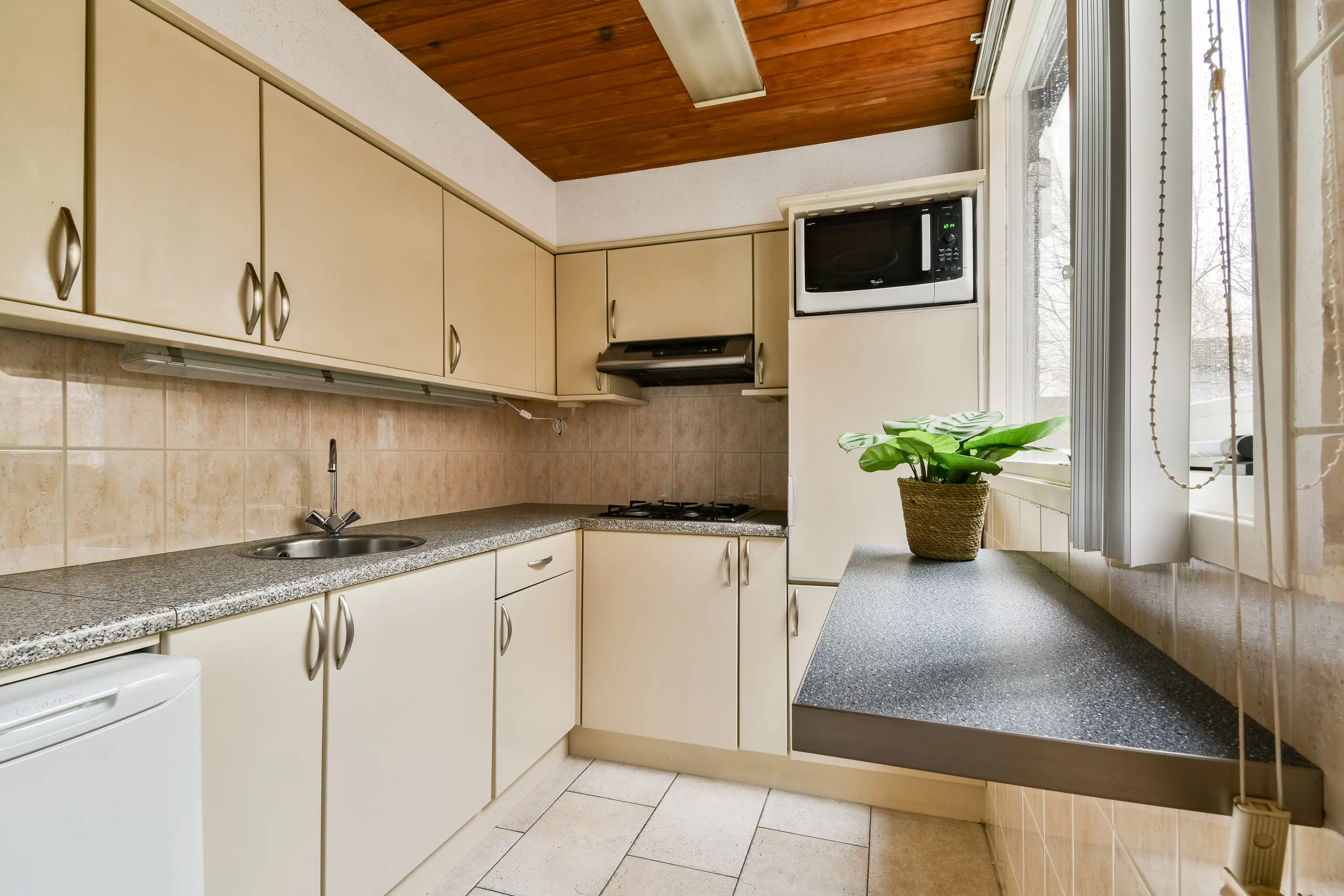 De keuken heeft plavuizen op de vloer en tegels aan de wand. In de L-vormige opstelling bevindt zich onder andere een koelkast, magnetron, 4-pits gasfornuis met afzuigkap en spoelbak met mengkraan.