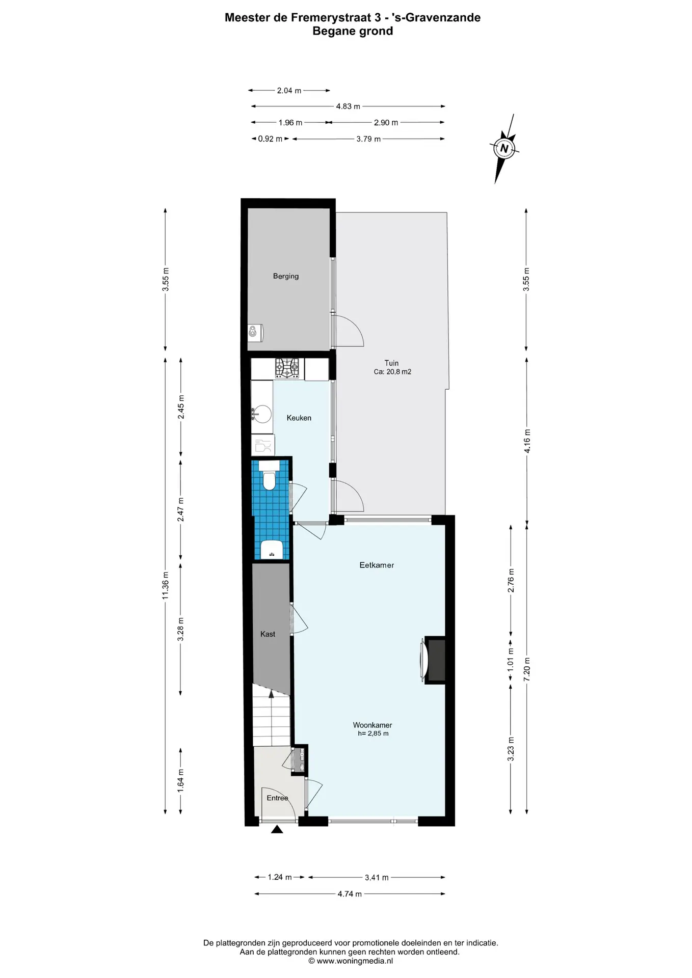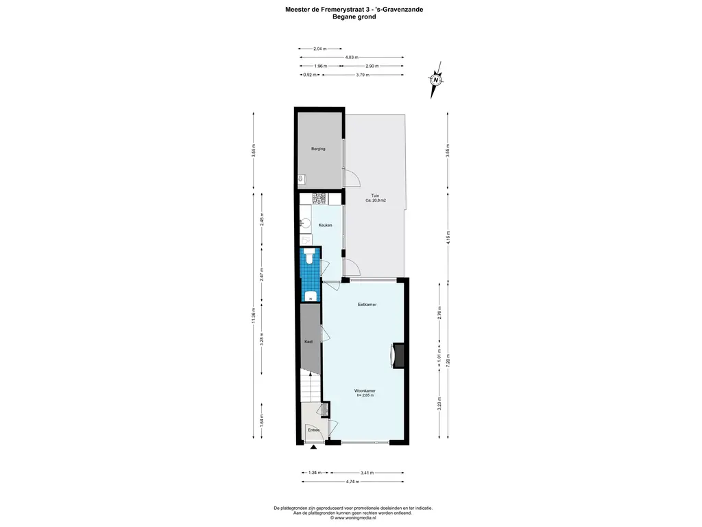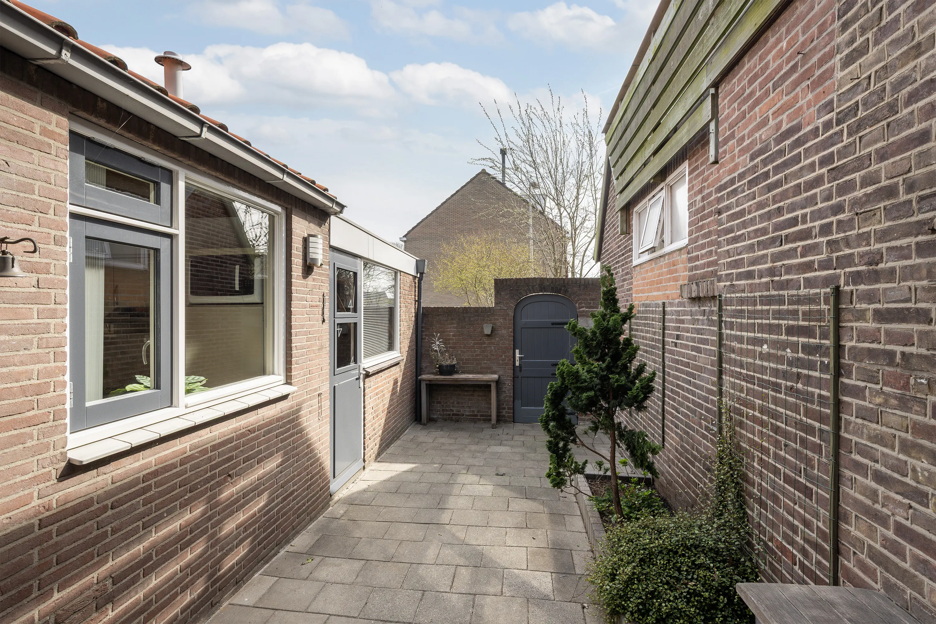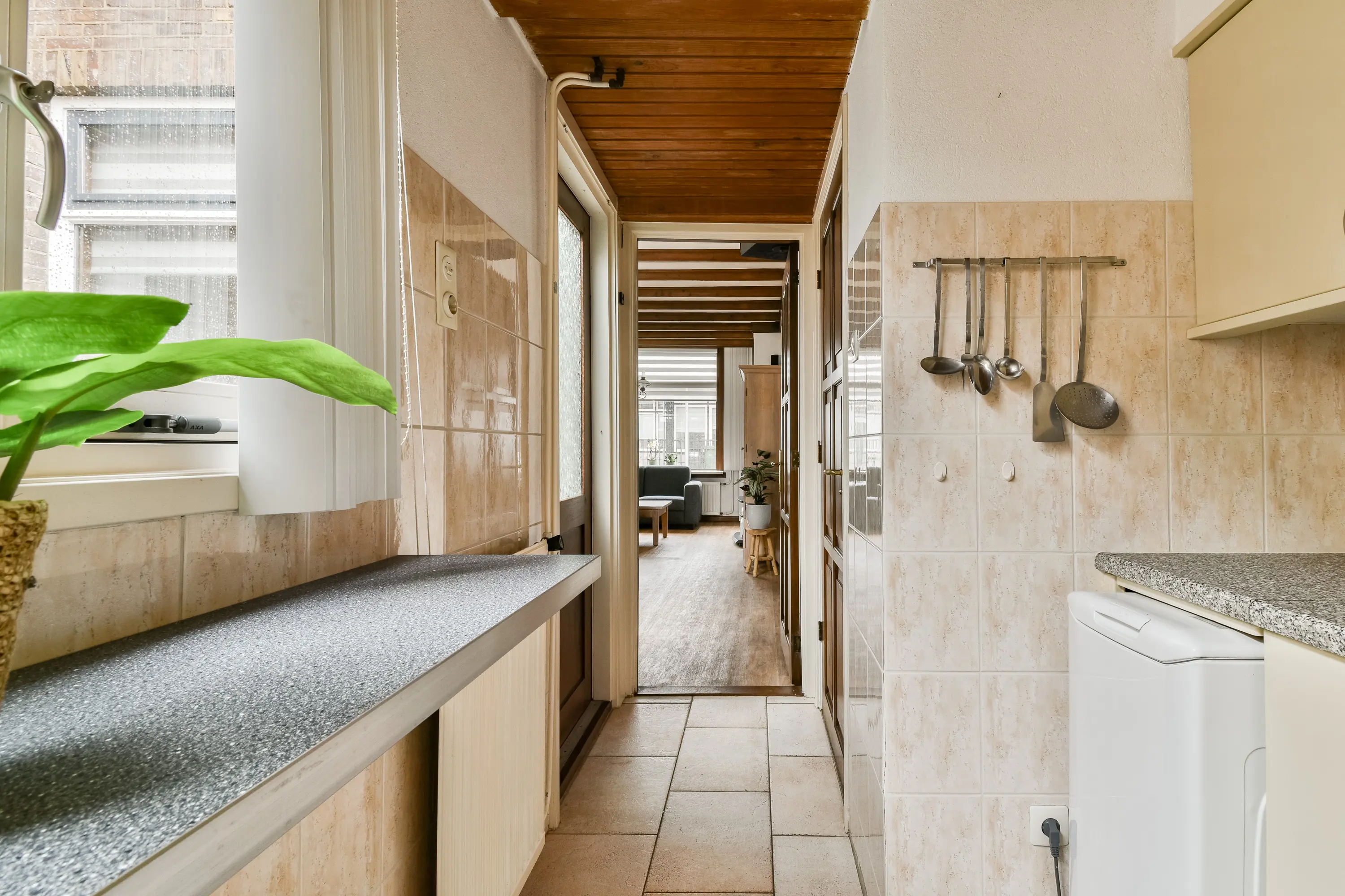 Aan de achterzijde is een dichte keuken gevestigd met toegangsdeur naar de achtertuin.