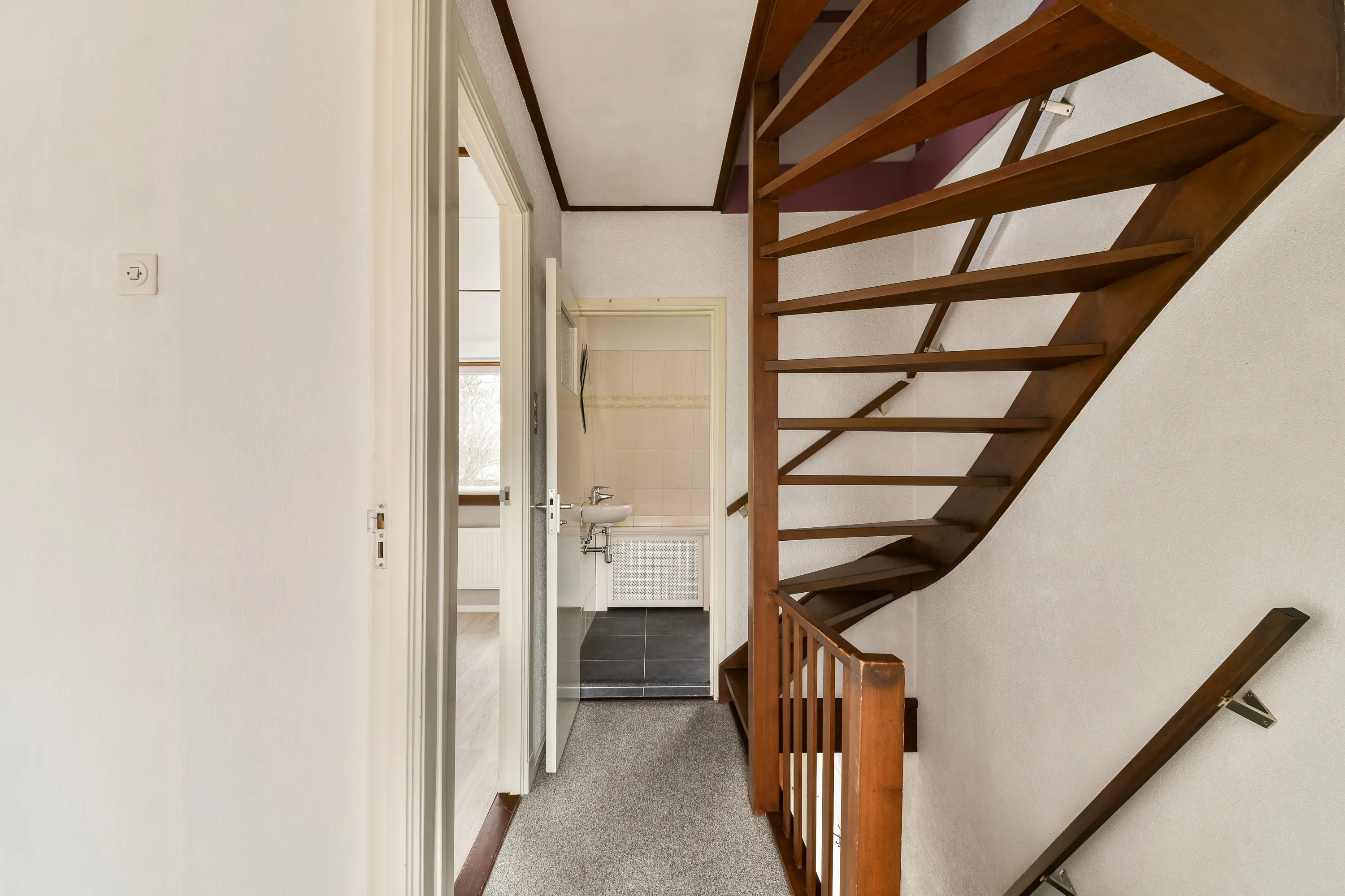 Overloop met toegang tot drie slaapkamers en een badkamer. Twee slaapkamers zijn gevestigd aan de tuinzijde van de woning, een derde en de badkamer aan de voorzijde.