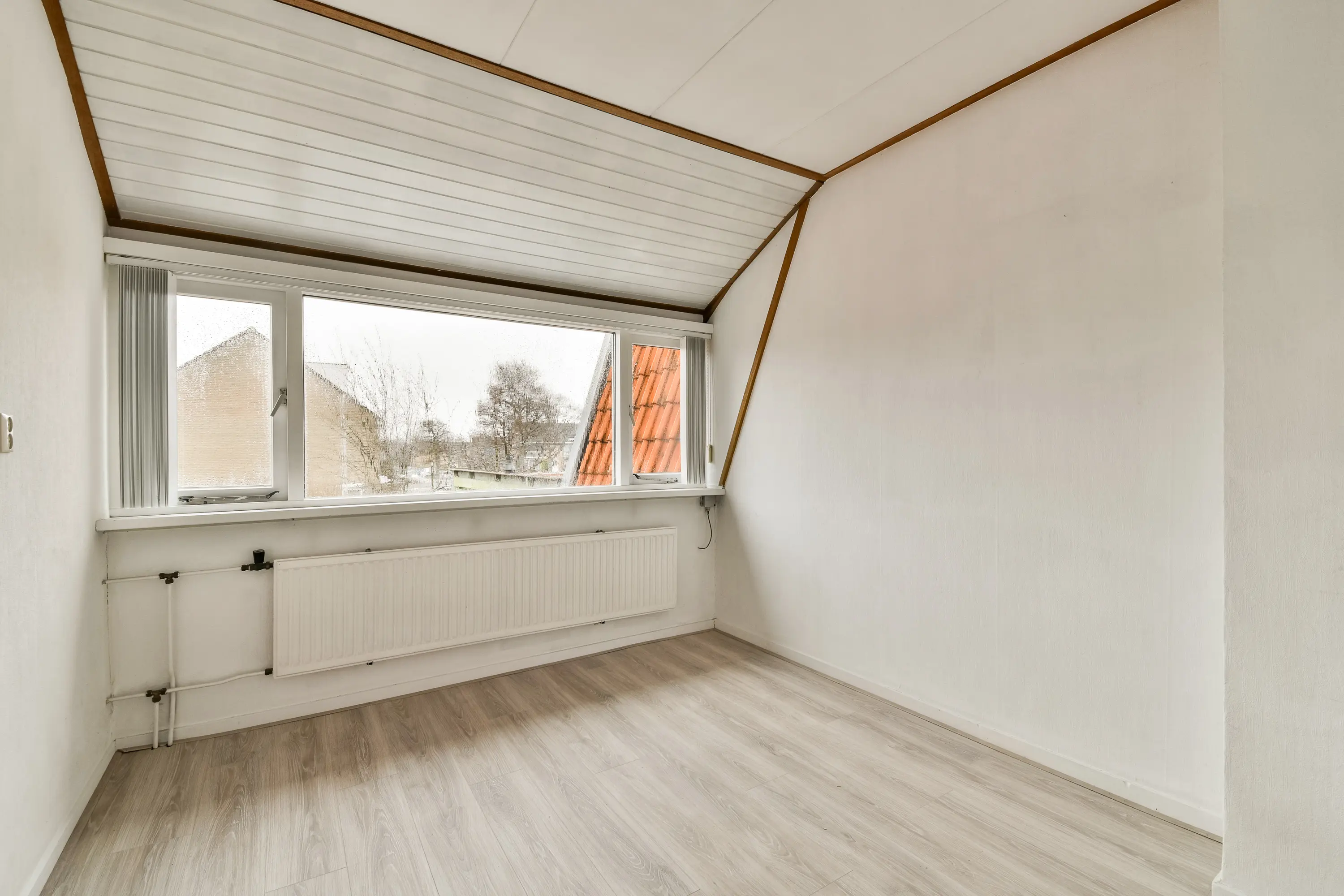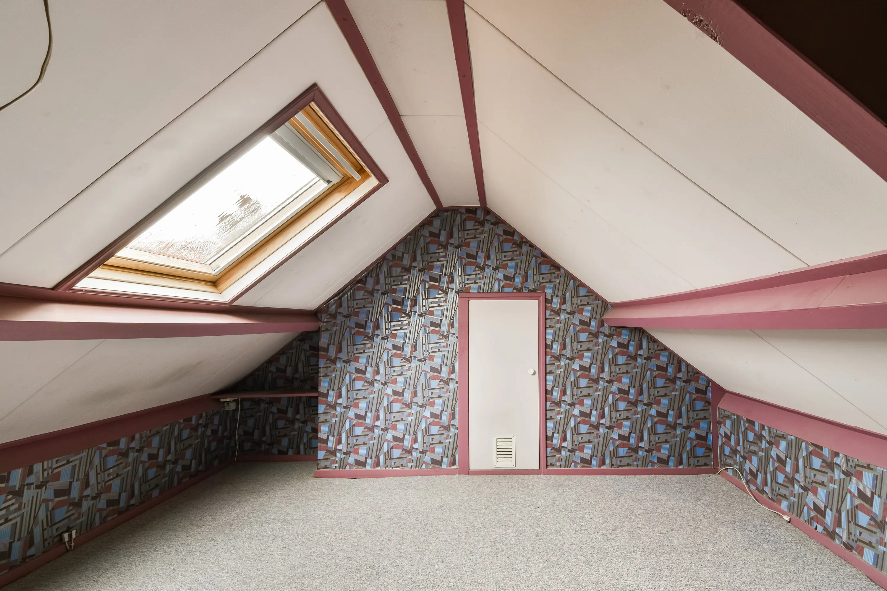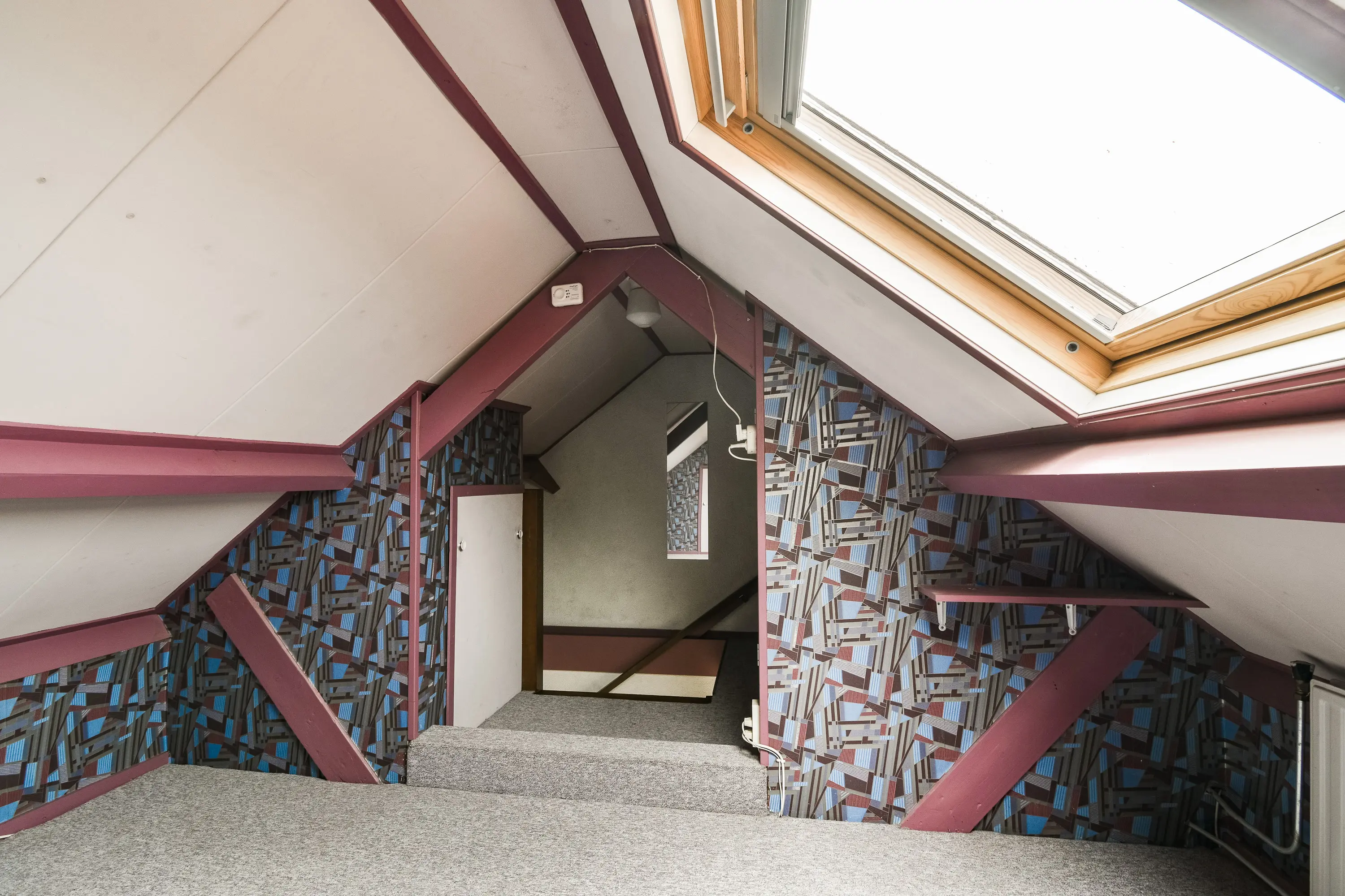 Hier is een vierde (slaap-)kamer met groot dakraam en extra bergruimte achter een houten schot.