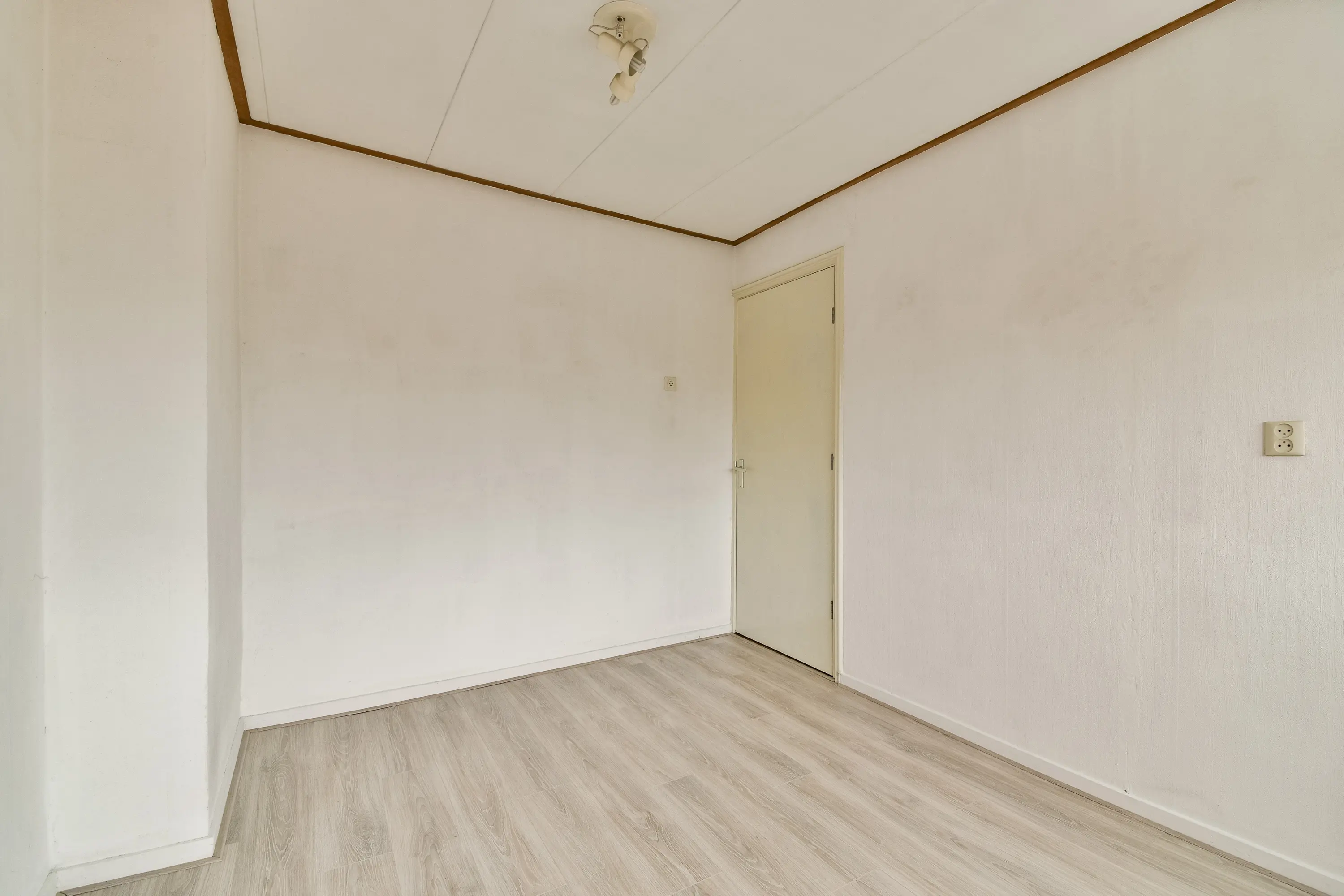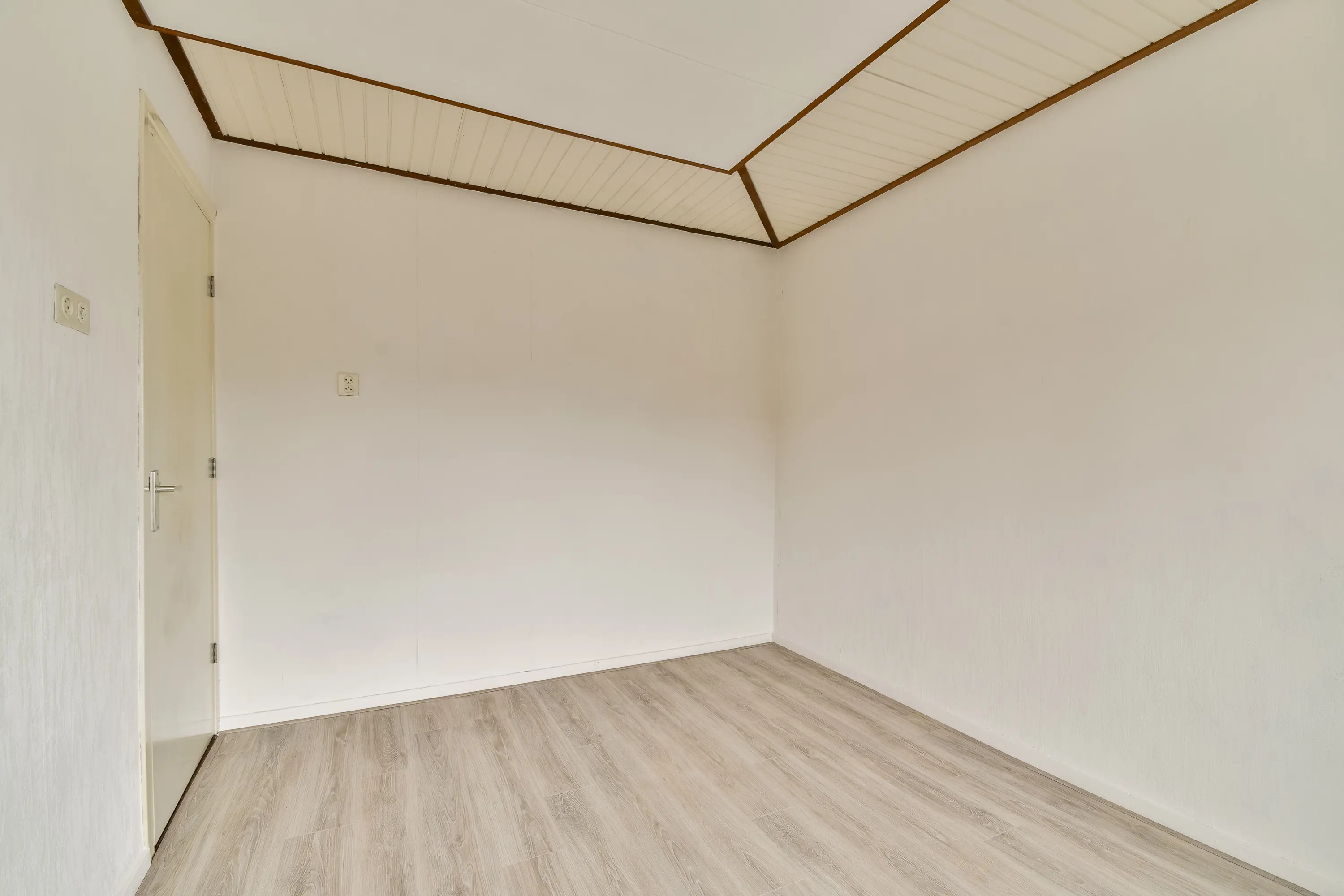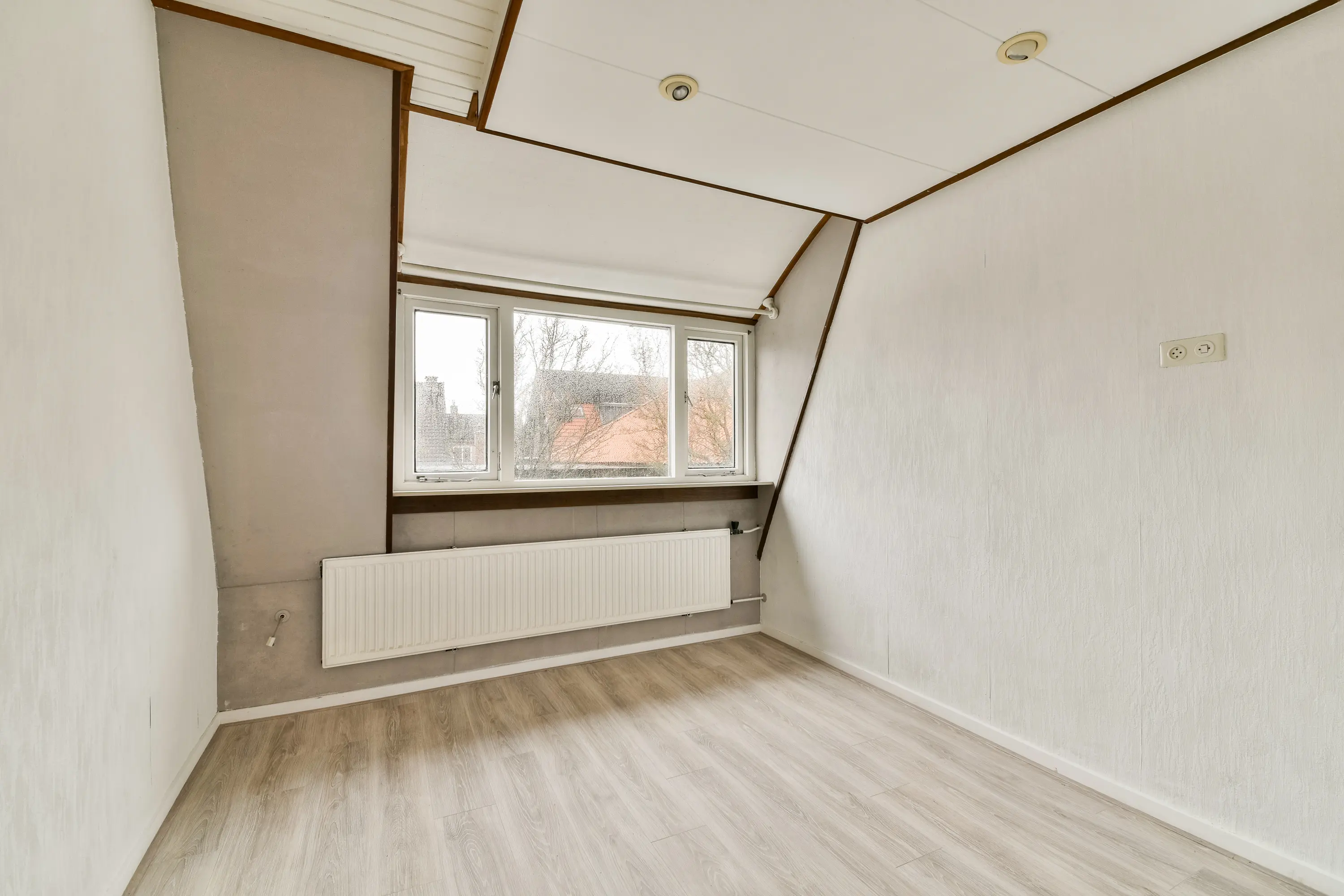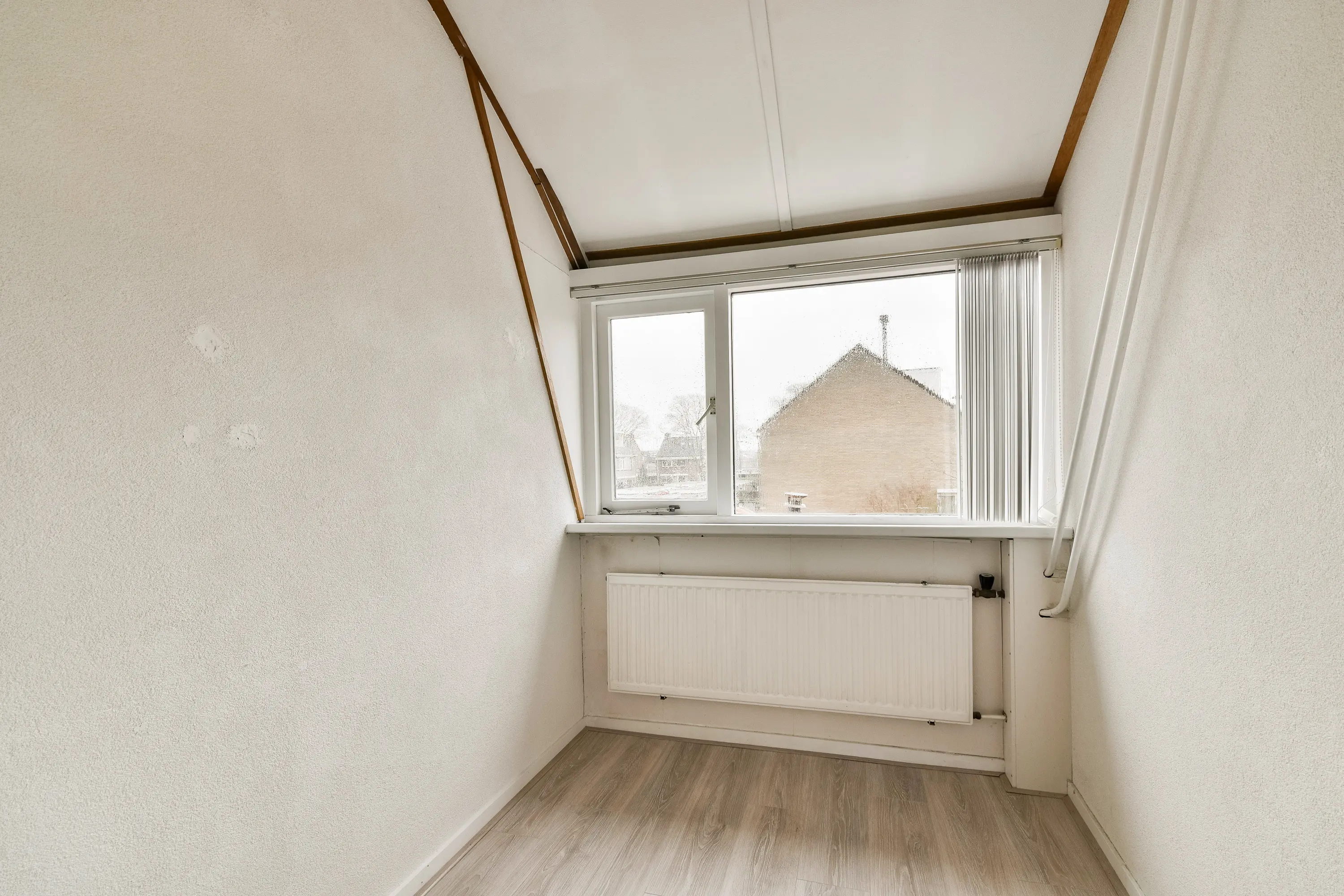 Hier is een vierde (slaap-)kamer met groot dakraam en extra bergruimte achter een houten schot.