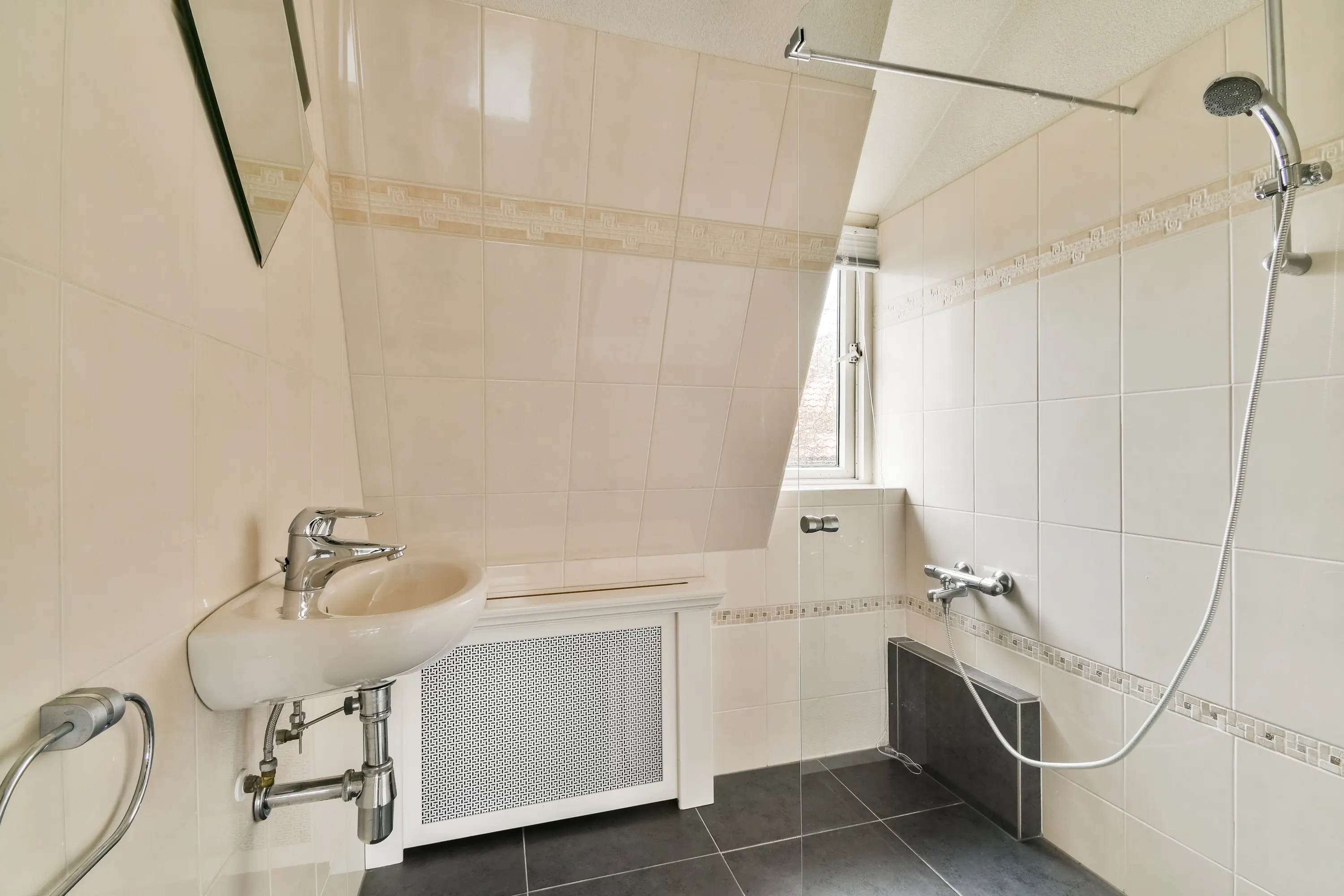 De badkamer is volledig betegeld en ingericht met een douche en wastafel.