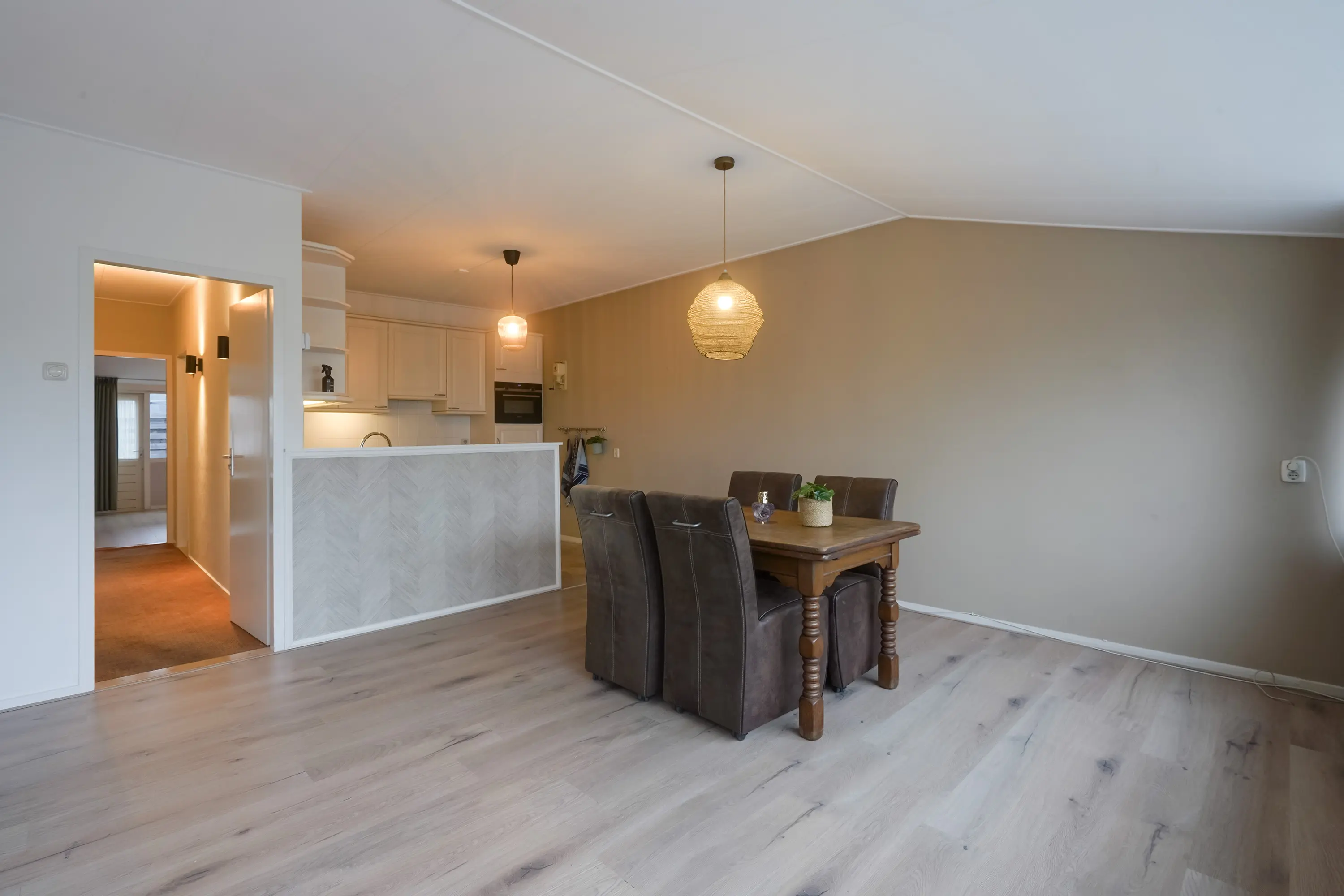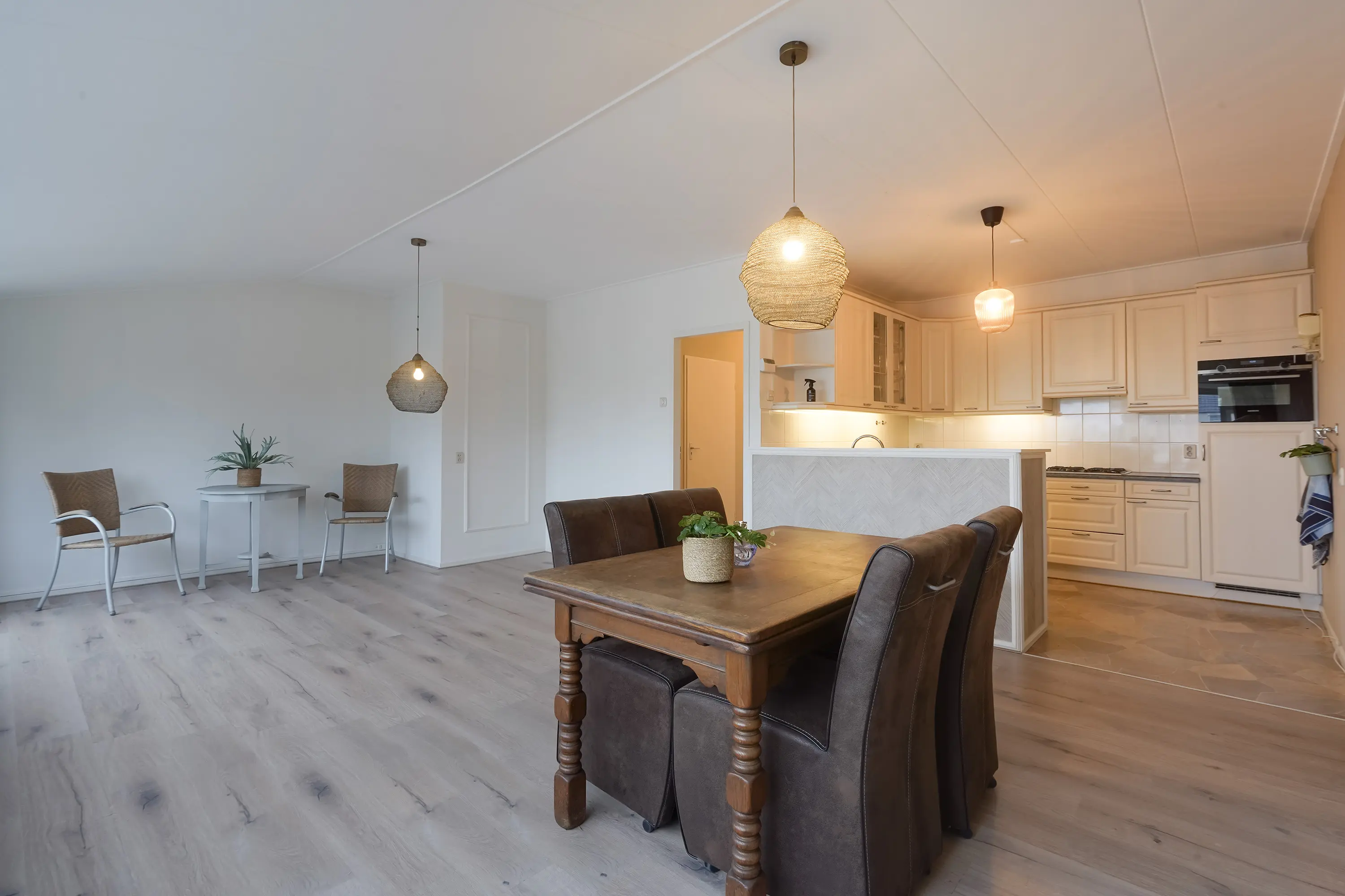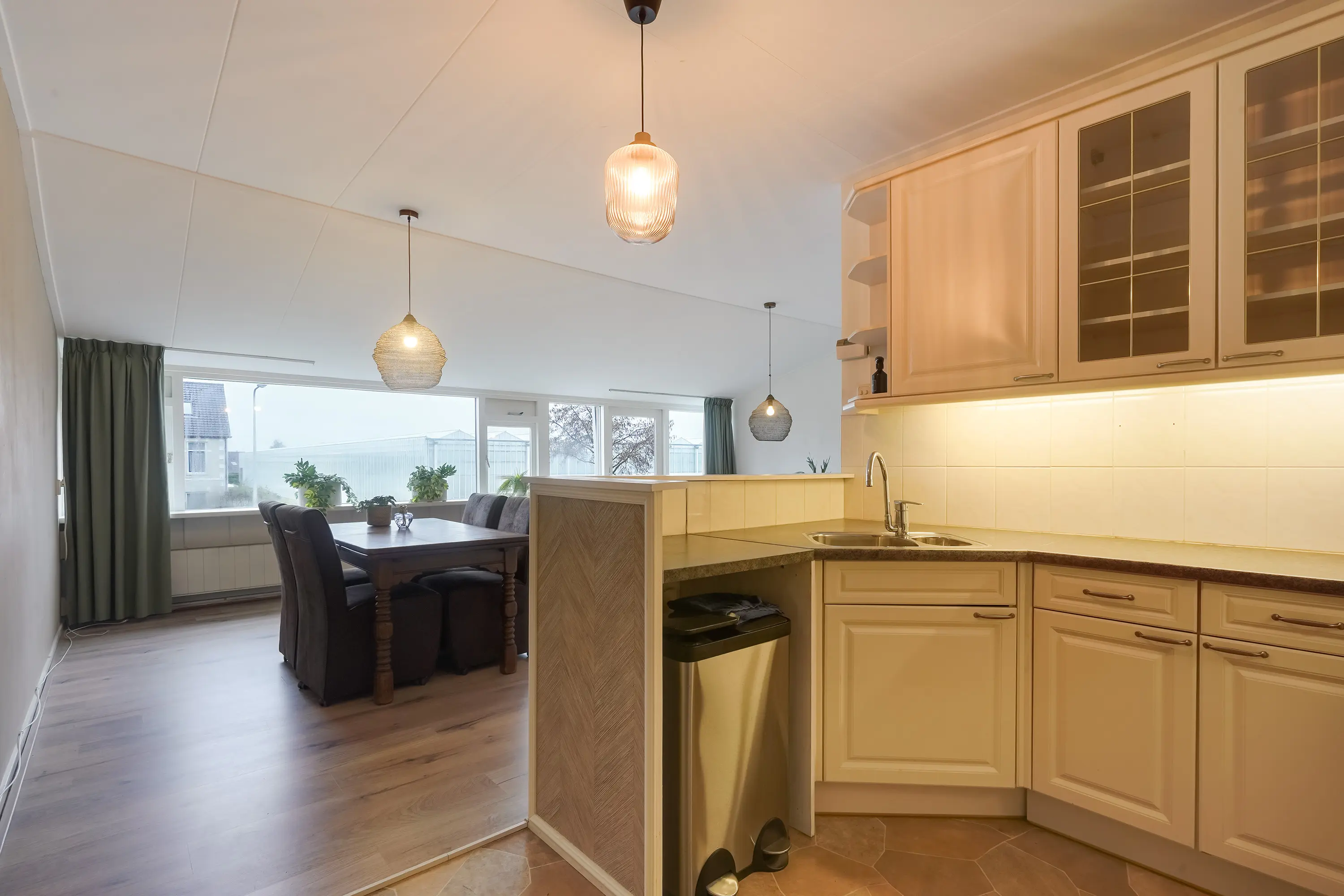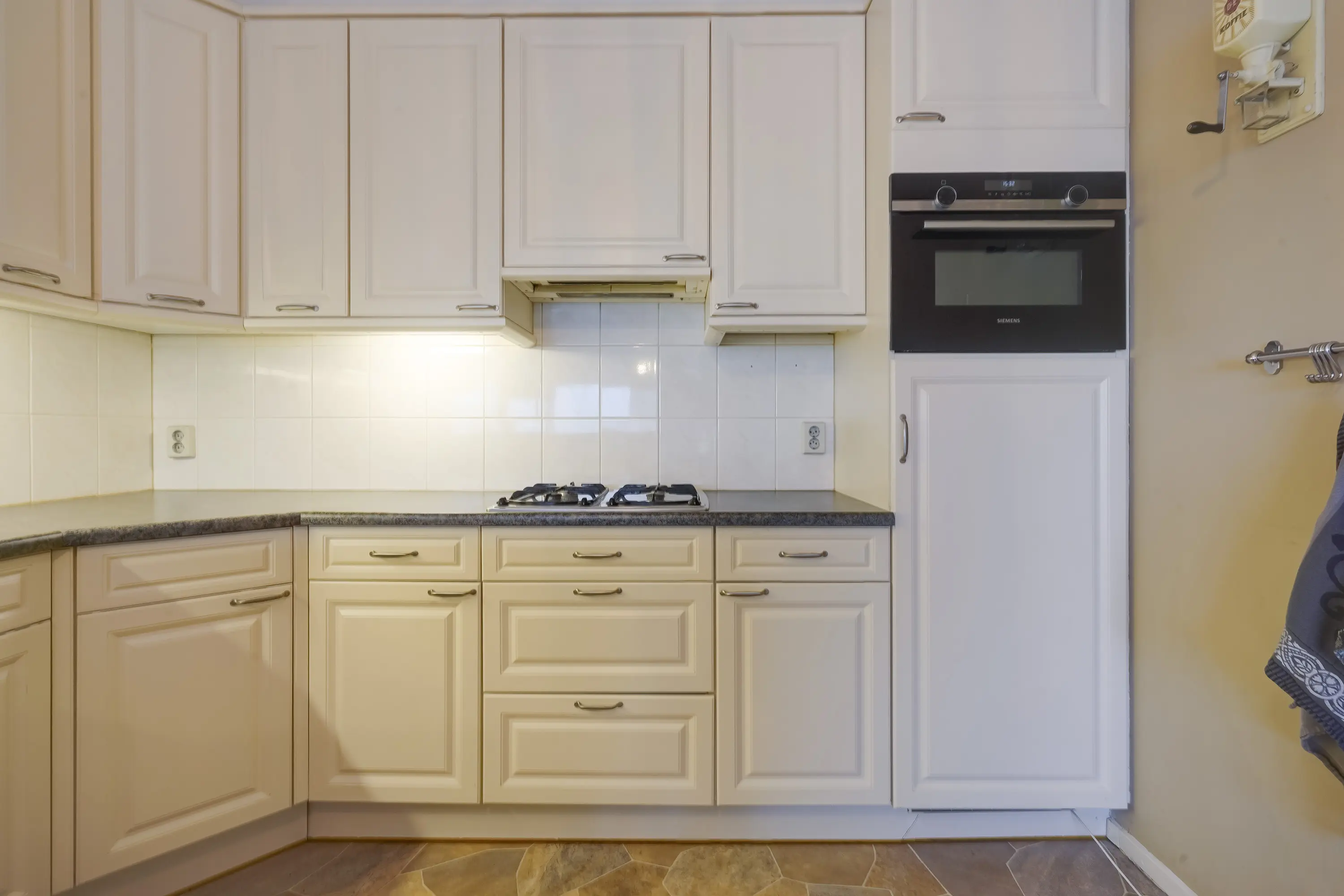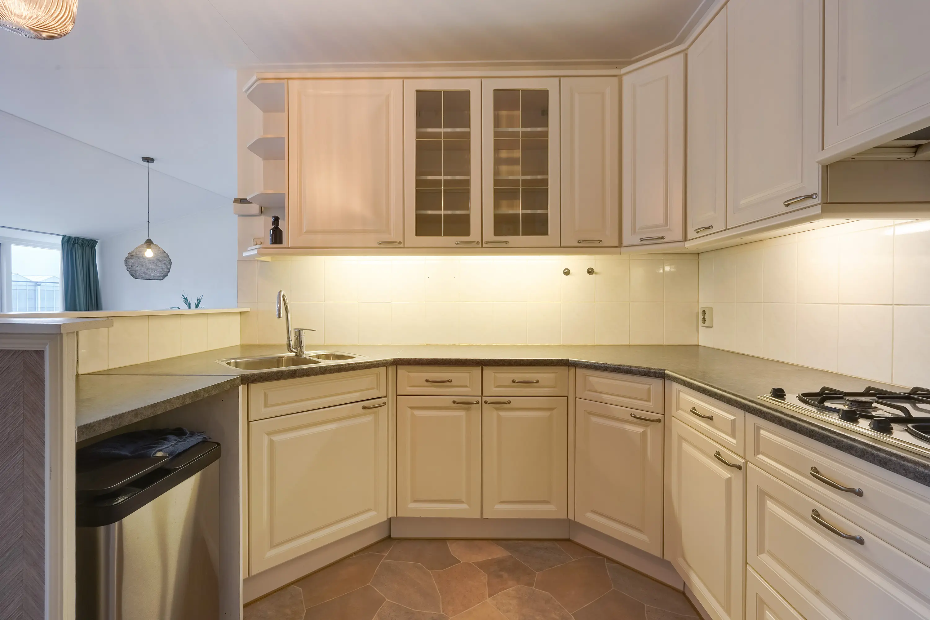 Hal met deur naar de woonkamer aan de voorzijde met balkon v.v. rolluik. Open keuken in hoekopstelling v.v. anderhalve spoelbak met mengkraan, kunststof werkblad, 4-pits gascomfort, afzuigkap, combi-oven, koelkast met vriesvak en diverse lades en kasten.