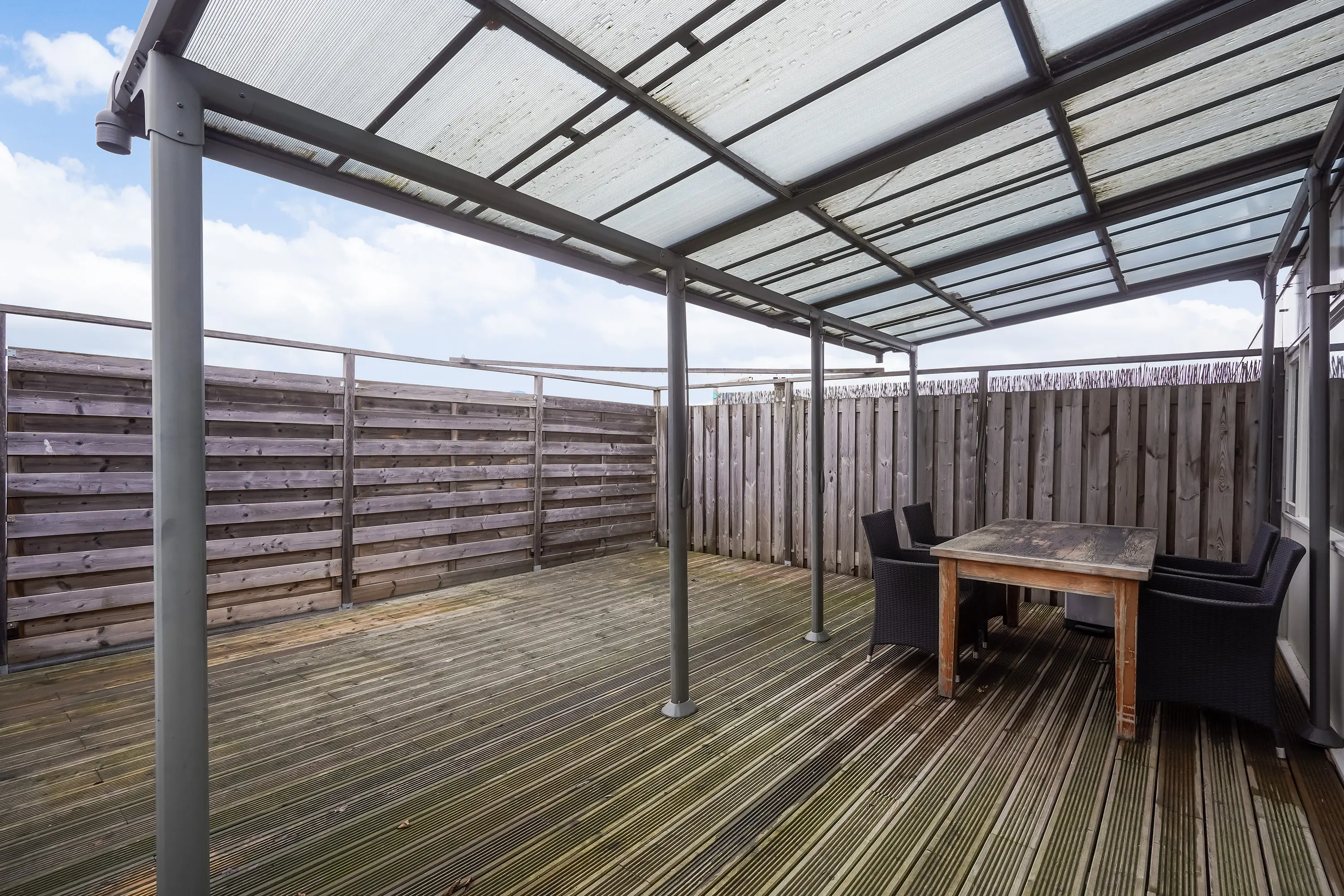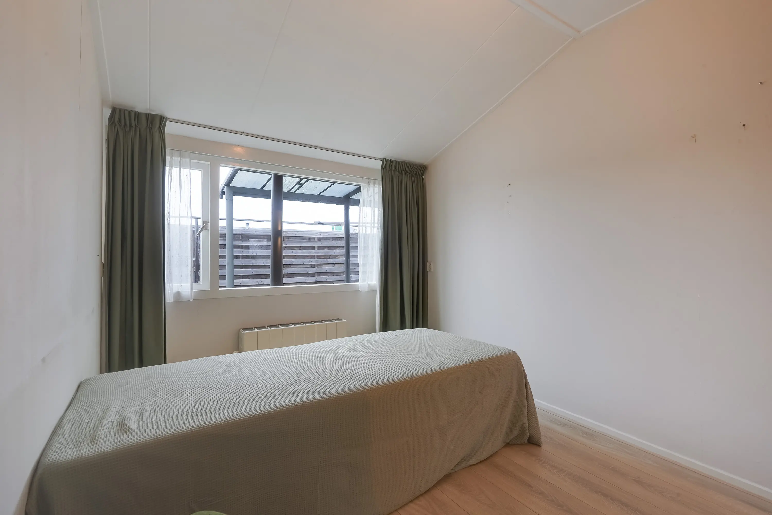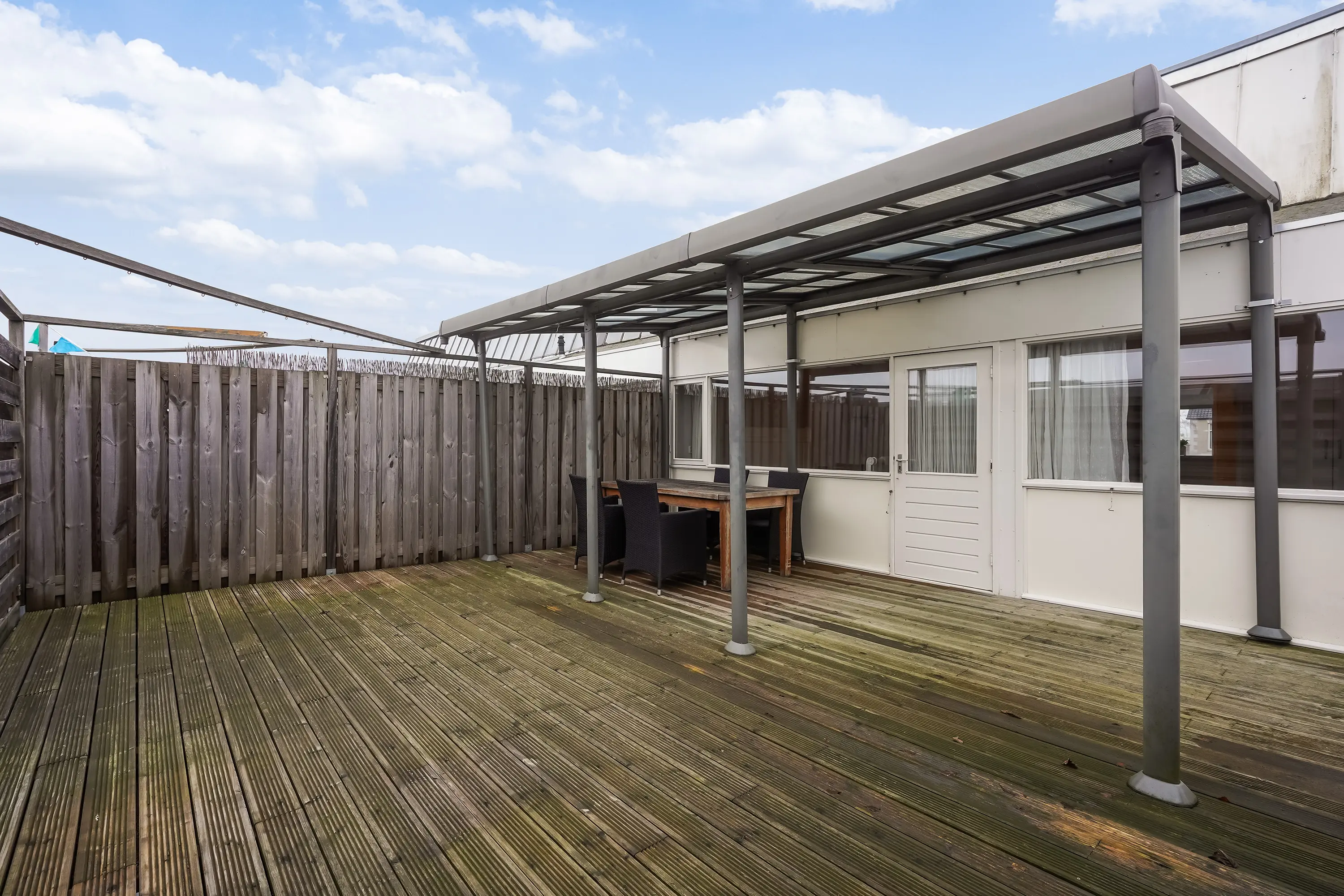 Twee slaapkamers aan de achterzijde, waarbij de hoofdslaapkamer een deur naar het achtergelegen en overkapte dakterras heeft.