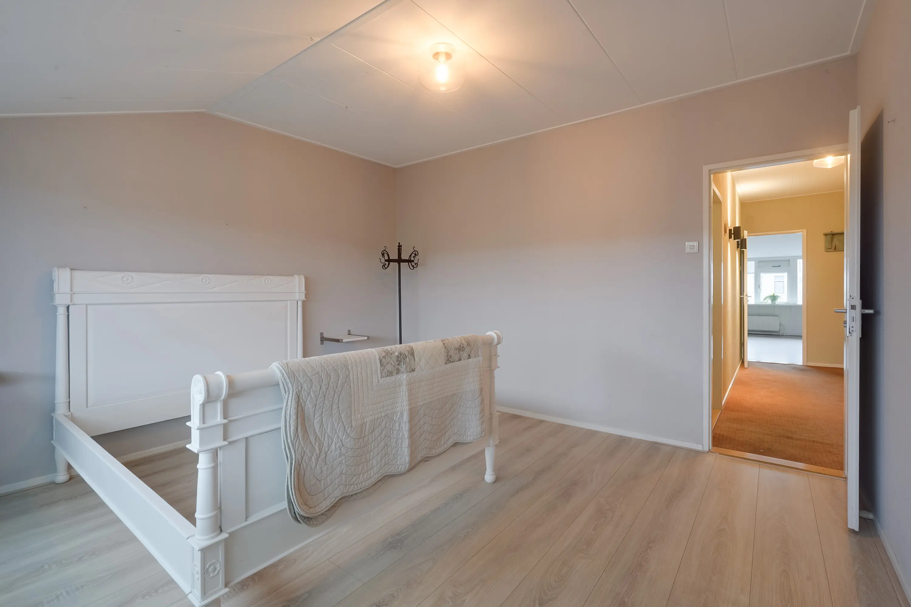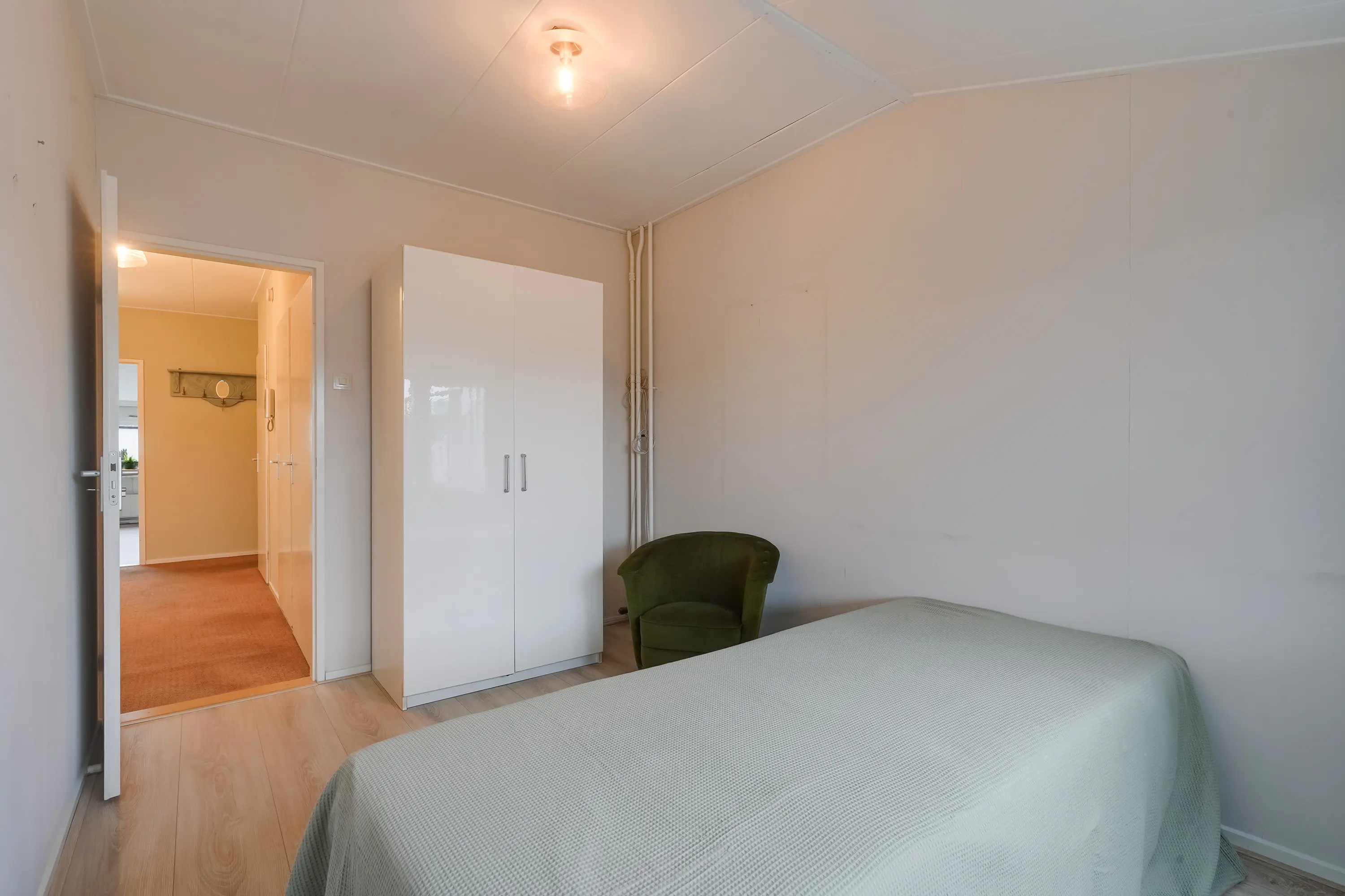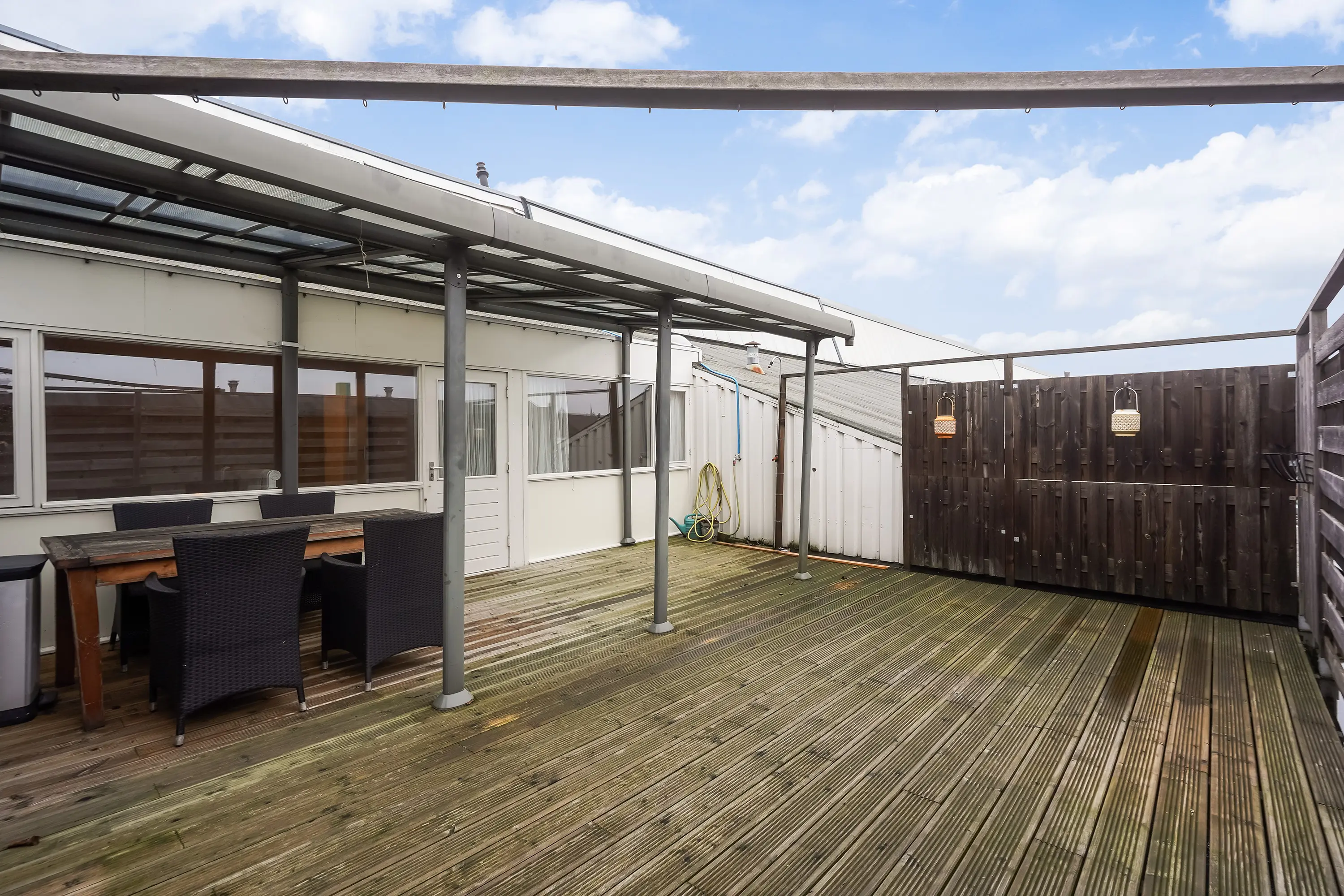 Twee slaapkamers aan de achterzijde, waarbij de hoofdslaapkamer een deur naar het achtergelegen en overkapte dakterras heeft.