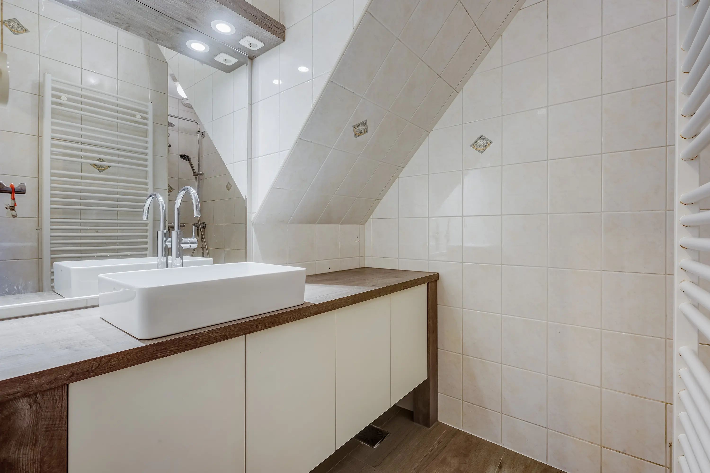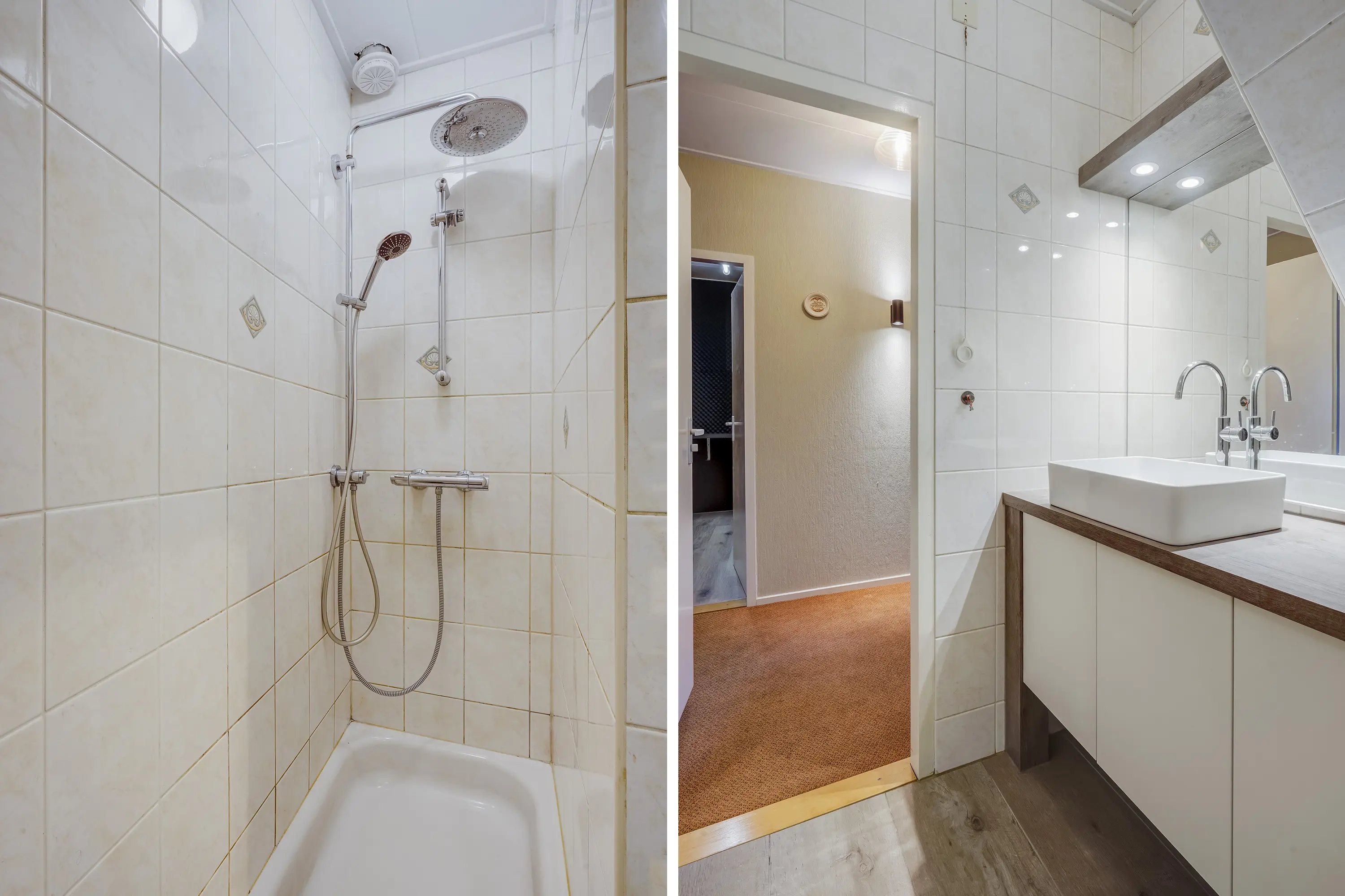 Badkamer met wastafelmeubel v.v. mengkraan, designradiator, douchebak met thermostaatkraan en neutrale betegeling.