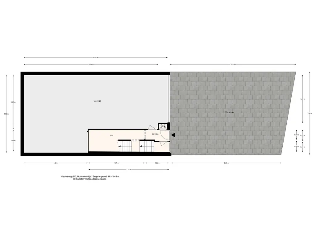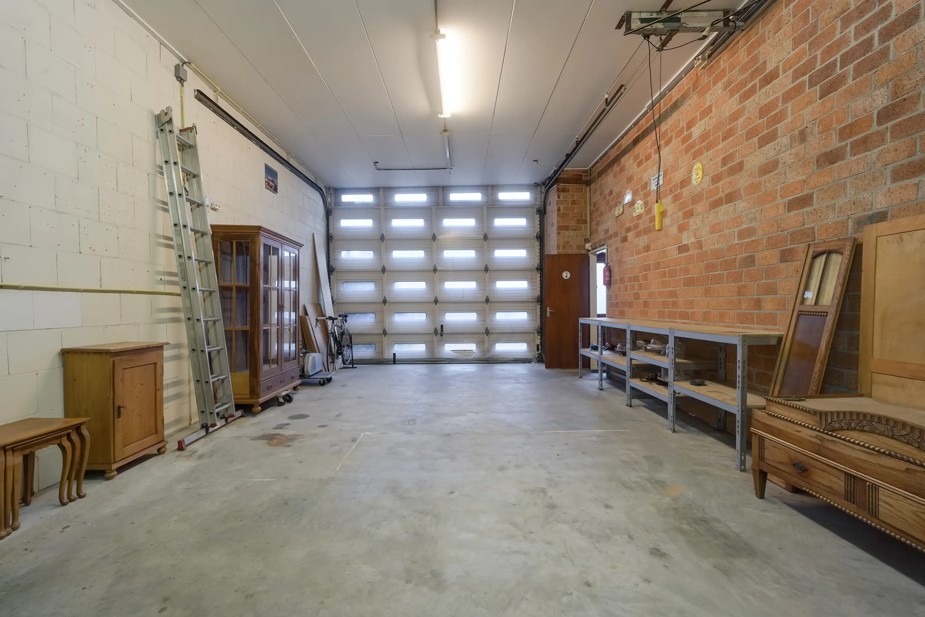 Entree met loopdeur en naastgelegen elektrische overheaddeur, aparte deur met extra gang en toegang tot de bedrijfsruimte met betonvloer v.v. vloerverwarming.